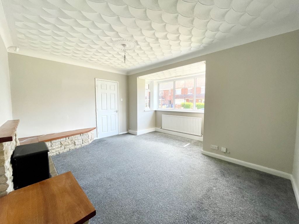 The front-facing lounge features a large bay window allowing plenty of natural light to flood the room. A brick feature fire surround creates a focal point, complemented by carpeted flooring, radiator and single pendant light fitting.