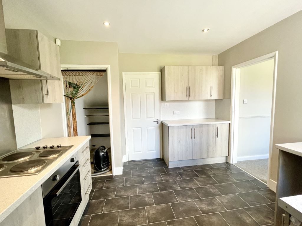 The fully fitted kitchen comprises a range of wall and base units with contrasting worktops and tiled splashbacks. Integrated appliances include an electric oven, hob and extractor hood, with additional space for a fridge/freezer and plumbing for a washing machine. There is a useful understairs storage cupboard, spot lighting and vinyl floor covering. A rear aspect window and door lead into the utility area.