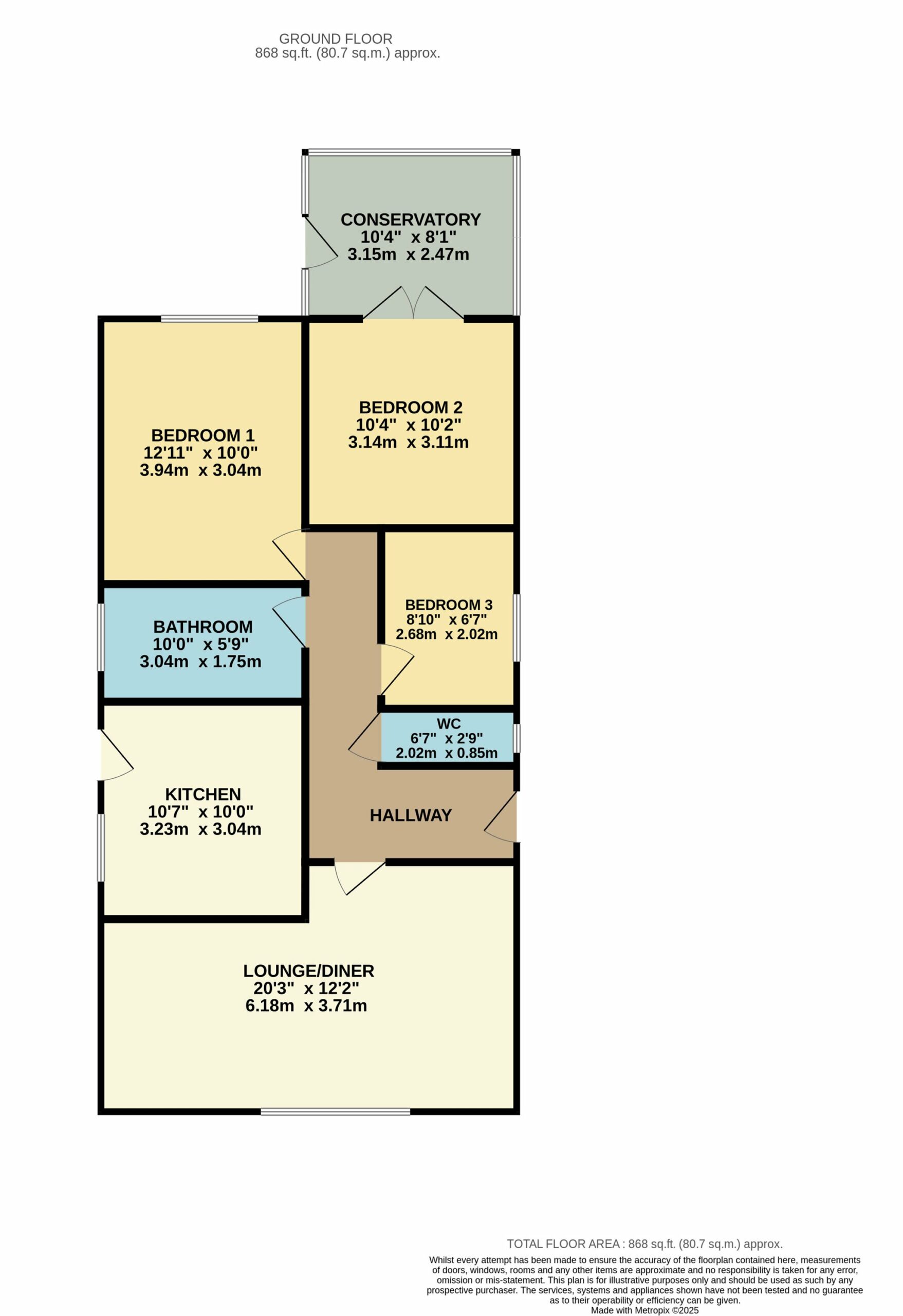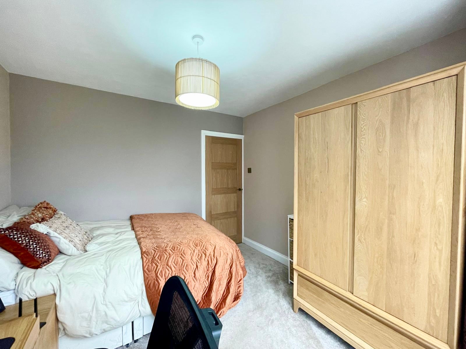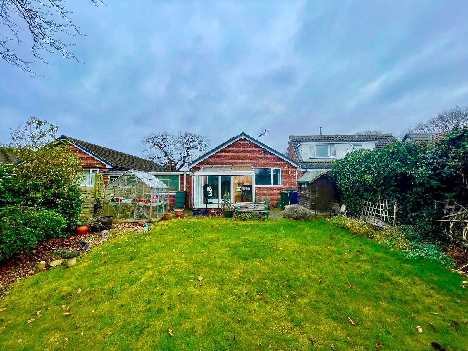 The property offers three bedrooms, providing flexibility for families, downsizers or home-working buyers. The principal bedroom is positioned to the rear of the bungalow and features fitted carpet, radiator and pendant lighting. Bedroom two is a generous double room with rear-facing French doors opening directly onto the garden, while bedroom three is side facing and ideal as a single bedroom, guest room or home office.