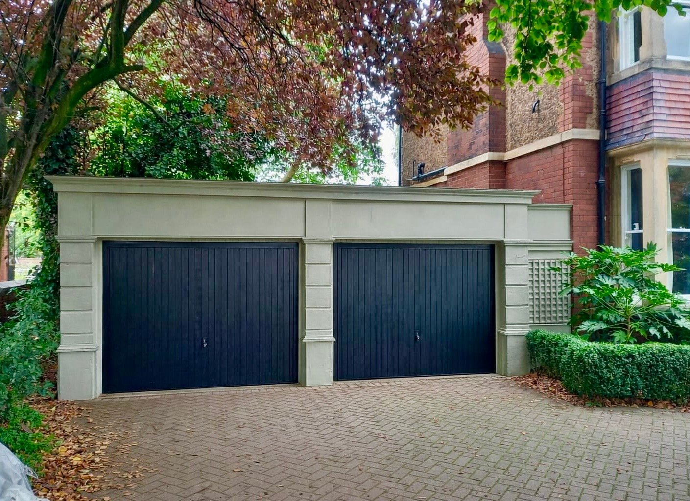 A double garage with one electric door and one manual up-and-over door, power and lighting, and a rear pedestrian door providing access to the garden.