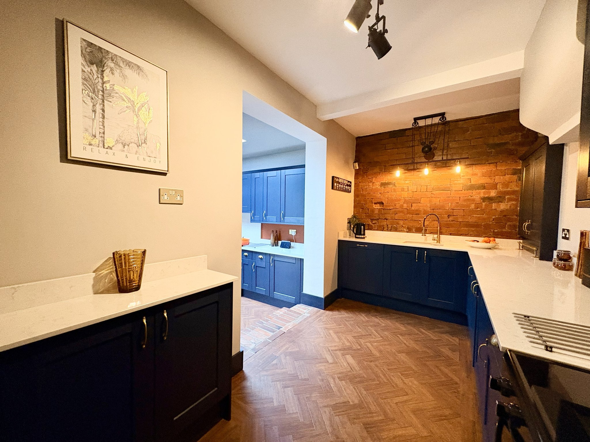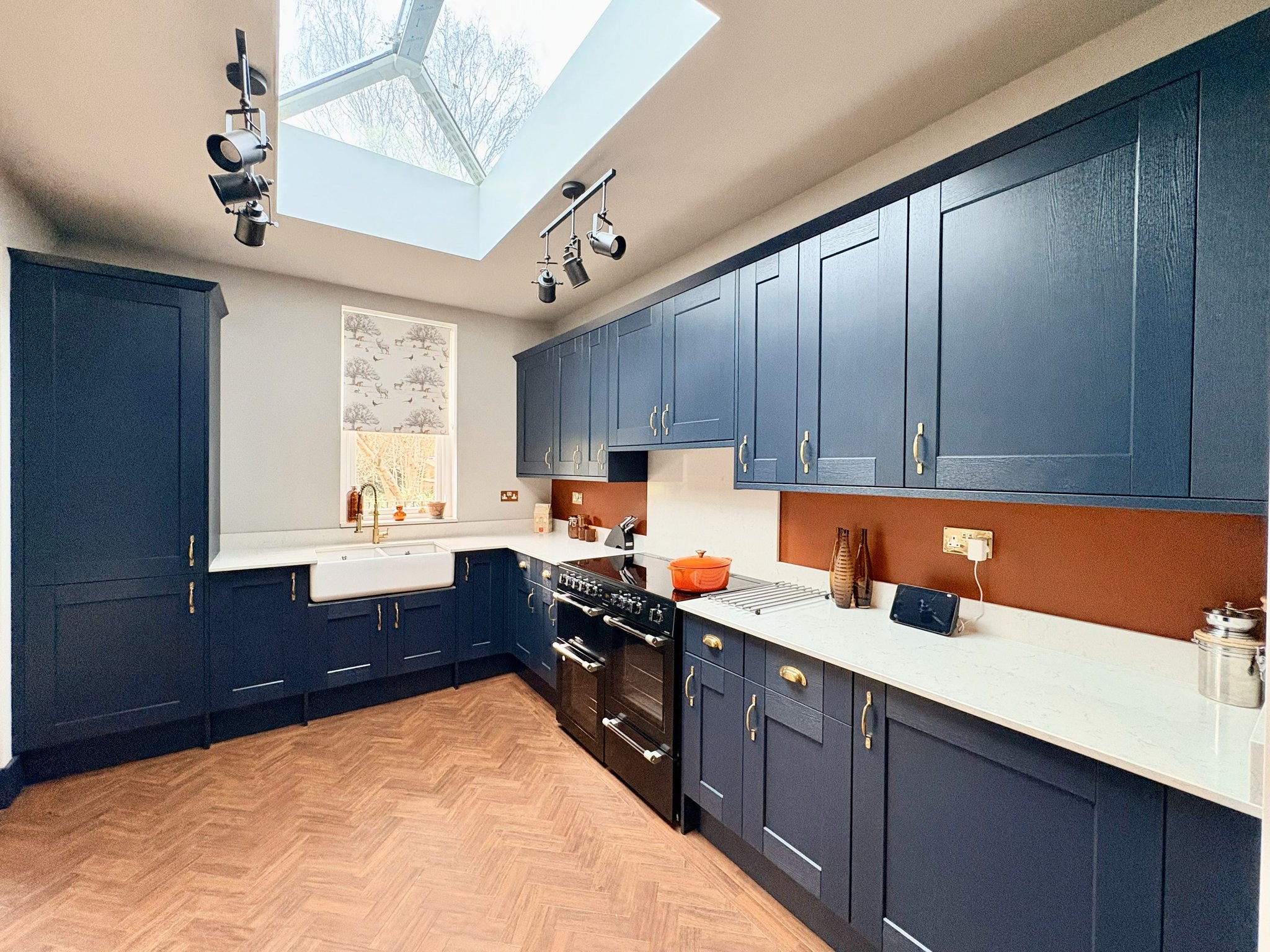 The beautifully appointed L-shaped kitchen (installed approx. 2yrs ago) is fitted with an extensive range of shaker-style wall and base units topped with stunning white quartz work surfaces. Features include a double ceramic Belfast sink with mixer tap, space for a double range oven and additional single oven, and integrated fridge, freezer, and dishwasher. Wood-effect Amtico flooring runs throughout, harmonising with the parquet flooring elsewhere on the ground floor. Additional highlights include a useful walk-in pantry area, secondary sink unit, roof lantern flooding the space with natural light, and a rear-facing window overlooking the garden.