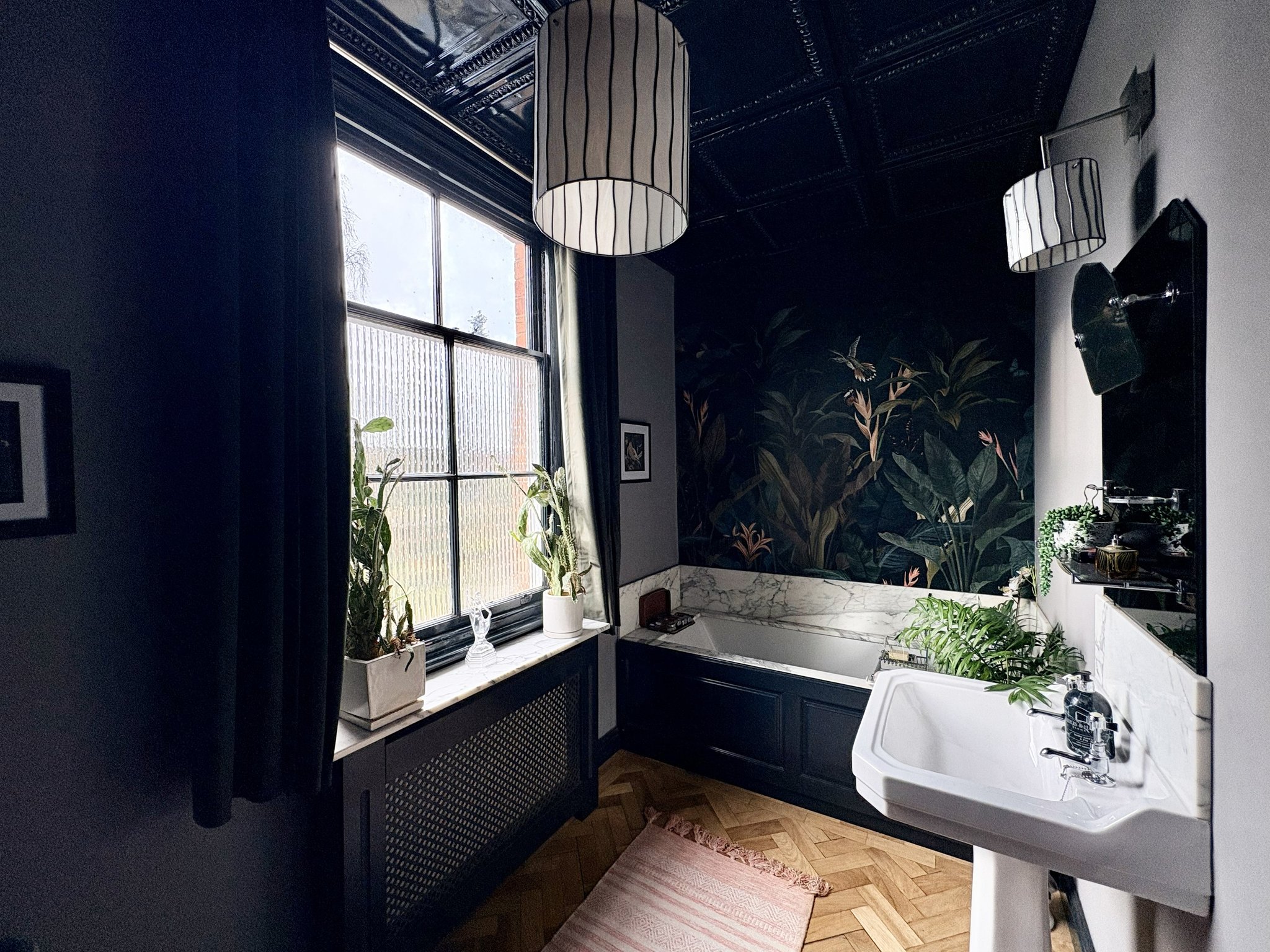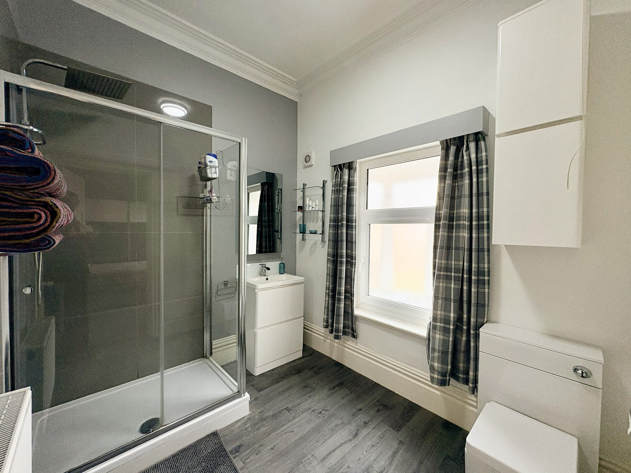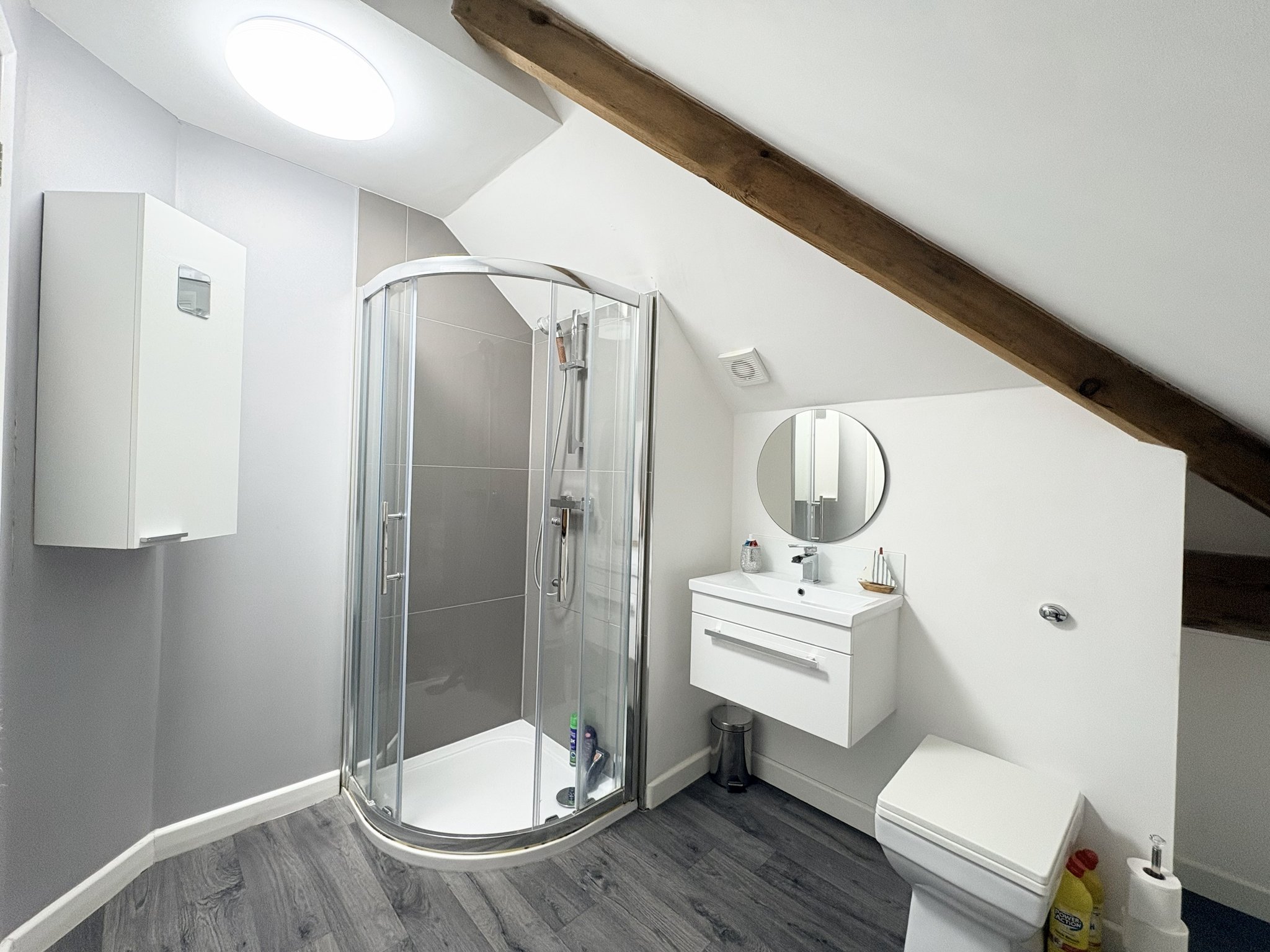Comprising a walk-in shower, wash hand basin, WC, radiator, wood-effect vinyl flooring, part tiling, and pendant lighting.