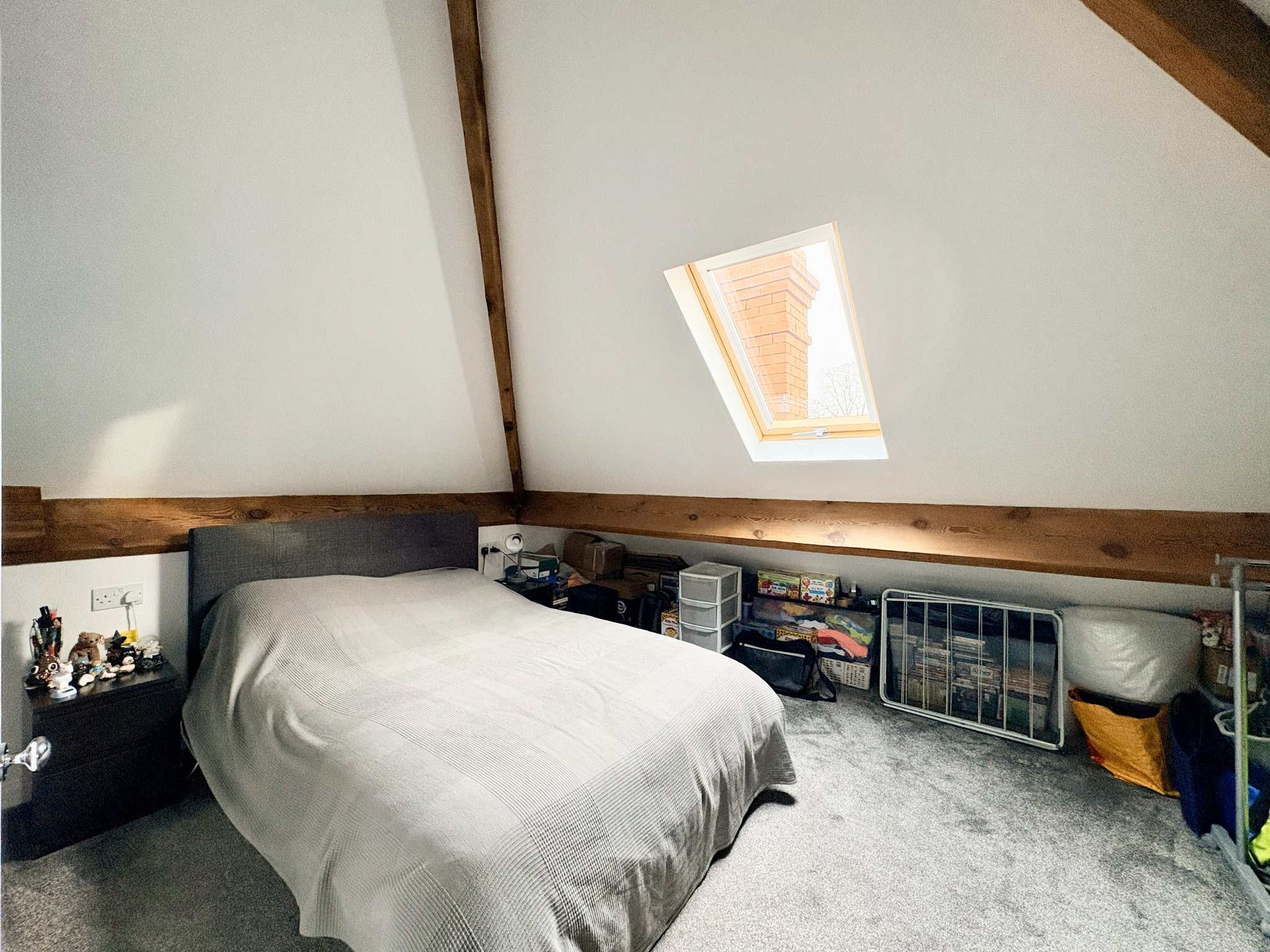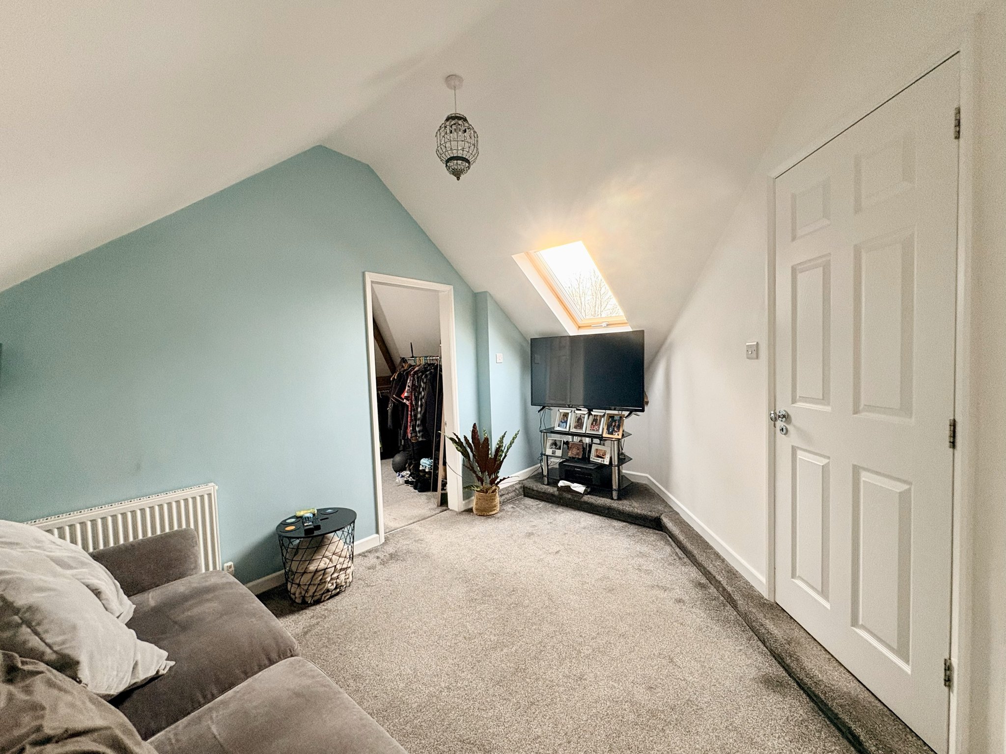 An ideal private retreat or study space, with fitted carpet, skylight, central heating radiator, TV ariel cable, built in storage draw units, pendant lighting, and access to the en-suite shower room.