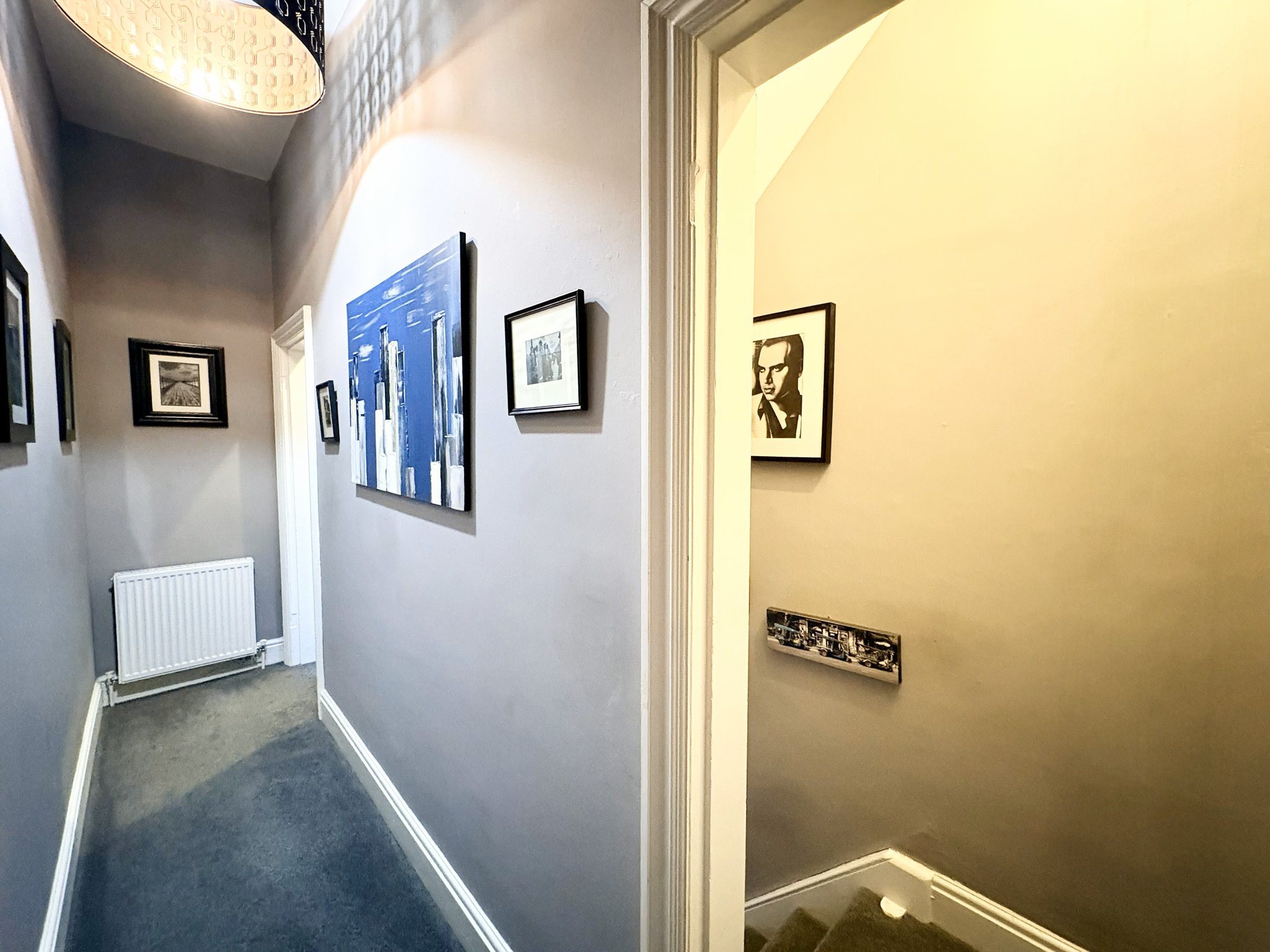 A charming half-landing with rear-facing obscure-glazed window, central heating radiator, dado rail, and decorative ceiling rose. This level provides access to the family bathroom and separate WC.