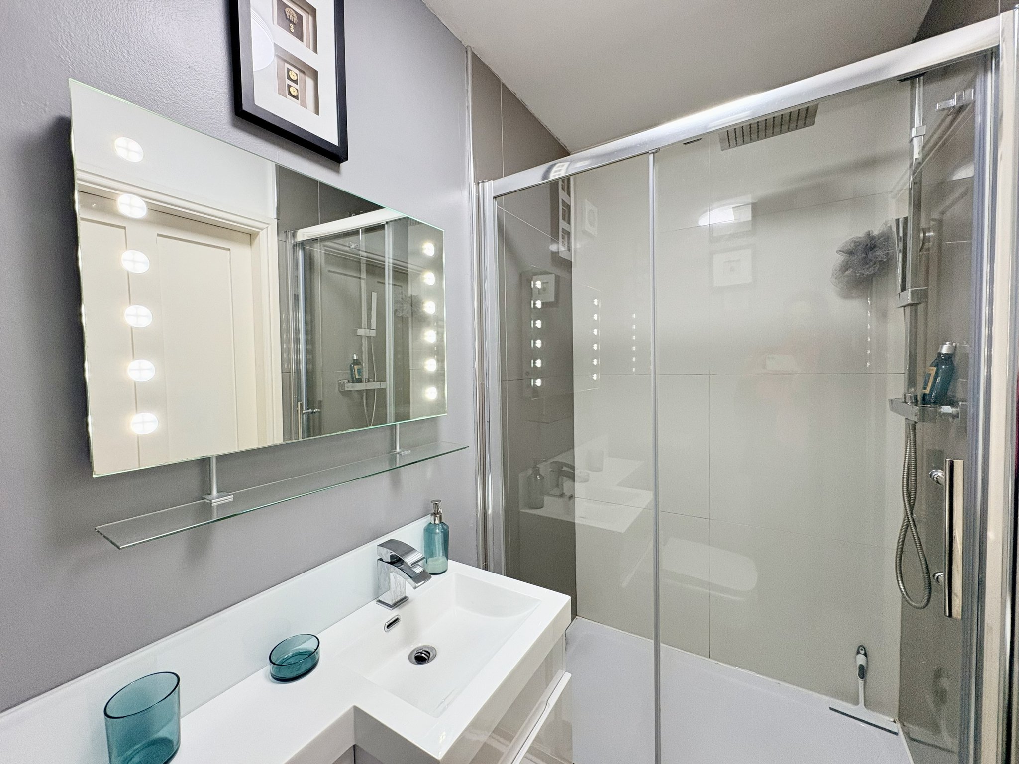 Beautifully appointed and part-tiled, featuring a walk-in rainfall shower with glass screen, wash hand basin set into a vanity unit, low-flush WC, central heating radiator, coving to the ceiling, front-facing obscure window, illuminated mirror with shaver points, and pendant lighting. This room is also accessible from the landing.