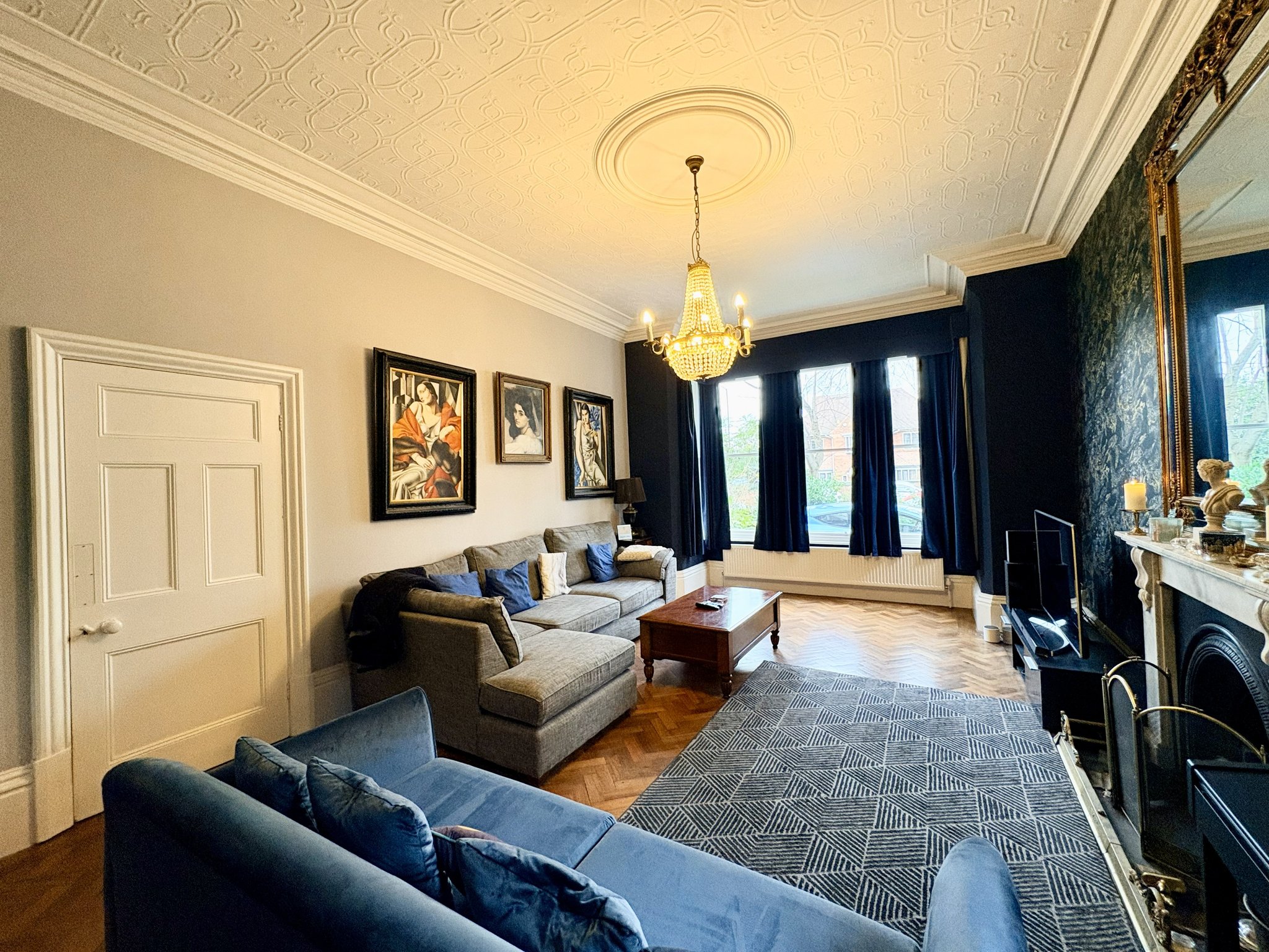 A grand and welcoming space that immediately sets the tone for the property. The spacious entrance hall provides access to all principal ground floor rooms and features a central heating radiator, dado rail, decorative coving, and a striking original open coal fireplace with cast iron surround. A stunning original staircase rises to the first floor, while beautiful, reclaimed parquet flooring flows seamlessly from the hallway into the formal lounge and library/snug.