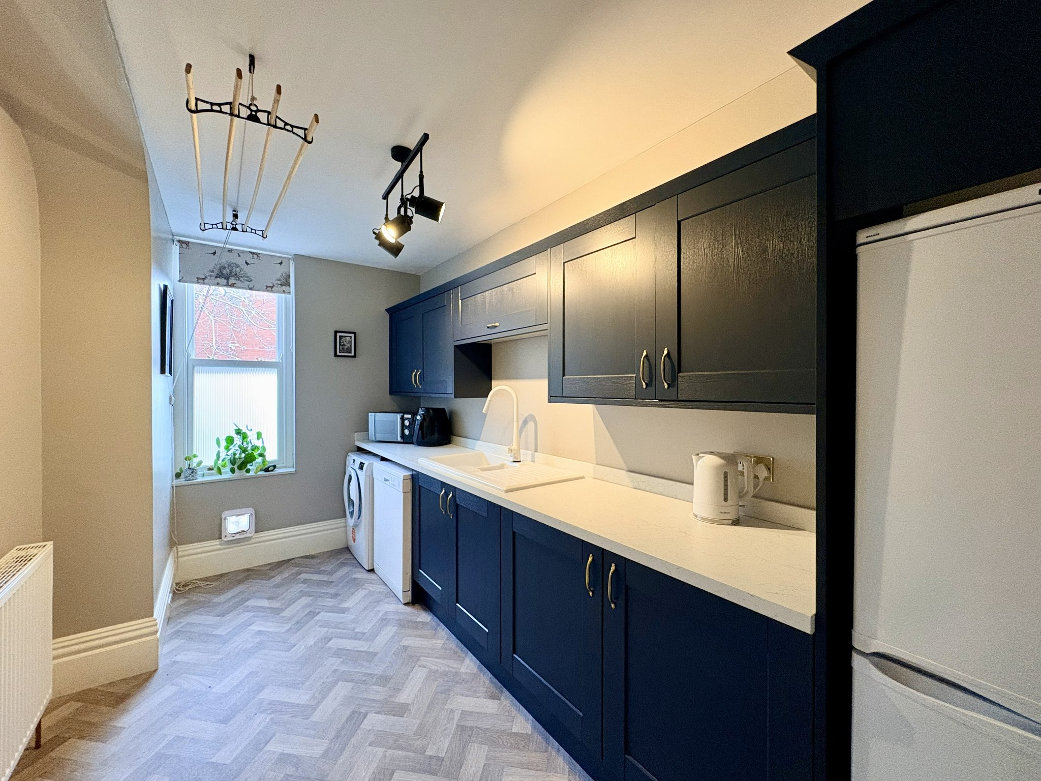 A spacious and well-equipped utility room with plumbing for washing machine and dryer, matching wall and base units with contrasting worktops, ceramic sink unit, space for a fridge/freezer, vinyl flooring, ceiling pulley, pendant lighting, and a central heating radiator.