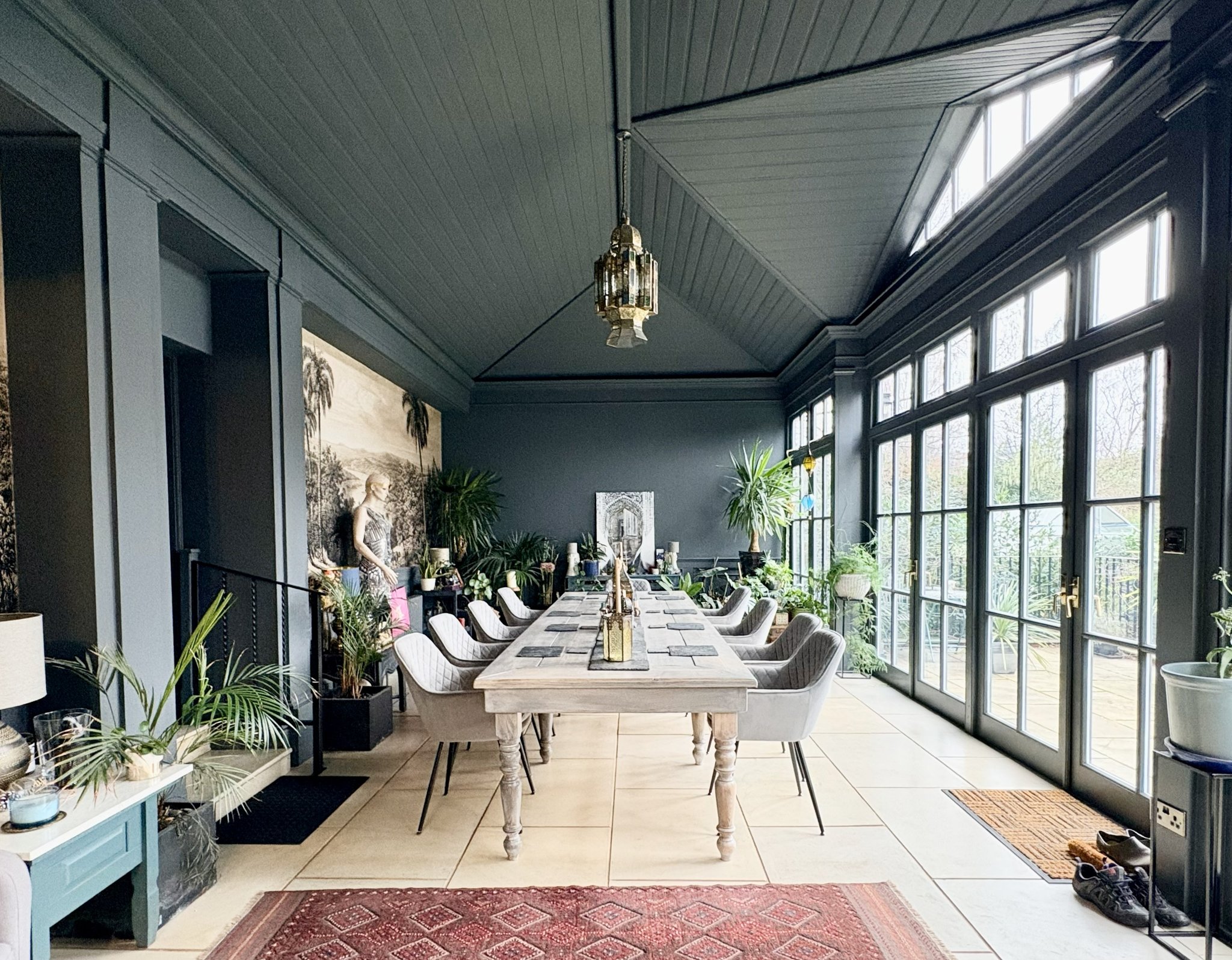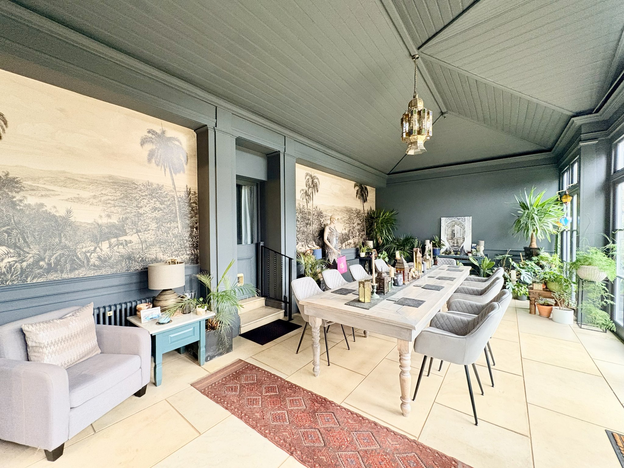 Undoubtedly one of the home’s standout features, this impressive hardwood-and-glass with insulated slate roof orangery provides a spectacular space for entertaining and socialising. Positioned to the rear of the property (which benefits from sun throughout the day), it offers open access to the kitchen and a door to the hallway. The room features stone tiled flooring throughout, four central heating column radiators, a centrally positioned chandelier, and two sets of French doors opening directly onto the rear patio and garden.