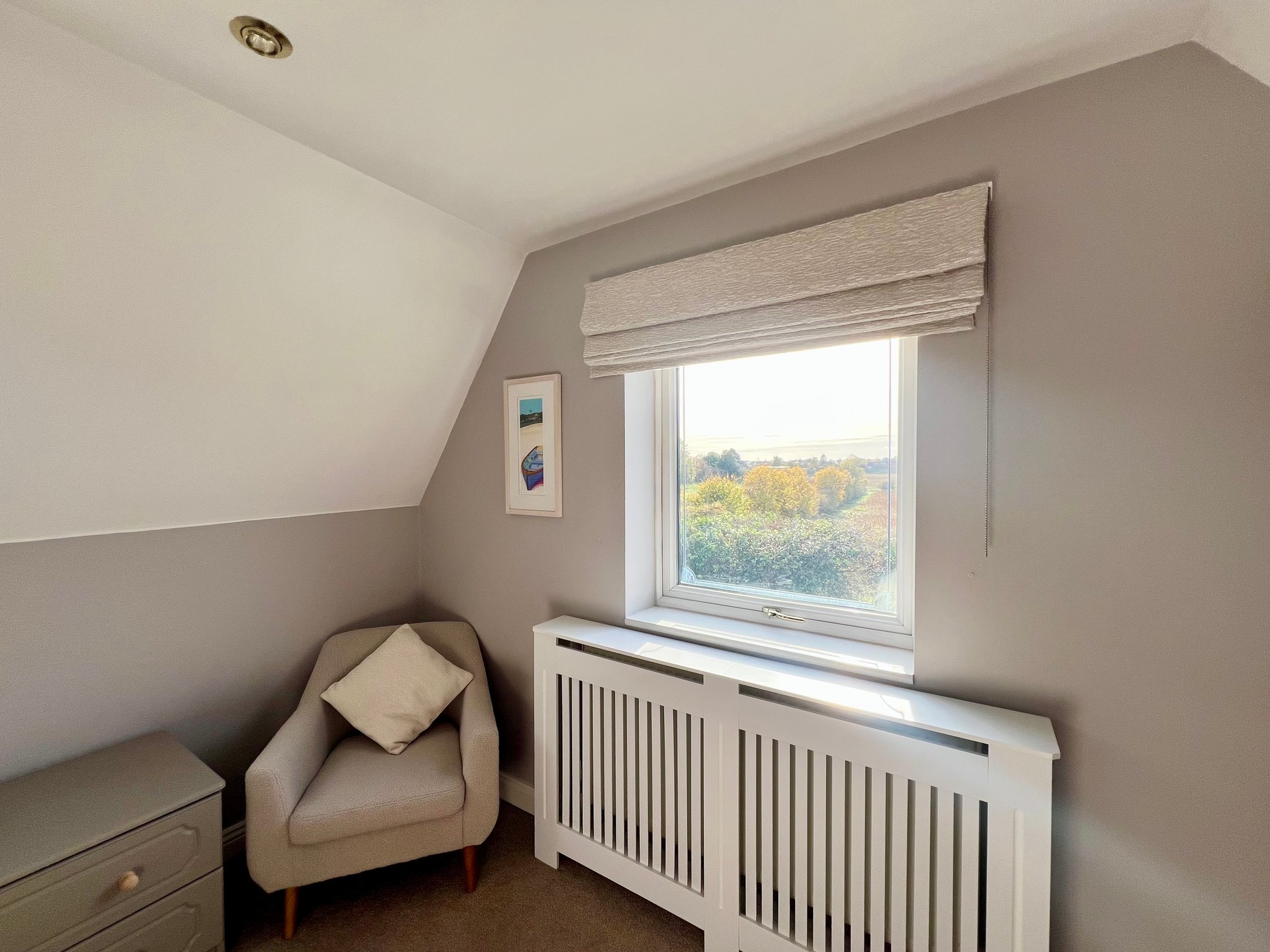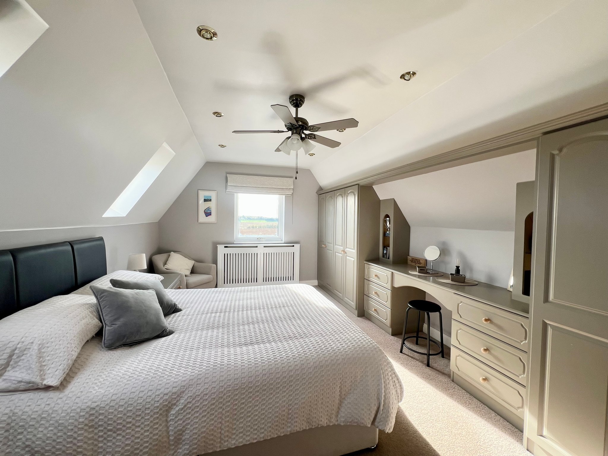 The principal bedroom is located at the front of the property and enjoys stunning, uninterrupted open aspect views. The room features roof windows that flood the space with natural light, fitted furniture for convenient storage, a single pendant fan light fitting, radiator, and carpeted flooring, creating a comfortable and stylish retreat.