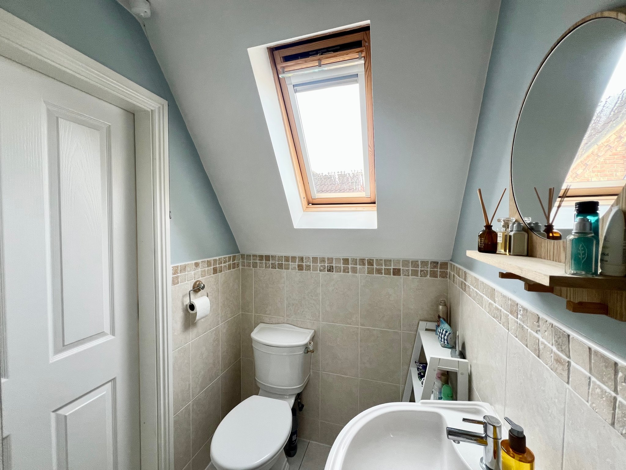 The ensuite bathroom is bright and airy, benefiting from a roof window and spotlights. It is partially tiled and comprises a shower cubicle, WC, hand basin, and radiator, combining functionality with a clean, modern finish.