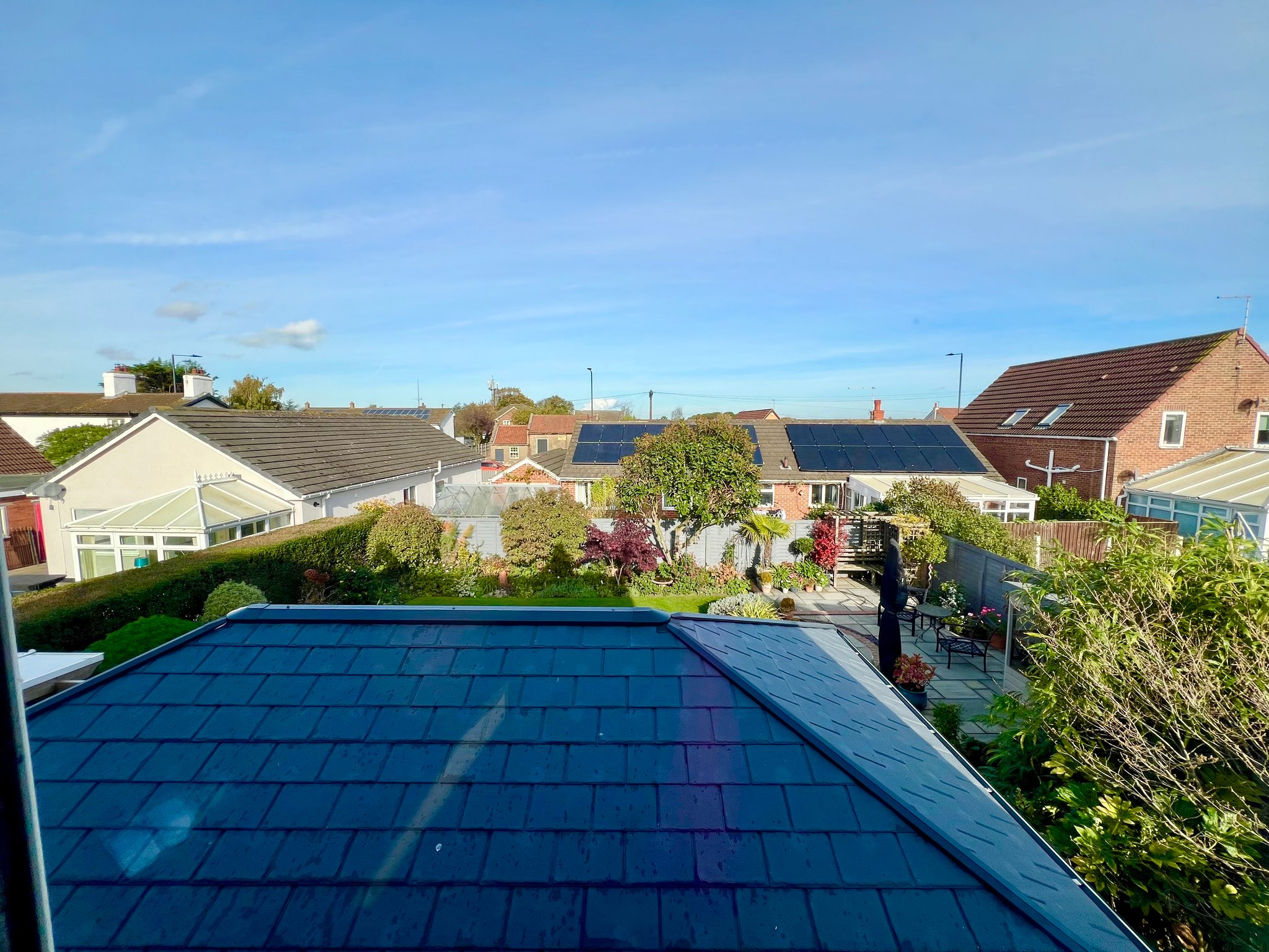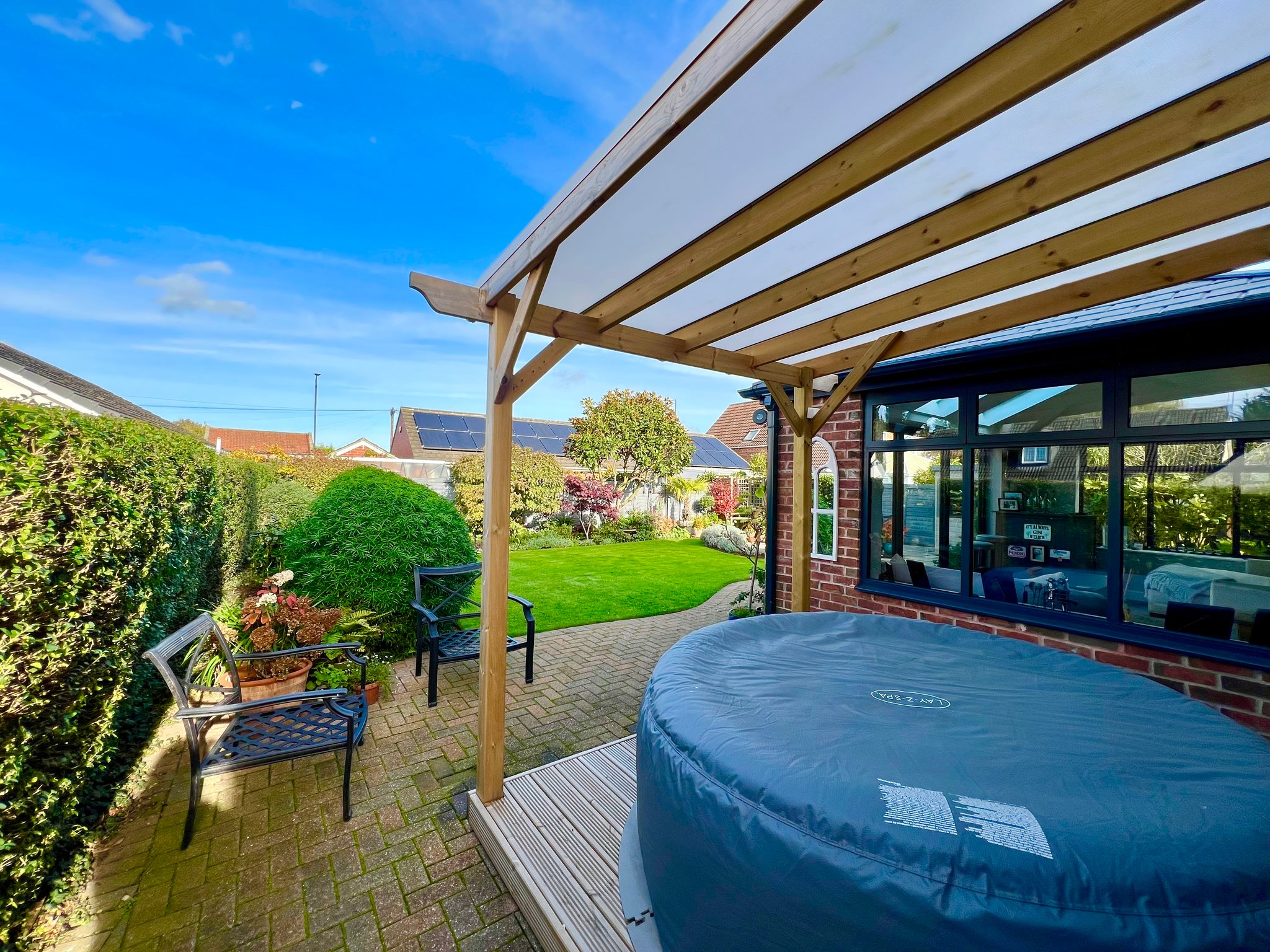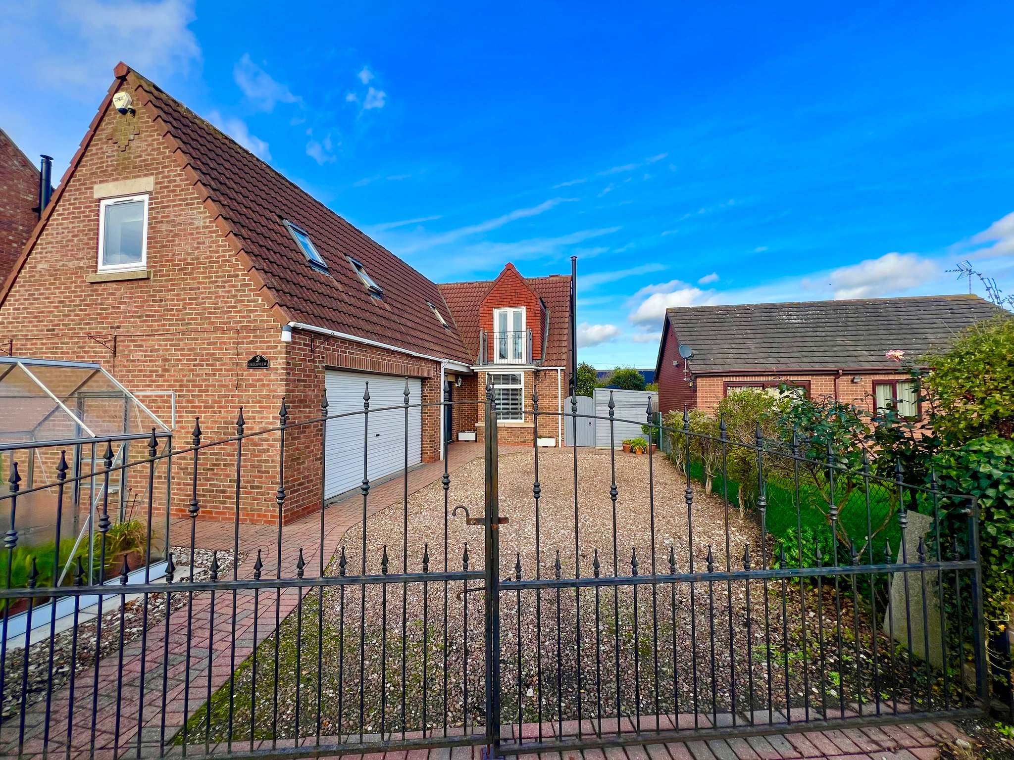 The front of the property is accessed via private gates leading to a pebbled driveway with space for numerous vehicles. A useful vegetable garden with a greenhouse and raised beds adds a touch of practicality, while pathways provide access to both sides of the property and to the double electric garage, as well as the front door. To the rear, the garden has been meticulously landscaped, featuring multiple seating areas and a beautiful variety of mature shrubs, creating a private and tranquil outdoor space where no detail has been overlooked.