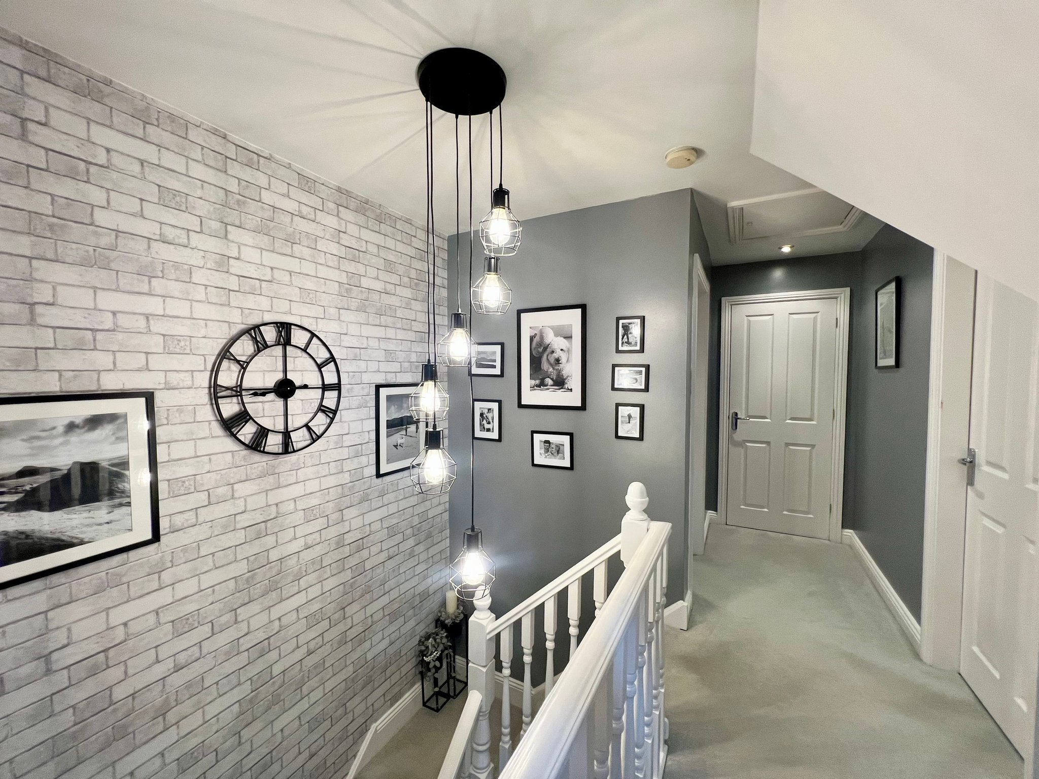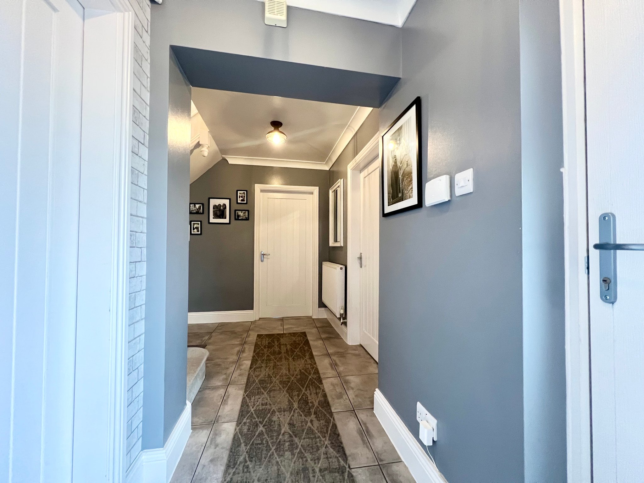 The corner staircase leads to a beautiful landing that provides access to three double bedrooms, the family bathroom, a useful storage cupboard and the loft. The space is enhanced by a stunning pendant chandelier that creates a real wow factor, complemented by roof windows and spot lighting that fill the area with natural light. The landing is finished with carpeted flooring and a radiator, offering a welcoming and elegant feel.