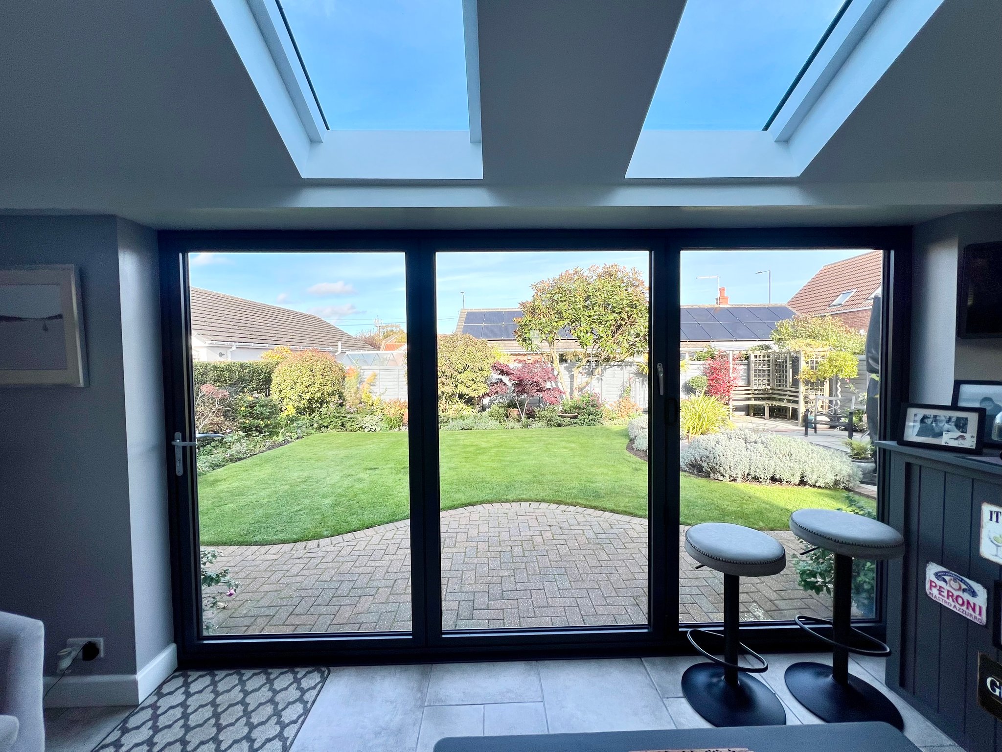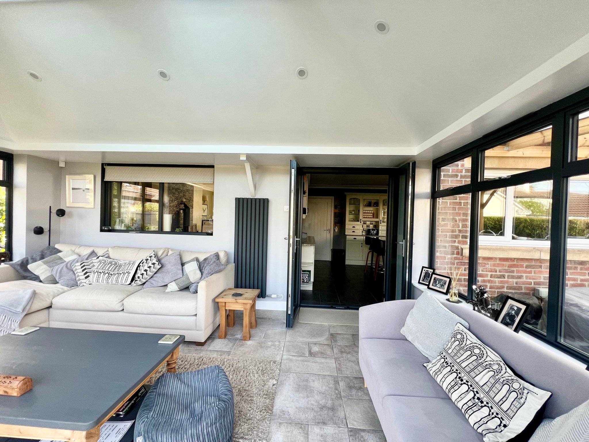 The orangery-style family room is a bright and airy space, featuring windows to both sides, roof lights, and bi-fold doors that open out to the fabulous rear garden, seamlessly blending indoor and outdoor living. The room is finished with tiled flooring, spotlights, and a radiator, creating a comfortable and versatile area for relaxation or entertaining.