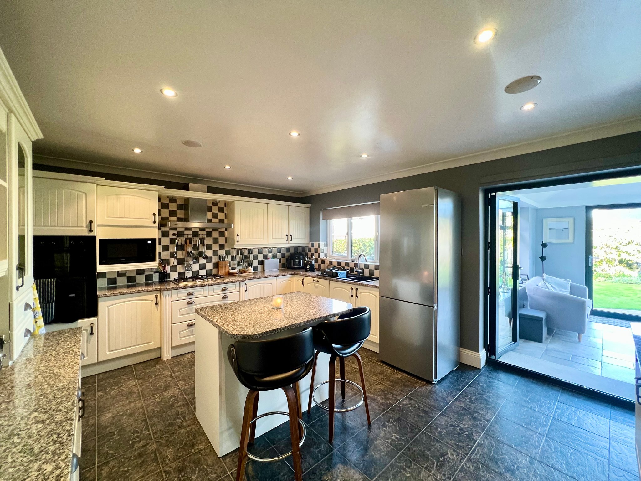The kitchen is located at the end of the hallway and is fitted with a range of wall and base units, incorporating an integrated hob, oven, dishwasher. A central island provides a practical space for casual dining or food preparation. The room features tiled flooring, spot lighting, and a rear aspect window offering lovely views over the beautifully maintained rear garden, there is access through french doors into the additional orangery/family room.