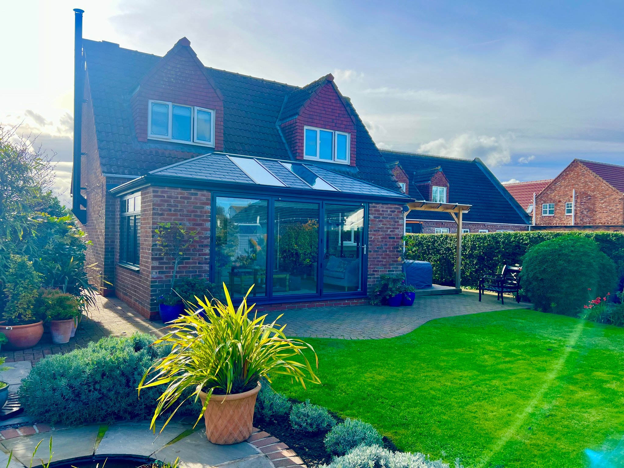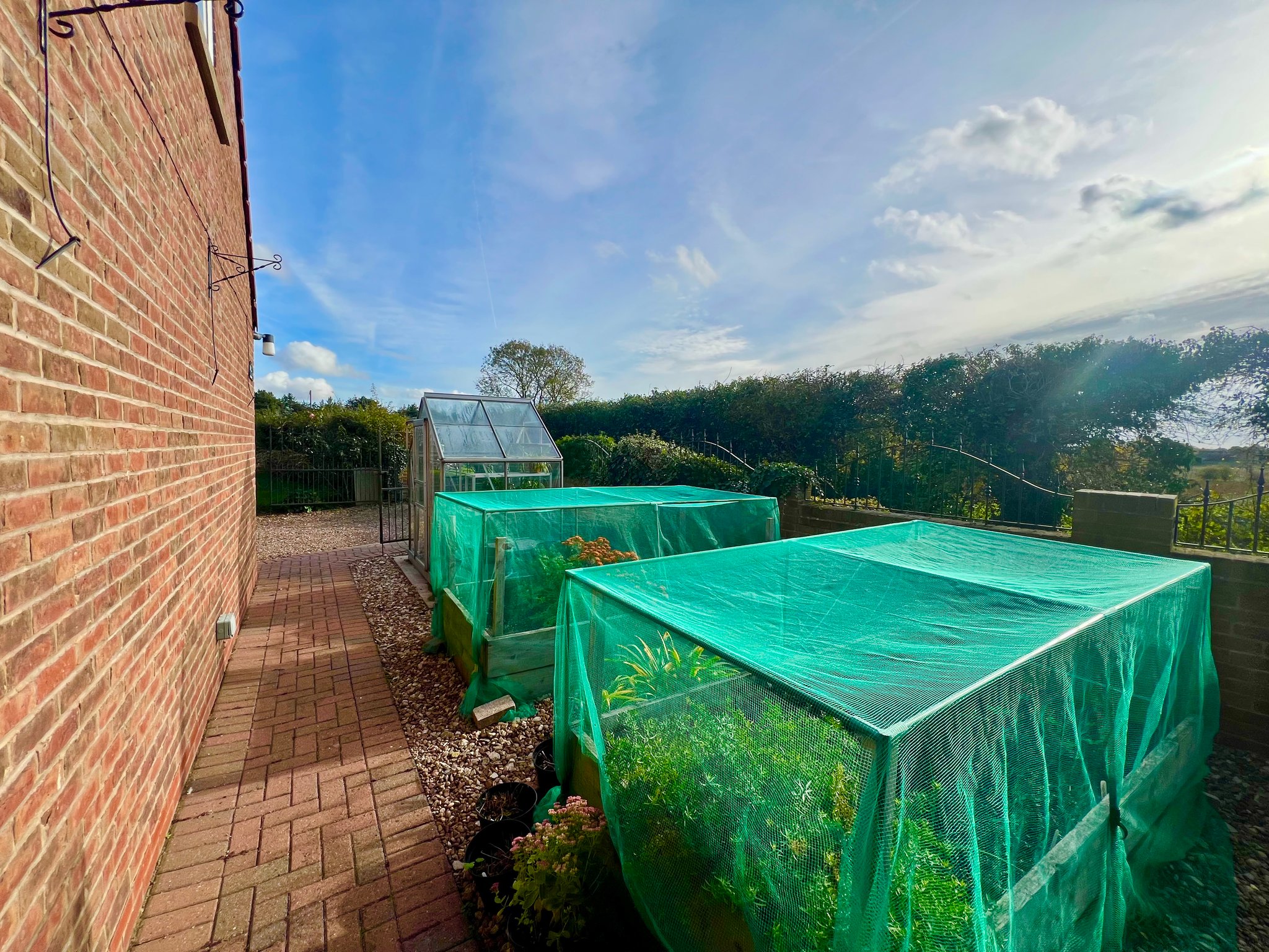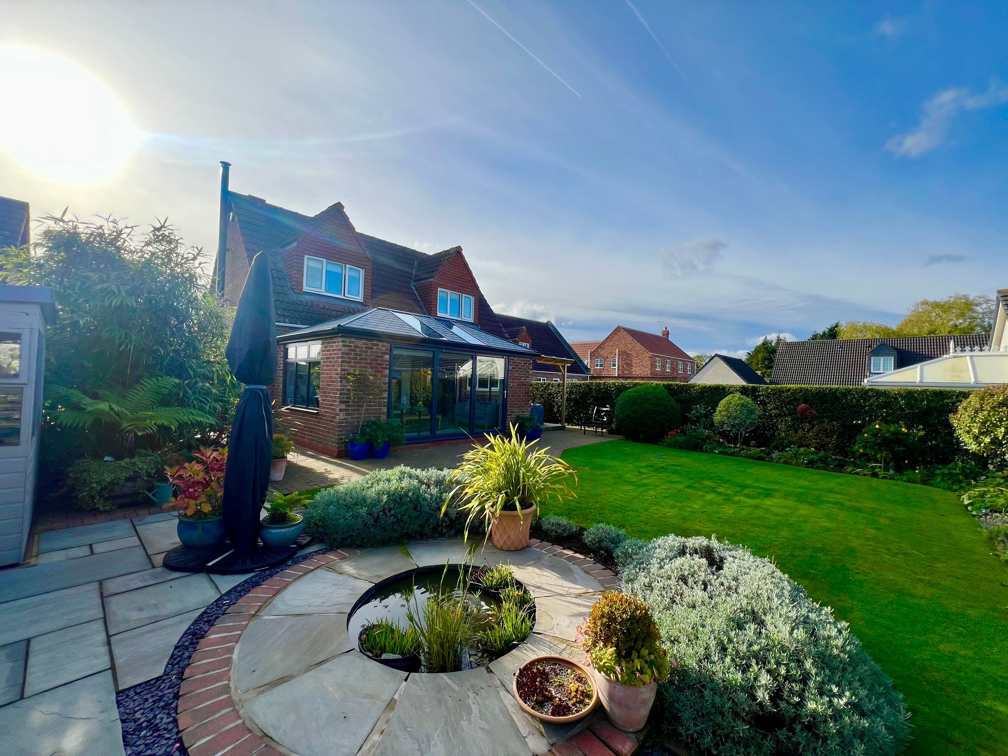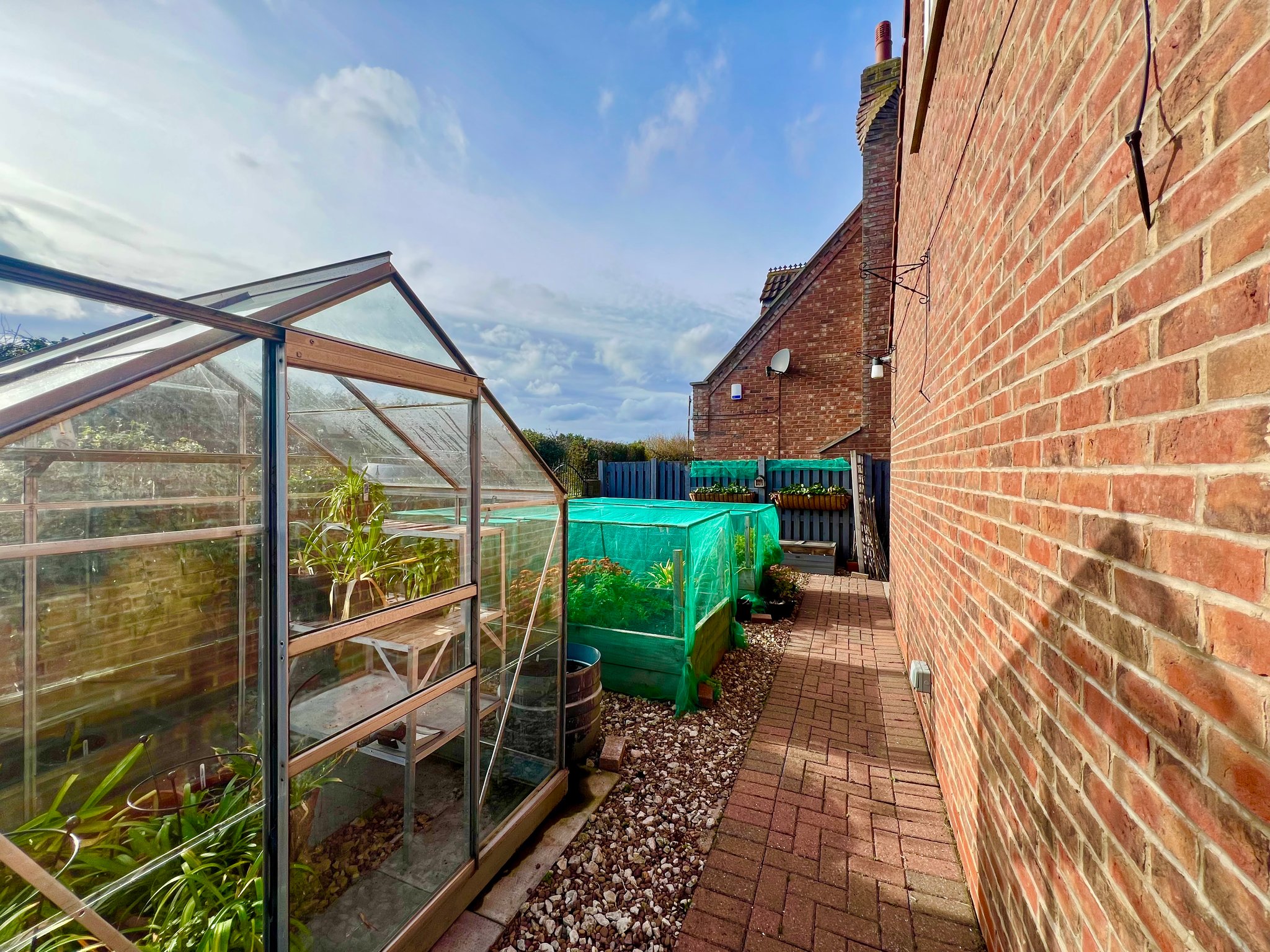 To the front, there is an open area currently used as a vegetable garden  with a greenhouse and raised beds while to the rear, the beautifully landscaped gardens wrap around the side and back of the property, offering a variety of patios to enjoy the sun throughout the day. The garden is mainly laid to lawn with an attractive mix of mature shrubs, providing both colour and privacy.
