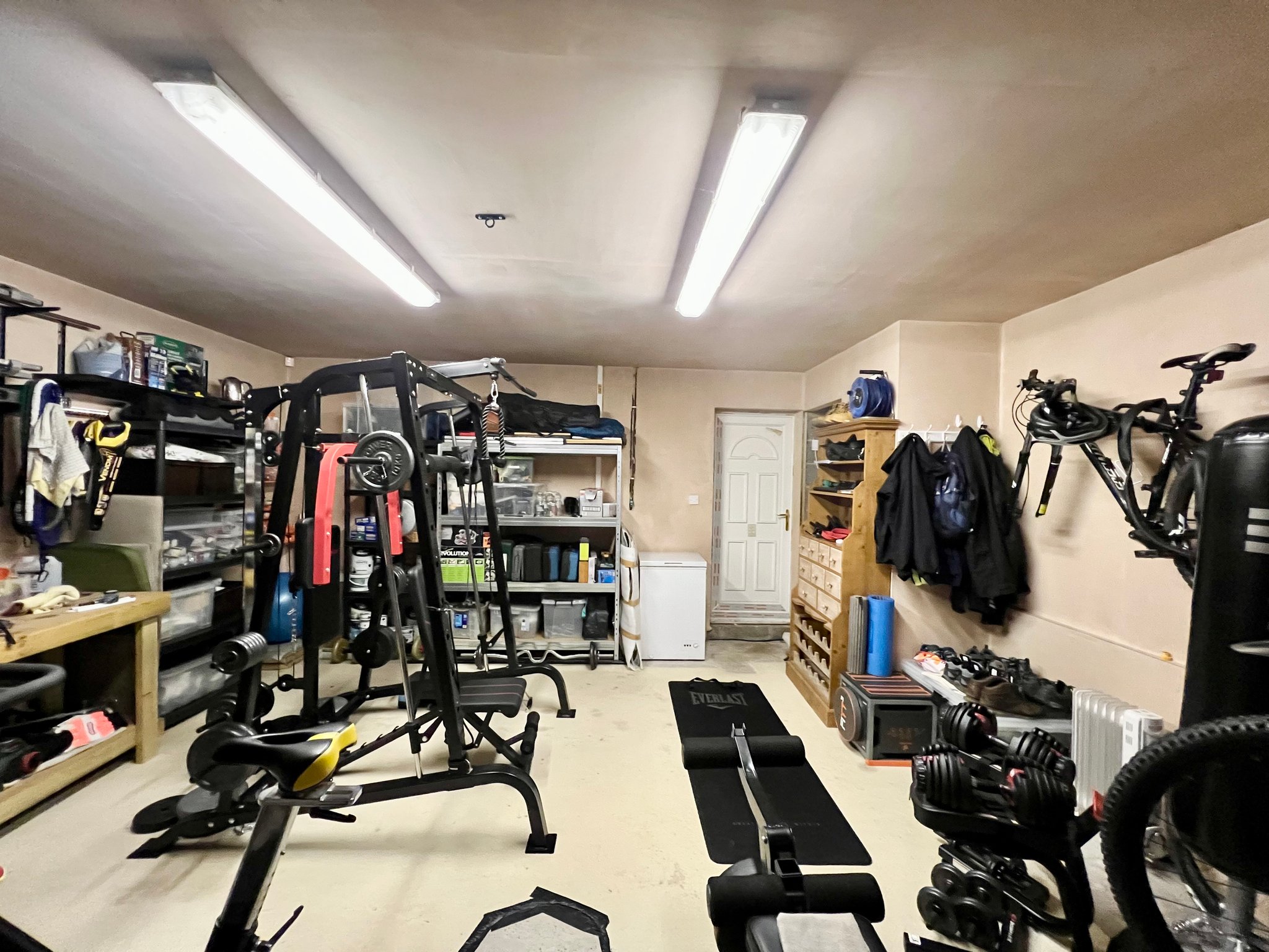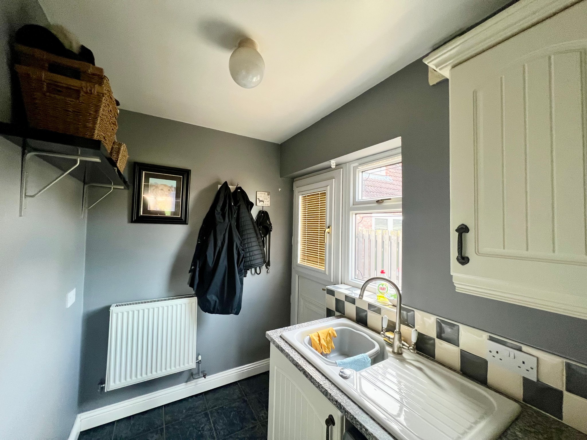 The utility room is fitted with a range of wall and base units providing additional storage and workspace, with a side door offering direct access to the garden. The room is finished with tiled flooring, belfast sink and  spot lighting, combining practicality with a clean, modern look.