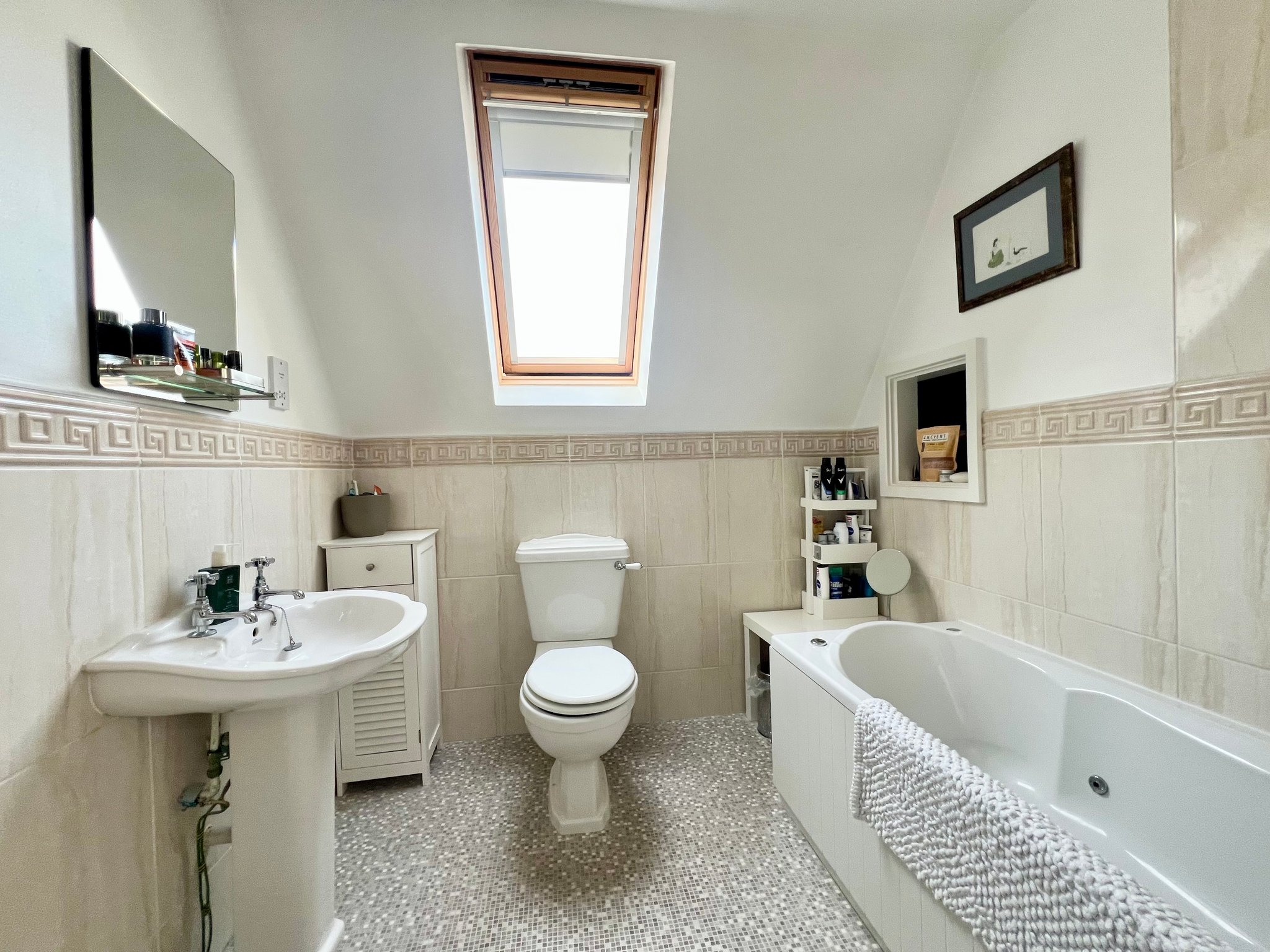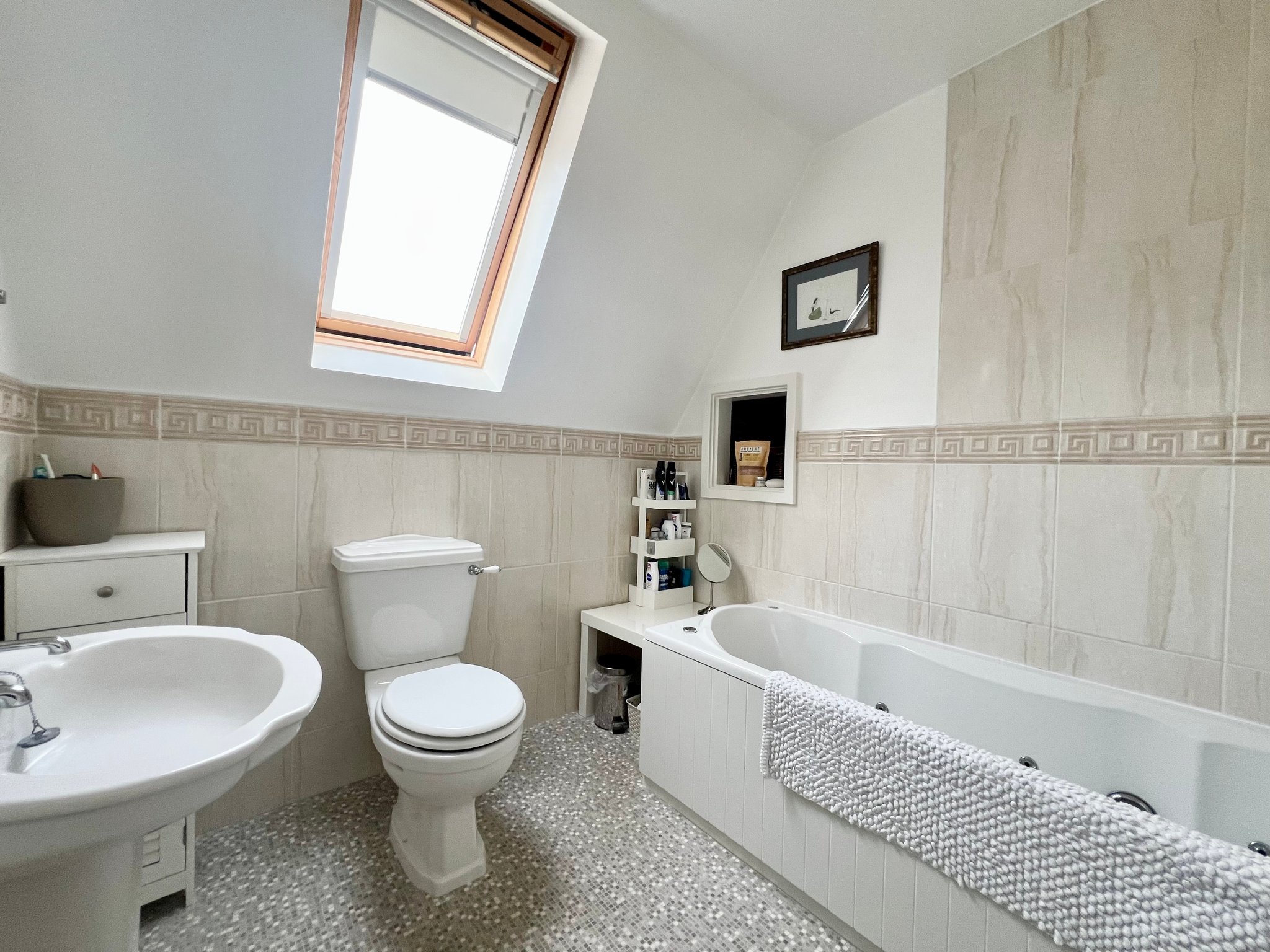 The family bathroom features a jacuzzi bathtub, WC, and hand basin, with a radiator for added comfort. The walls and floor are partially tiled, and a roof window along with spotlights ensures the space is bright and inviting.