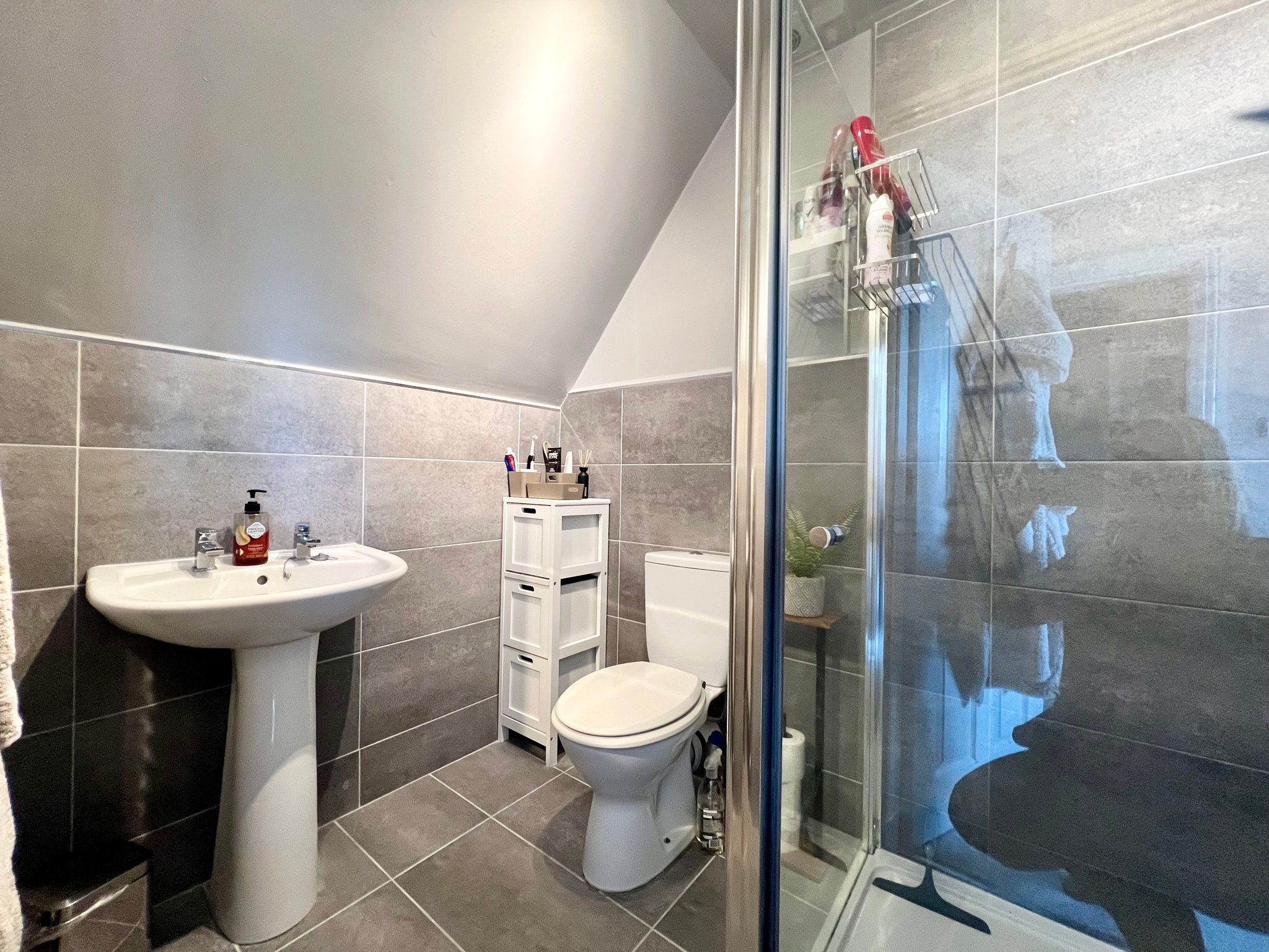 The ensuite bathroom is fitted with a shower cubicle, WC, and hand basin. It features tiled flooring, a heated towel rail, and a single pendant light fitting, combining practicality with a clean, modern finish.