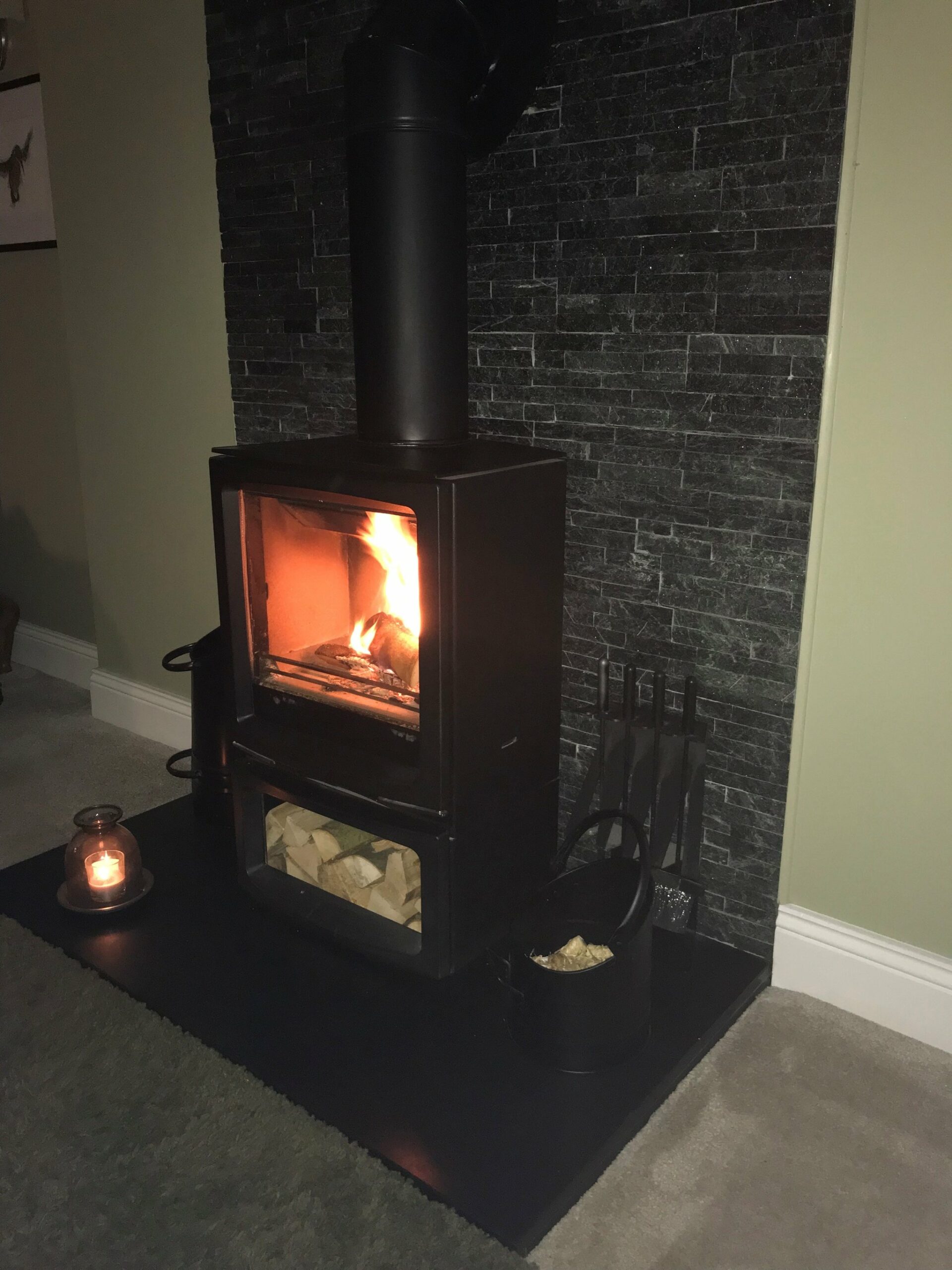 The spacious lounge features a beautiful bay window overlooking open aspect views to the front, while an additional rear-facing window allows natural light to flow through from the adjoining family room and rear garden. A striking log burner forms a stunning focal point and creates a cosy, inviting atmosphere on cooler evenings. The room is finished with carpeted flooring, a single pendant light fitting, and additional wall lights to create the perfect ambiance.