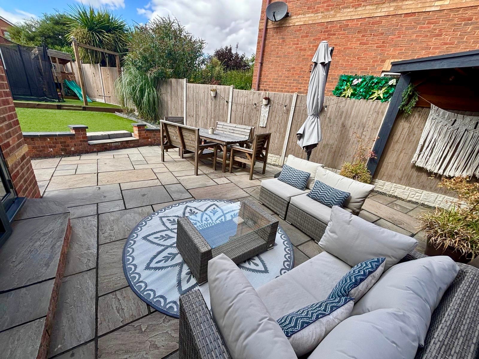 To the front of the property is a low-maintenance garden with a grass lawn, double driveway and garage with power and lighting. The garage has been converted to provide storage space and a gym and could easily be converted back to a traditional garage if required. The landscaped rear garden has been thoughtfully designed to offer a low-maintenance and family-friendly outdoor space. It features a patio area ideal for outdoor dining and entertaining, artificial grass for ease of upkeep and mature shrub borders providing colour and privacy.