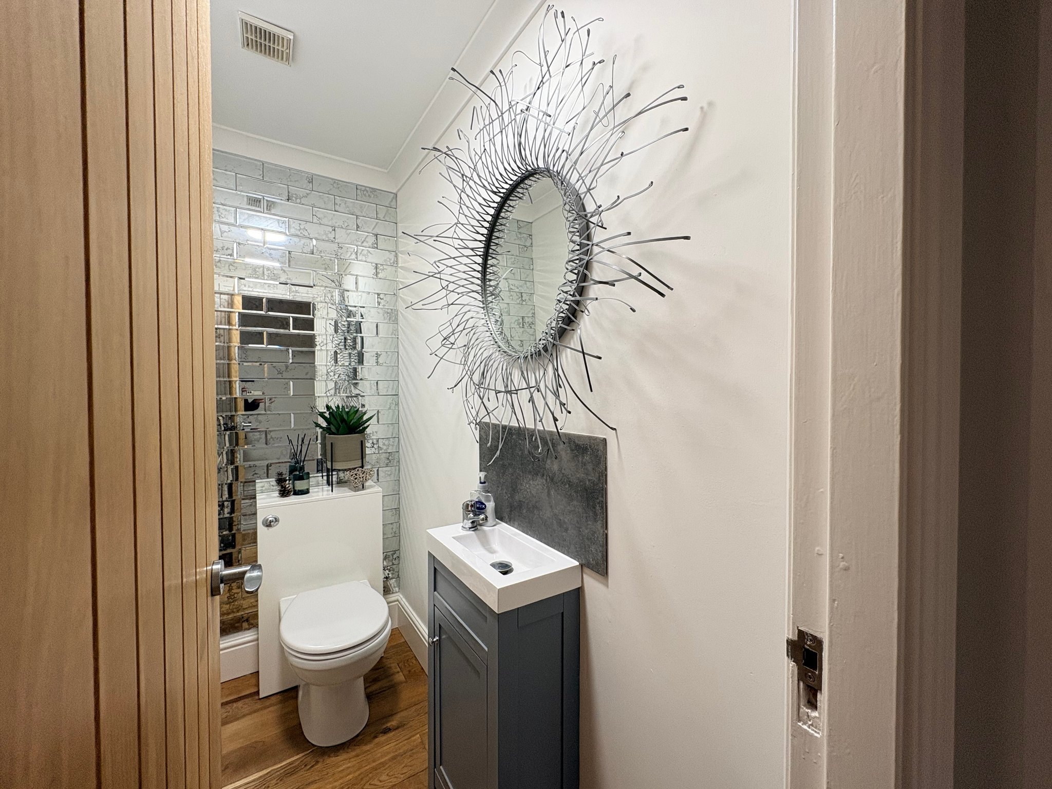Ground Floor WC - A stylish ground floor WC with a feature tiled wall, hand basin with storage beneath, WC and a single pendant light fitting. The room also benefits from a radiator and engineered wood flooring.