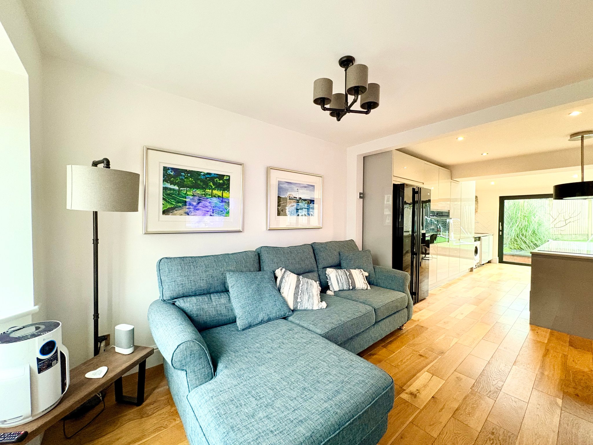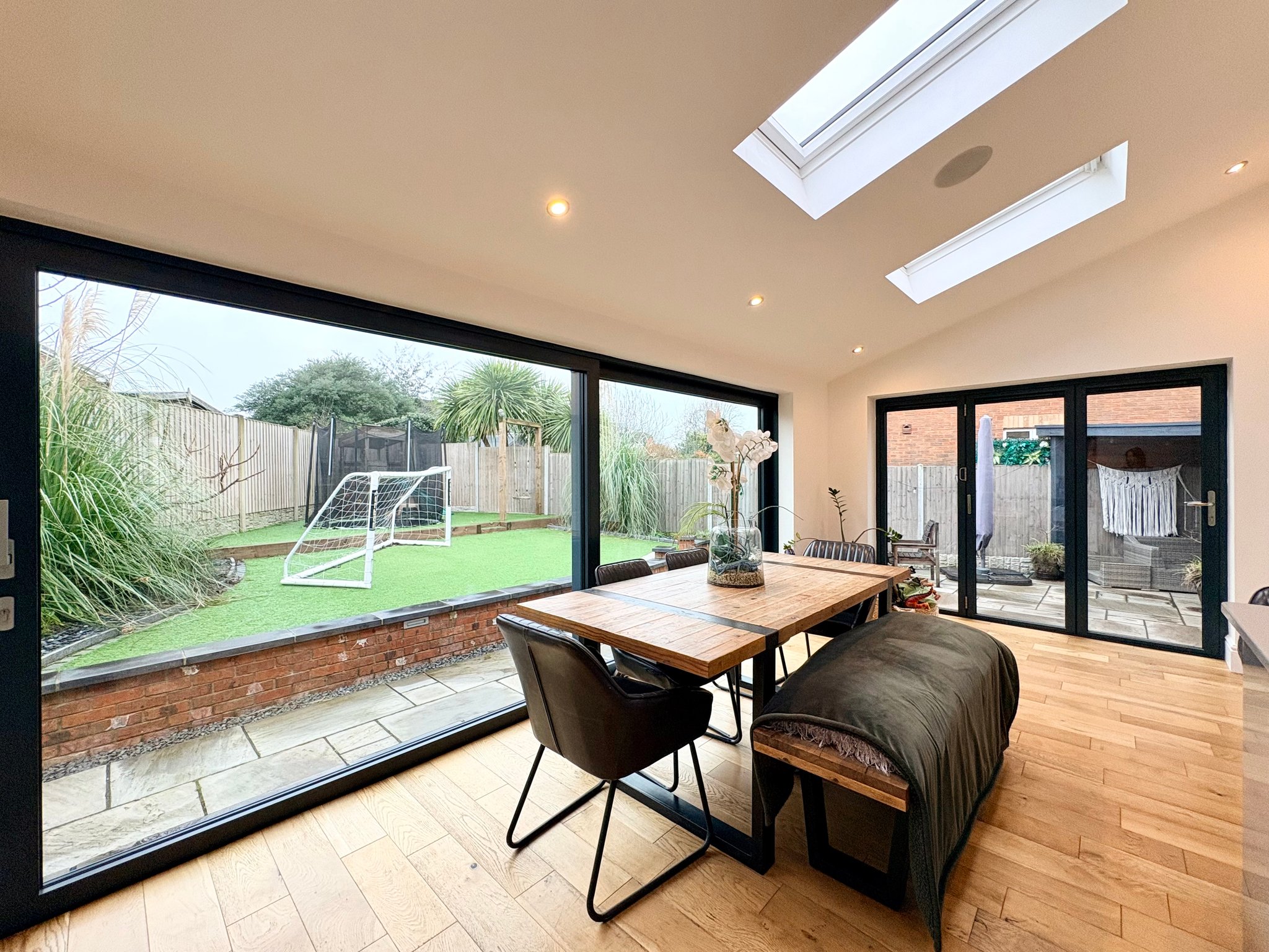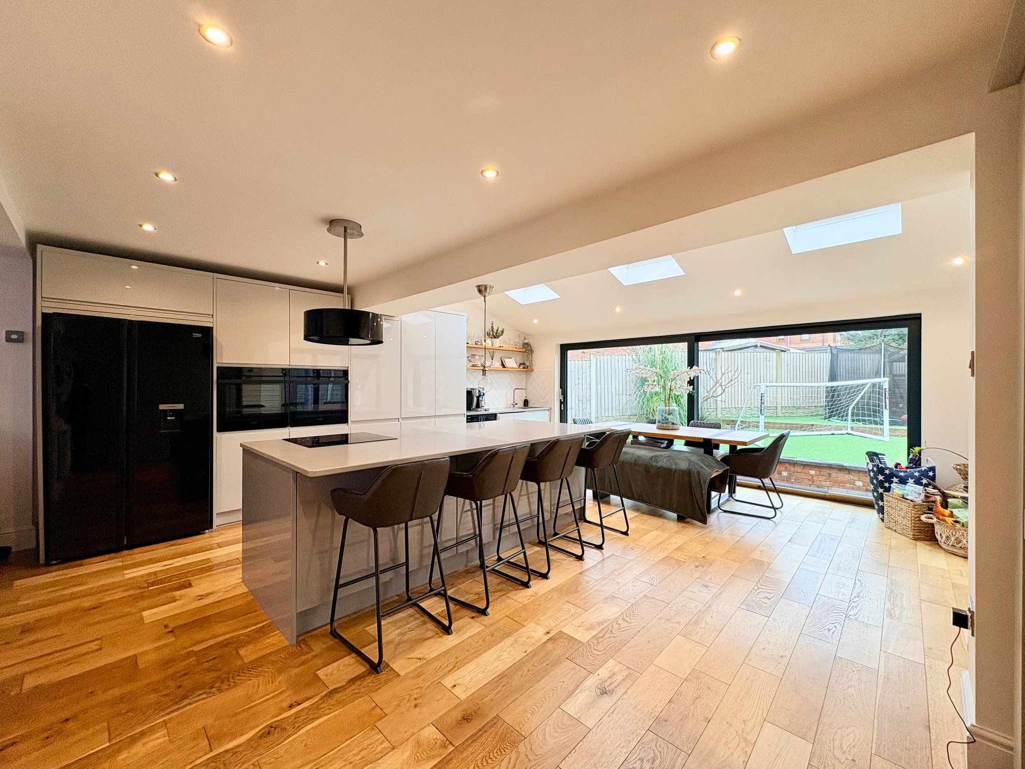 The living and dining areas enjoy a bright and airy dual aspect layout, featuring a bay window to the front, large sliding doors to the rear and additional sliding glass doors to the side. These features, along with 3 Velux style sky lights, allow natural light to flood the room and provide seamless access to the garden. The space is further enhanced by two radiators, two single pendant light fittings and additional recessed spot lighting, making it ideal for both everyday family living and entertaining guests.