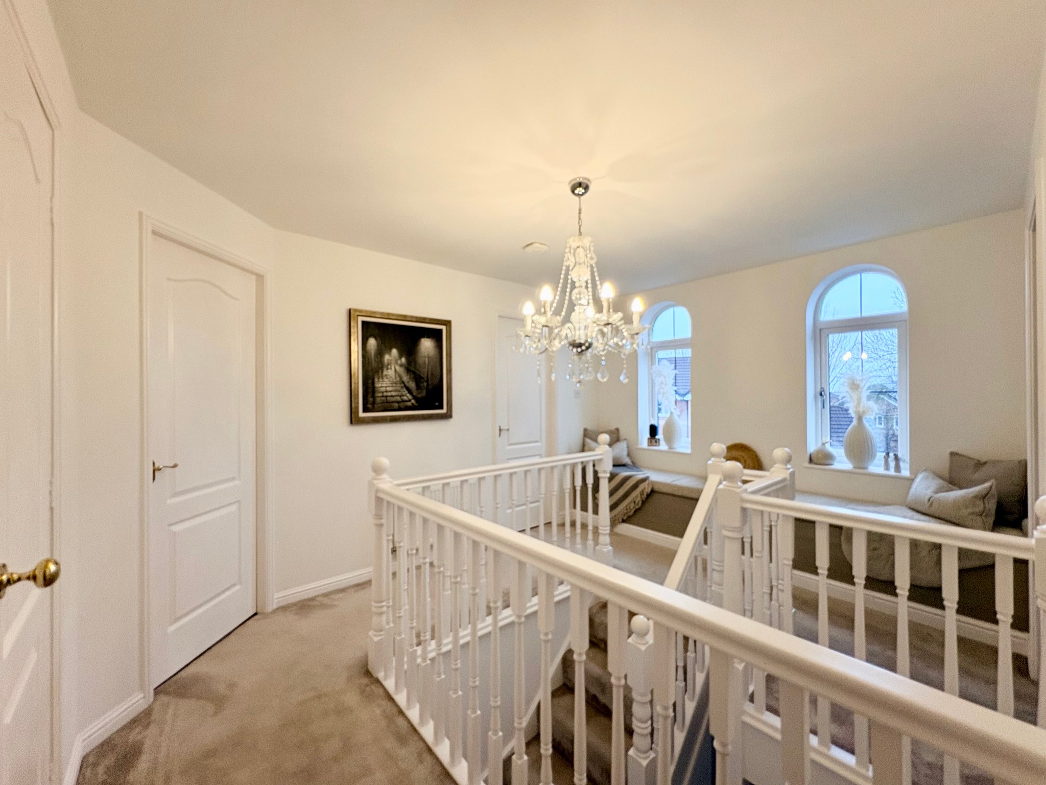 Landing - The galleried first floor landing adds a sense of openness and architectural interest to the home. A beautiful window seat creates a charming and practical feature, offering a quiet space for reading or relaxation. The landing provides access to all bedrooms and the family bathroom and includes a storage cupboard, carpeted flooring, single pendant light fitting, two front aspect windows and loft access.
