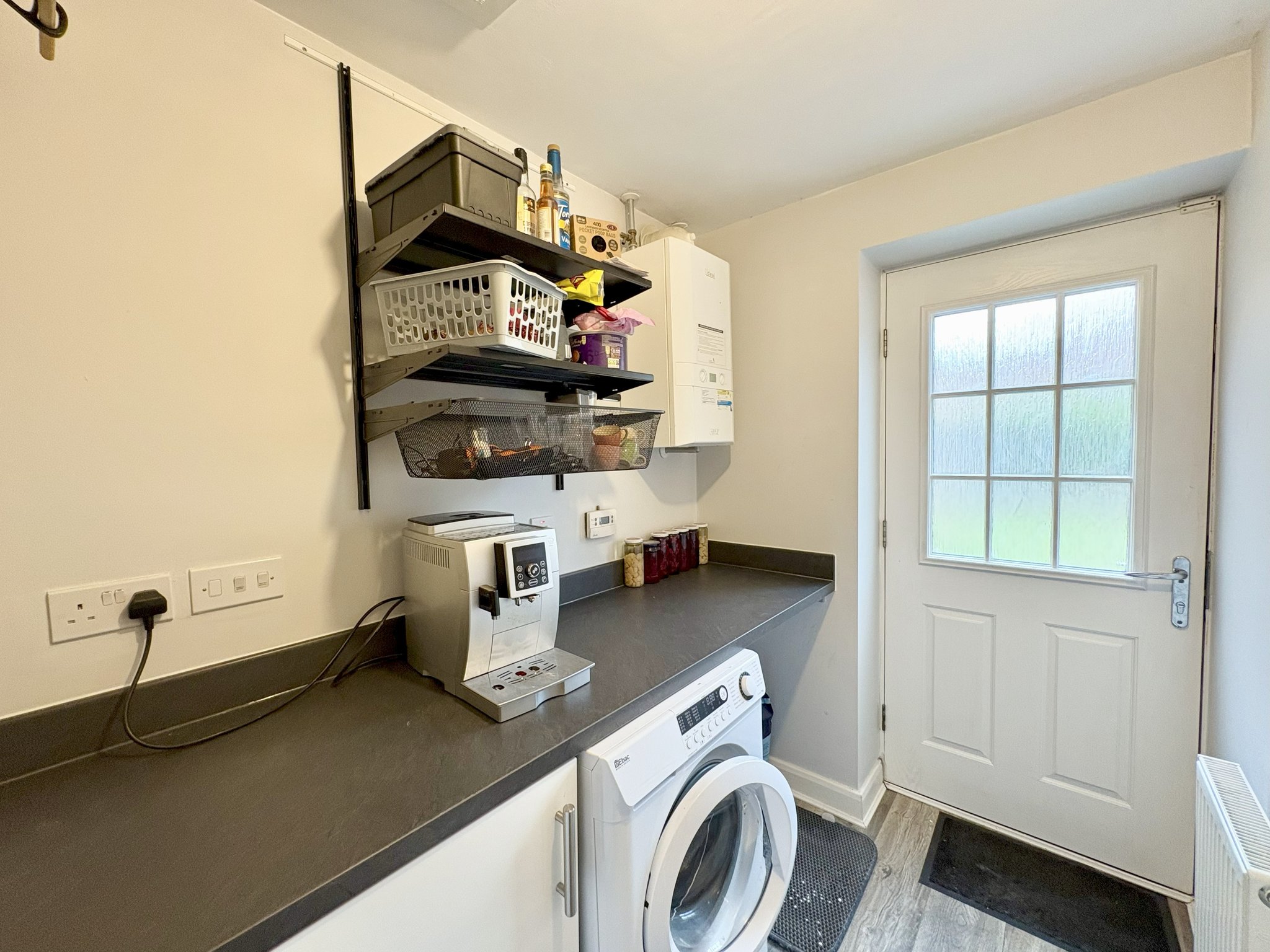 Adjoining the kitchen is the utility room, which includes matching floor units, contrasting worktops, plumbing for a washing machine, a radiator, and a rear access door leading out to the garden.
