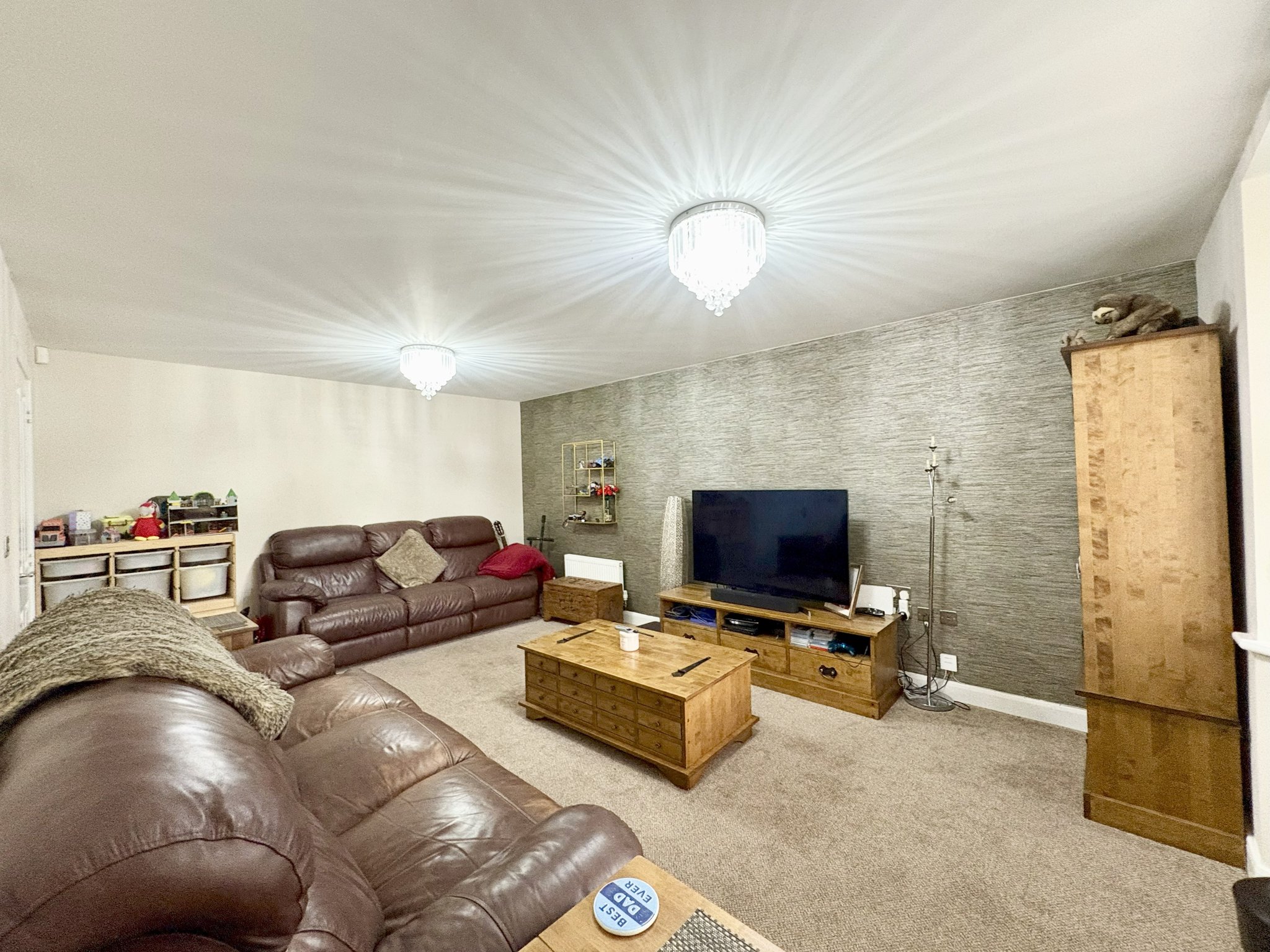 To the front of the property, the snug or office offers flexibility depending on the needs of the household. It is well-suited as a home office, study, or additional sitting area, and comes complete with fitted desk and storage, carpeted flooring, a radiator, and a single pendant light fitting.
