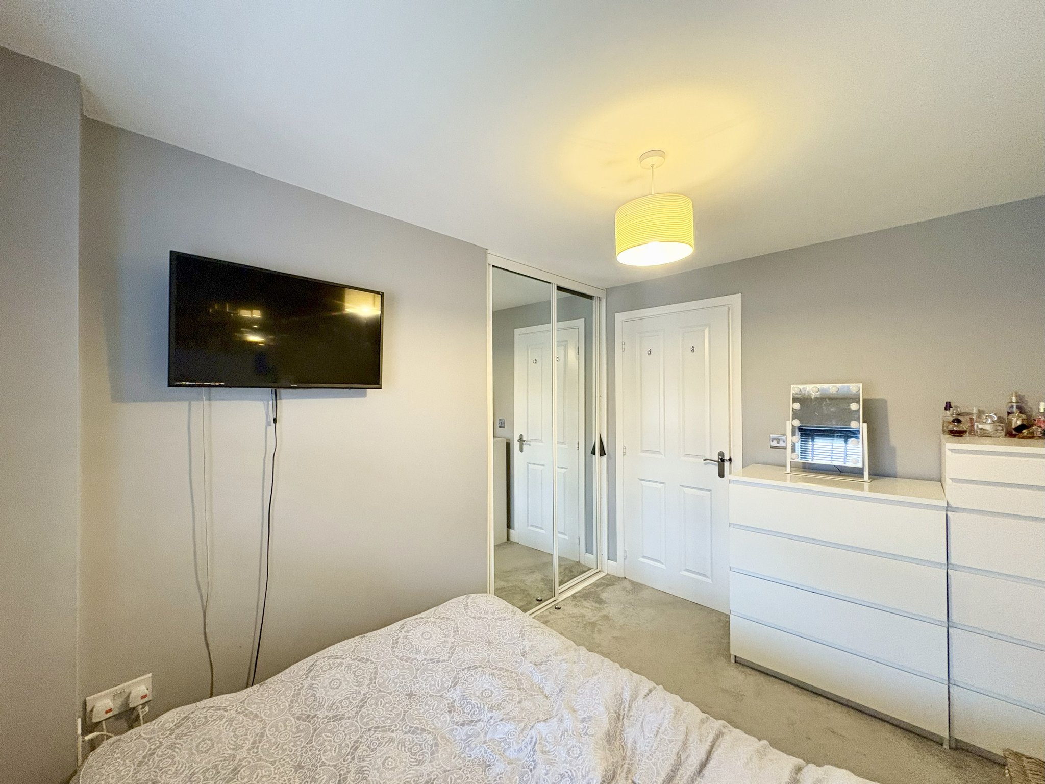 The principal bedroom is positioned at the front of the property and benefits from a full range of fitted double wardrobes, and soft carpet underfoot. A radiator and a single pendant light fitting complete the space, which also includes access to a private ensuite.