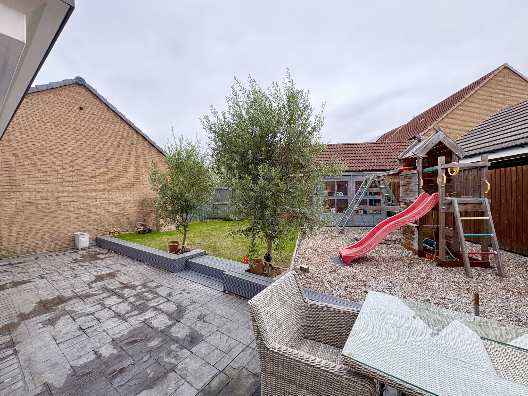 To the front of the property is a low-maintenance garden, attractively landscaped with decorative pebbles and a variety of planted shrubs, providing a pleasant and tidy approach. A private driveway offers off-road parking for two vehicles. The rear garden is well maintained and thoughtfully designed, featuring a grass lawn bordered by a selection of mature shrubs. A separate patio area provides an ideal space for outdoor dining or relaxation, both enjoying excellent sun exposure throughout the day — perfect for sun worshippers. A practical garden shed offers useful storage space, while the long detached garage, complete with an up-and-over door, provides secure parking or additional storage, depending on your needs.
