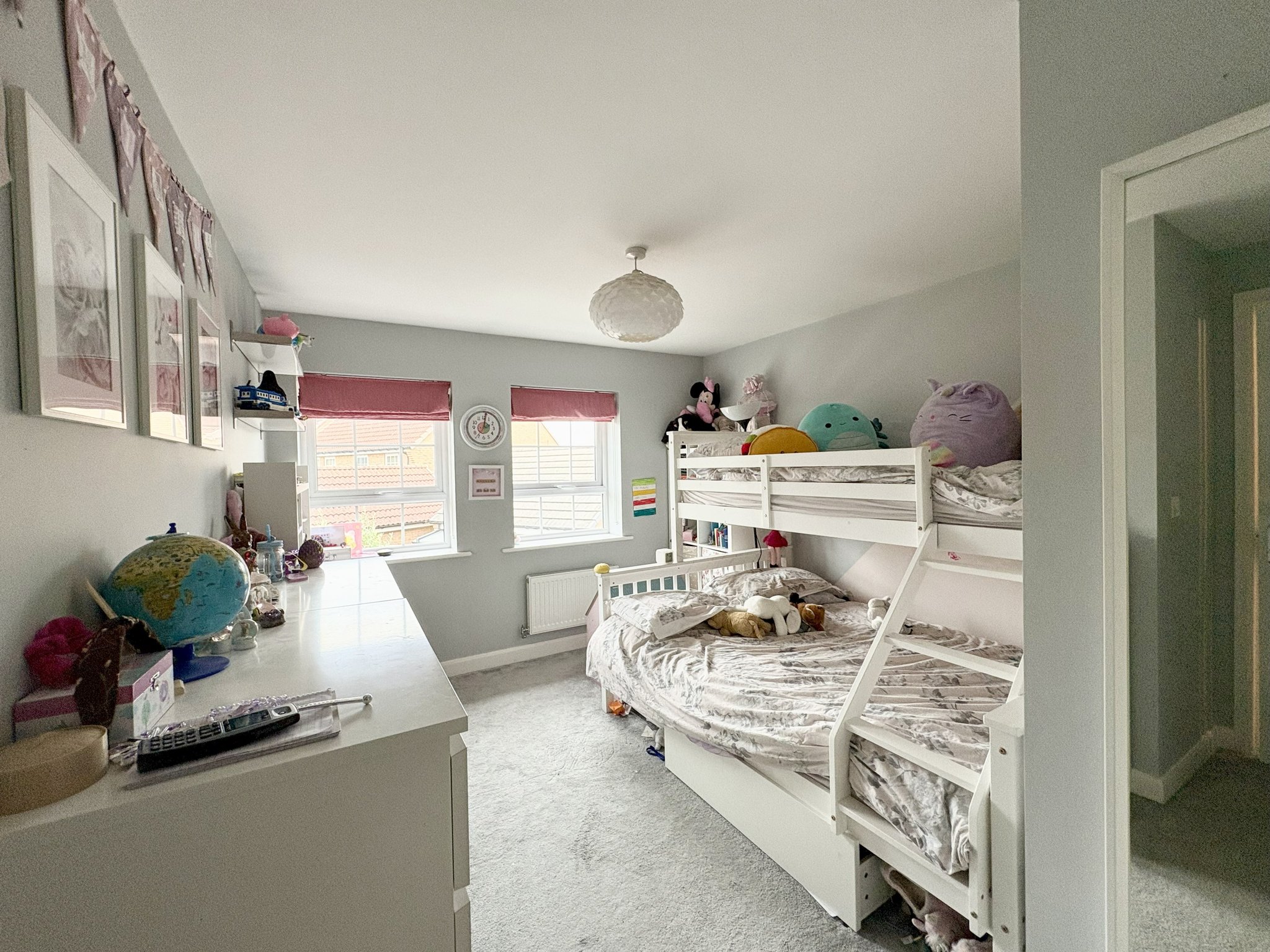 Bedroom three is front facing and has two windows, carpet to floor, radiator and single pendant light fitting.