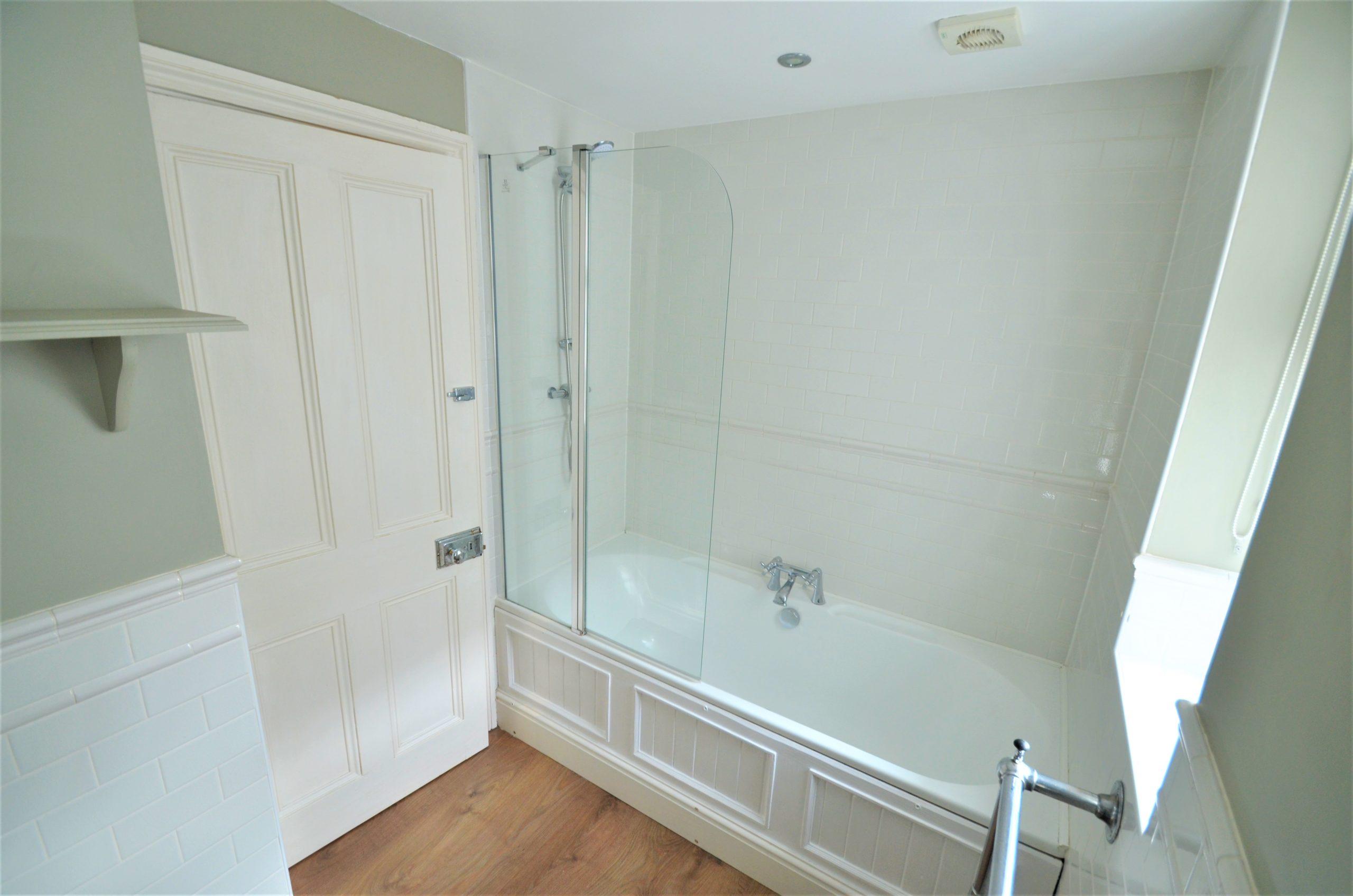 The large family bathroom offers a white bathtub with shower over, W/C and hand basin, chrome towel rail, obscure glass window, spotlighting and finished with wooden flooring.