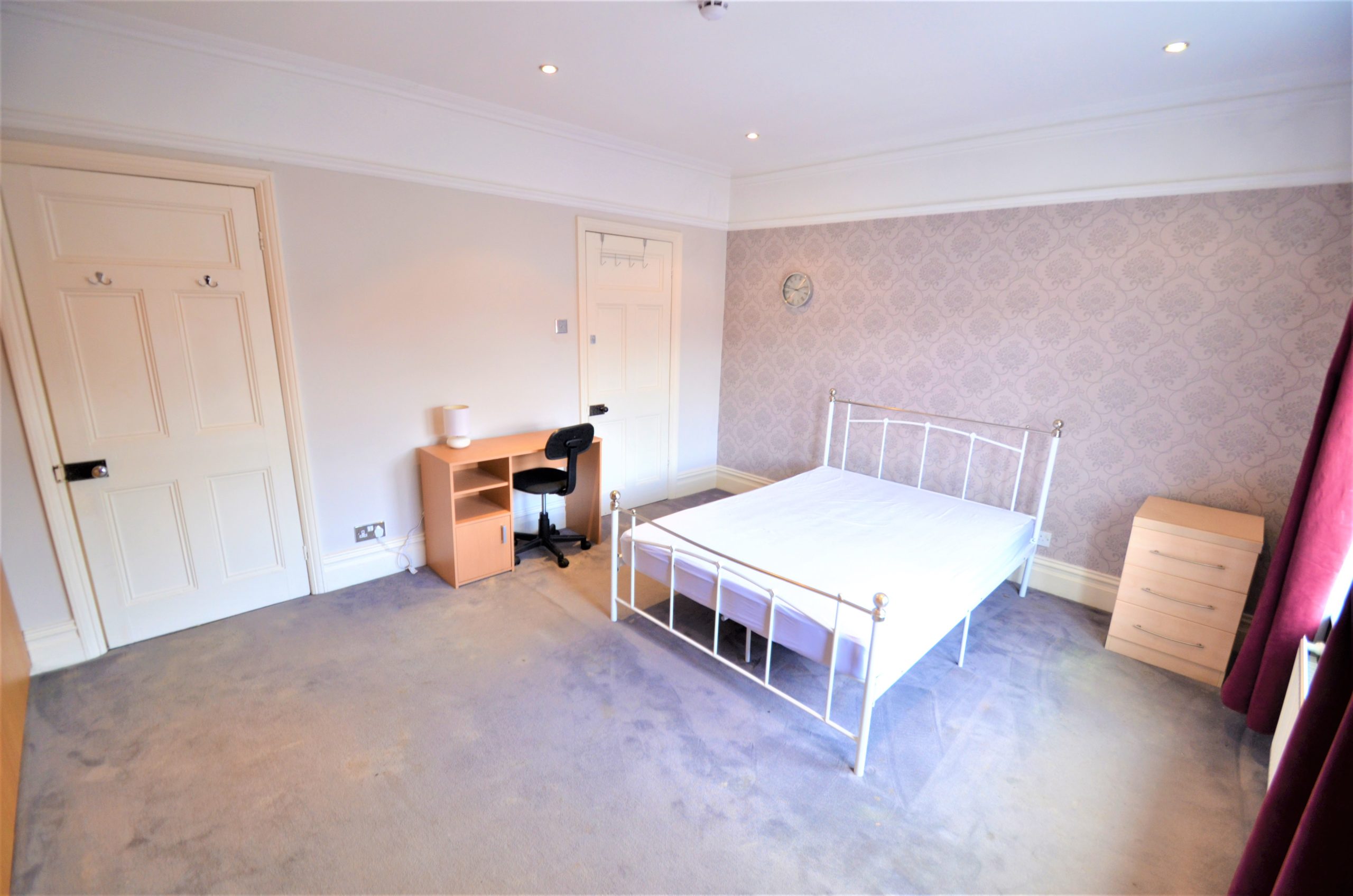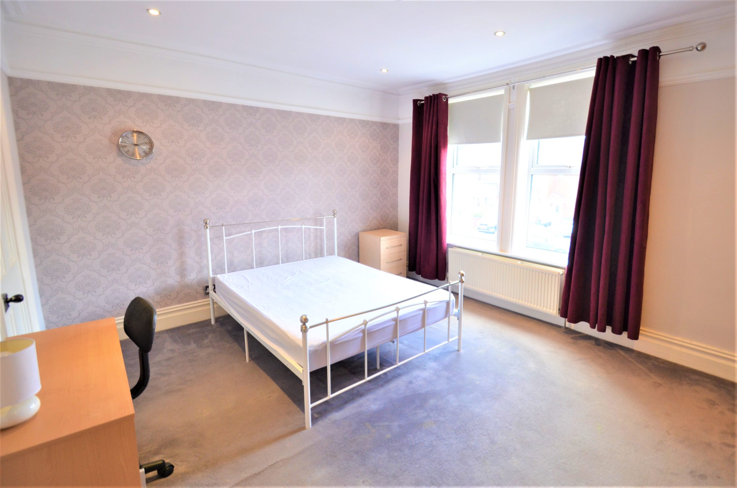 A large master bedroom with 2 large front aspect windows, large fitted wardrobes, spot lighting, central heating radiator and finished with a carpet. En-suite bathroom with shower cubicle, W/C and hand basin and chrome towel radiator.