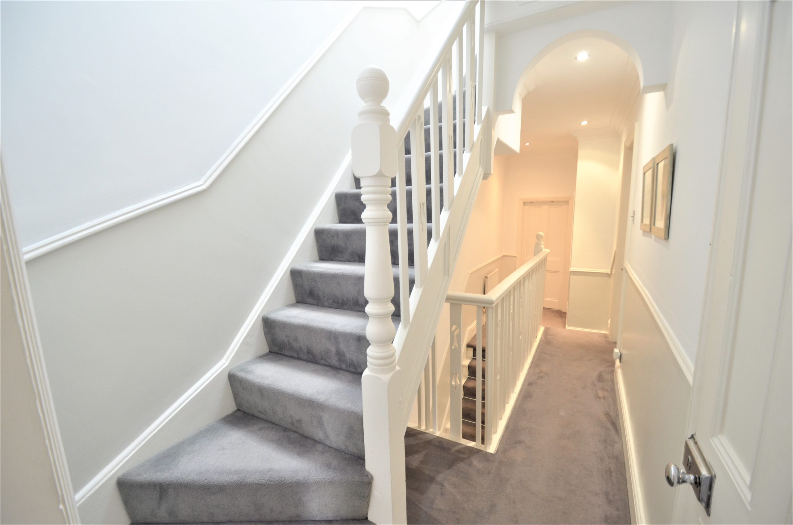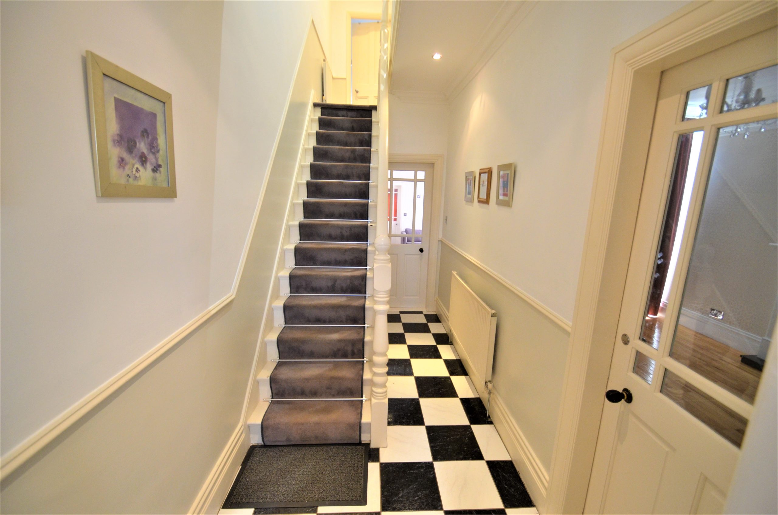A tastefully tiled entrance hallway offering access to the lounge, dining room and kitchen, stairs up to the first and second floor accommodation with carpet, under-stair storage, spotlighting and central heating radiator.