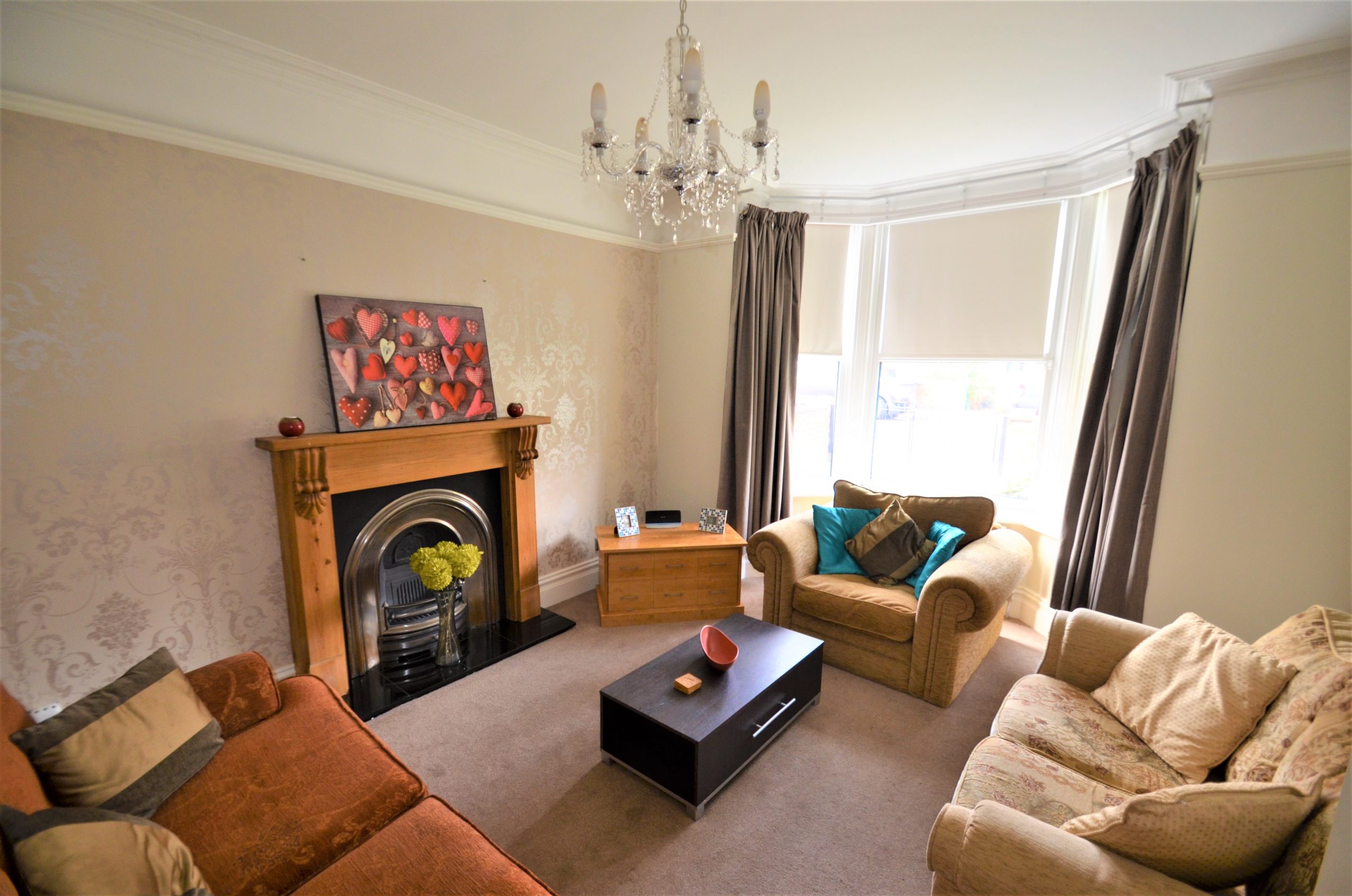 A spacious lounge with a large front aspect bay window, original feature fireplace with gas fire, pendant light fitting, central heating radiator and finished with carpet.