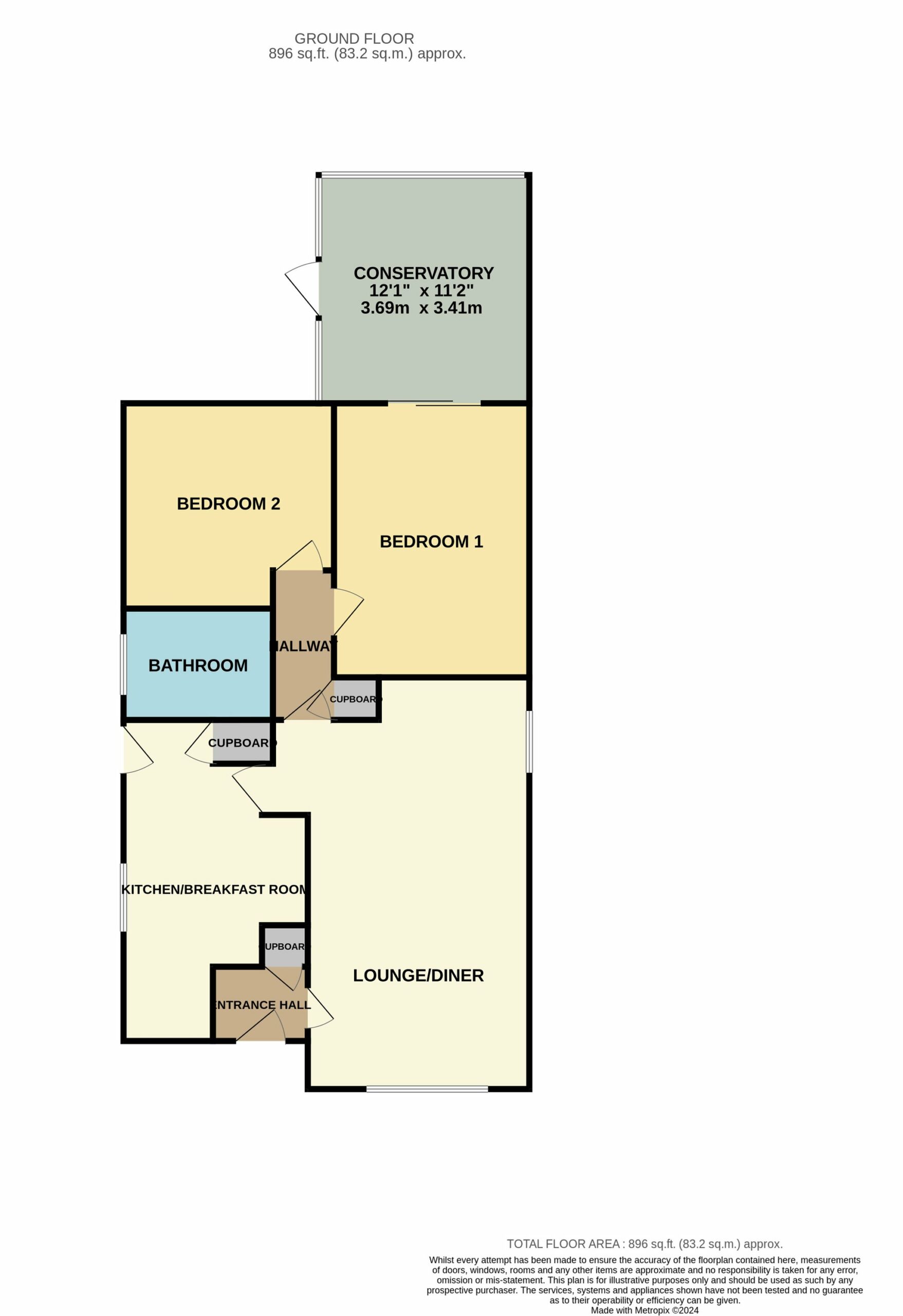 Bedroom 1 with rear aspect sliding door offering access into the conservatory, fitted cupboards and units, single pendant light fitting, central heating radiator and carpet to the floor.
