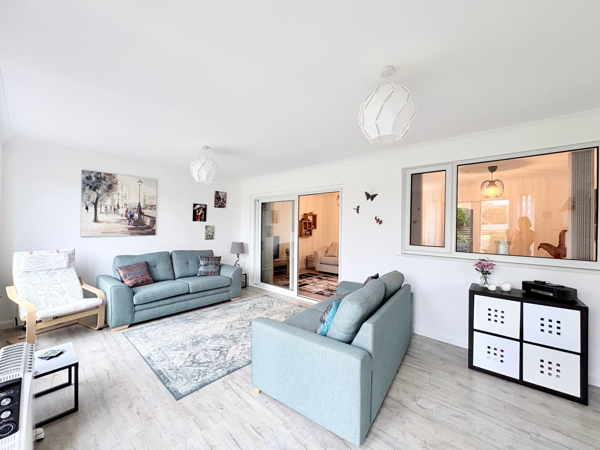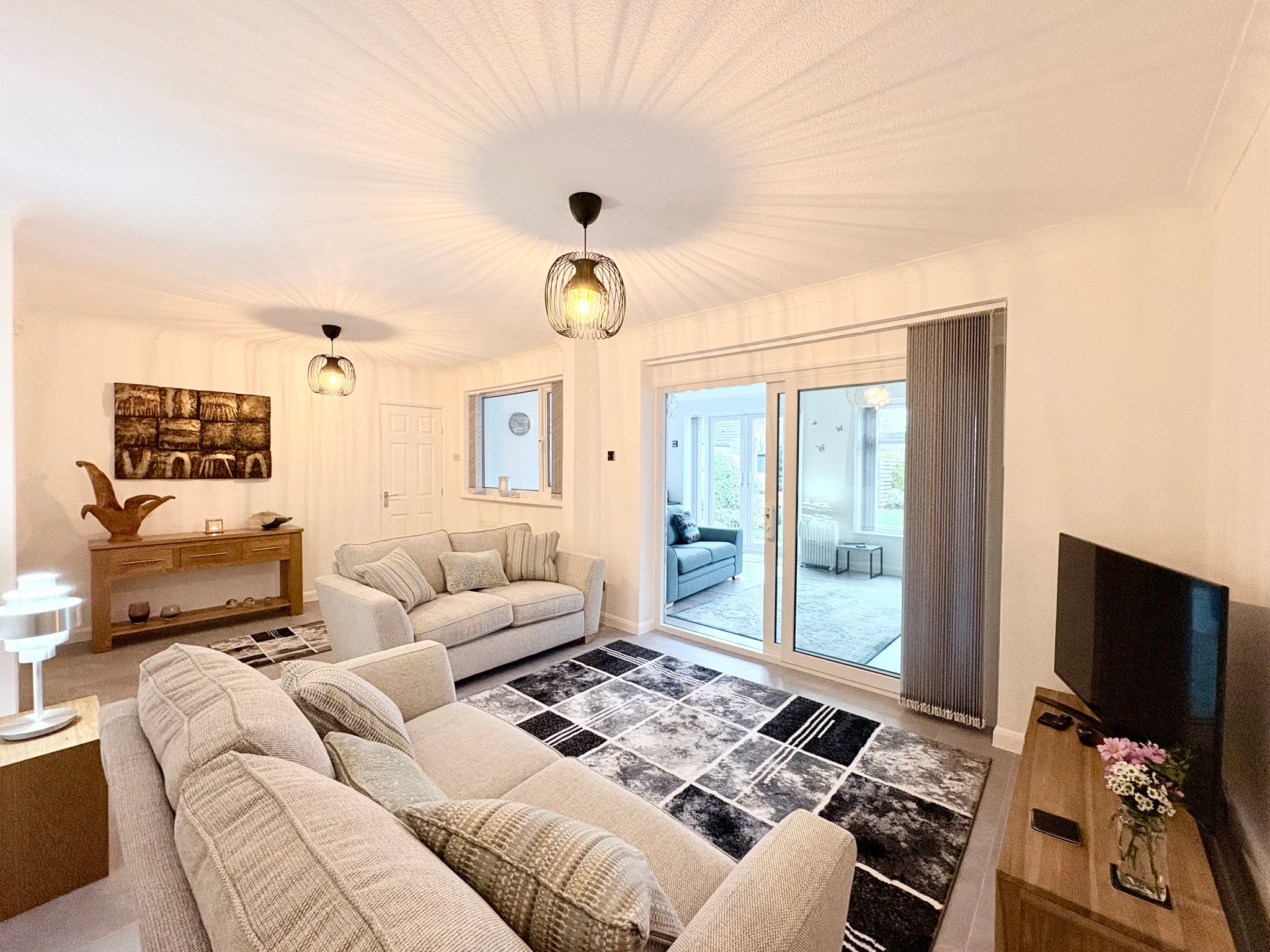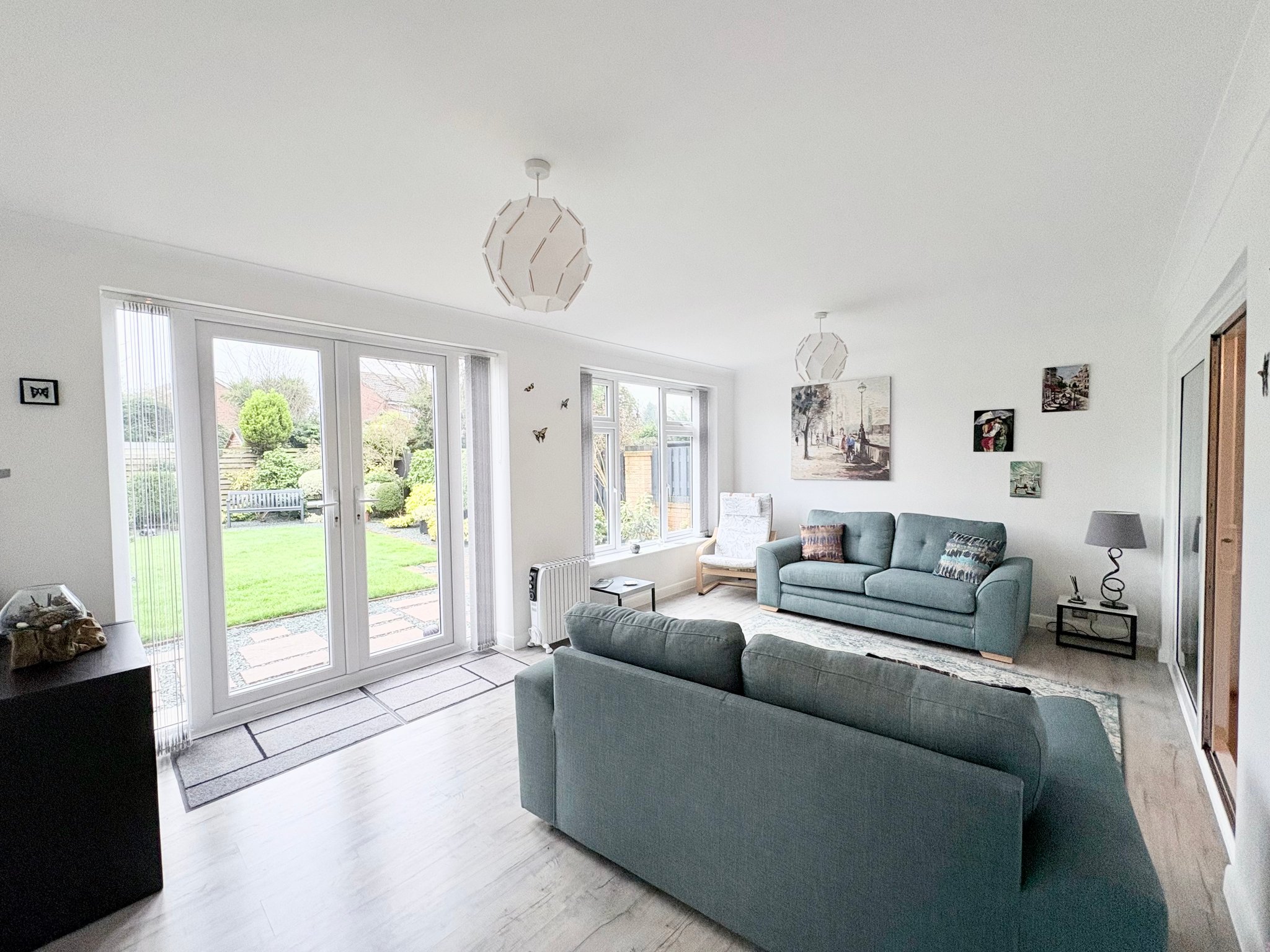 Lounge - Positioned to the rear of the property, the spacious main lounge is both comfortable and elegant. The tiled flooring continues from the hallway, enhancing the sense of flow, while pendant lighting and a radiator complete the room. Door leads through to the kitchen/dining room, and sliding doors open into the stunning garden room extension, allowing the living space to expand beautifully when entertaining.