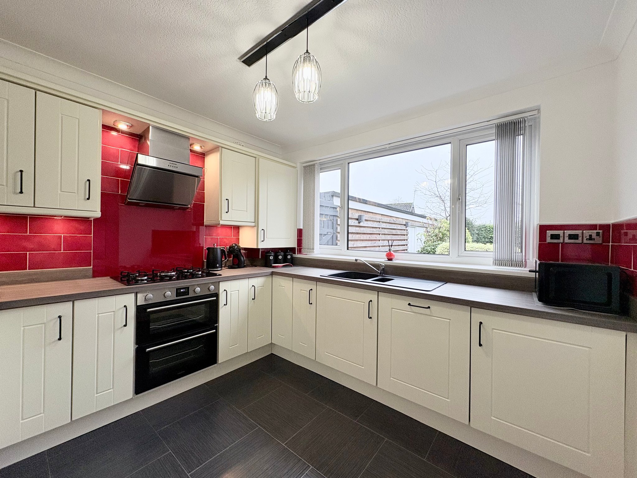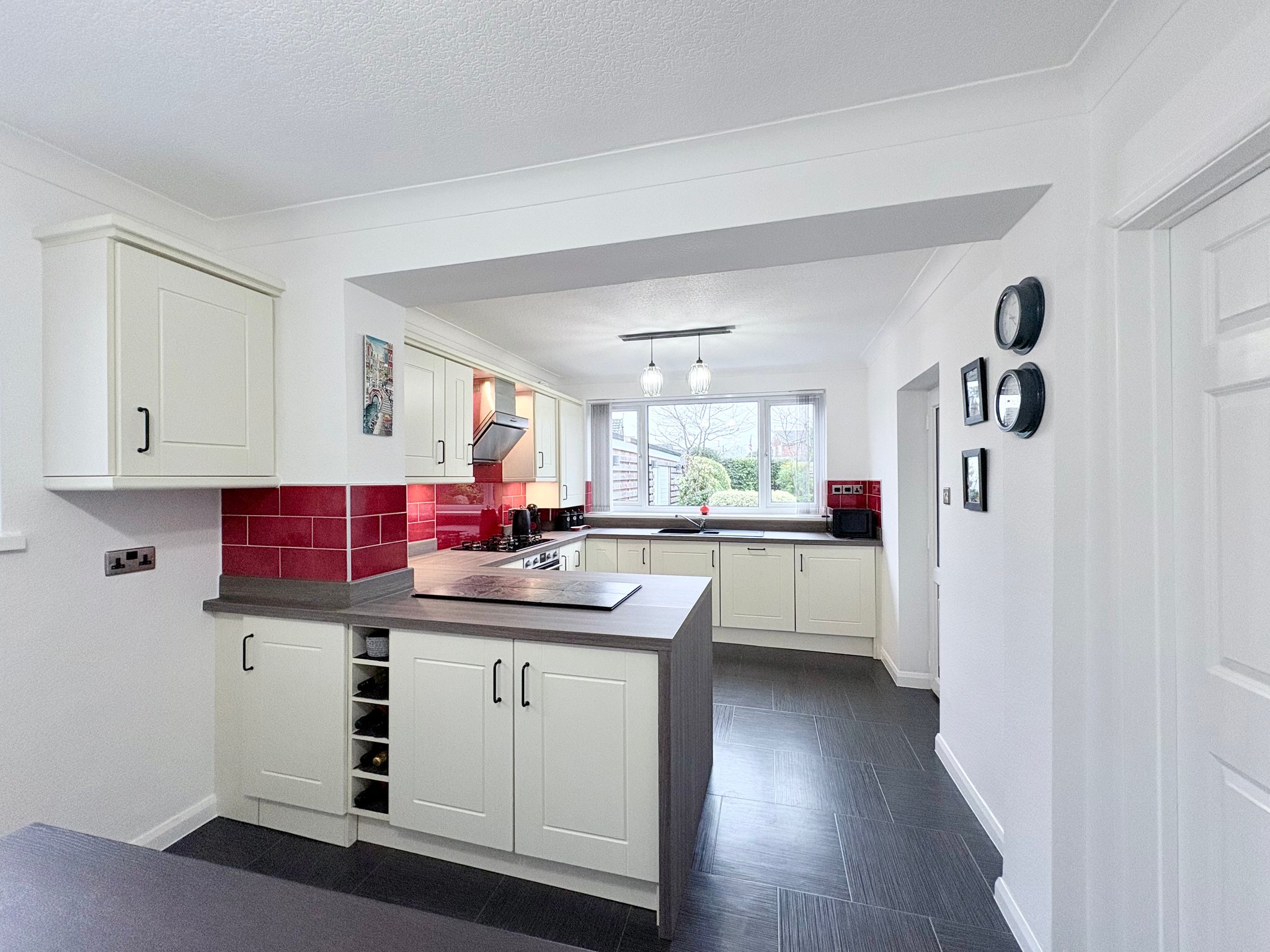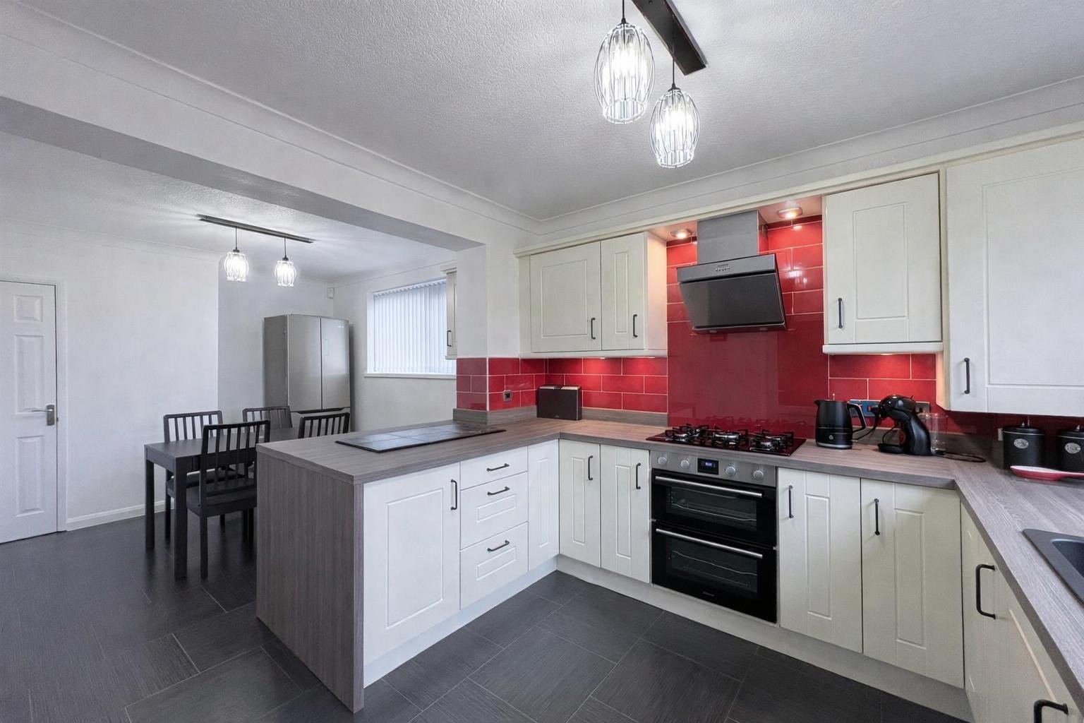Kitchen / Dining Room - Forming the heart of the home, the generous kitchen and dining area has been thoughtfully designed for both everyday family life and entertaining. The kitchen is fitted with cream shaker-style wall and base units, complemented by contrasting work surfaces and a central breakfast bar providing additional storage and informal seating. Integrated appliances include a double oven and grill, gas hob with extractor hood, dishwasher and washing machine. The space is finished with tiled flooring, spot lighting, radiator and pendant lighting.