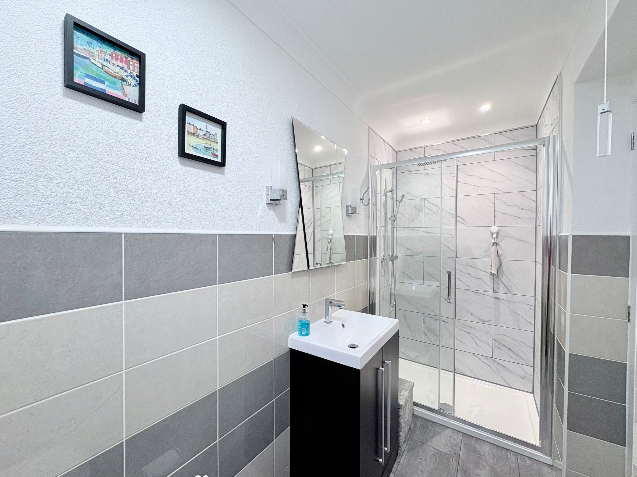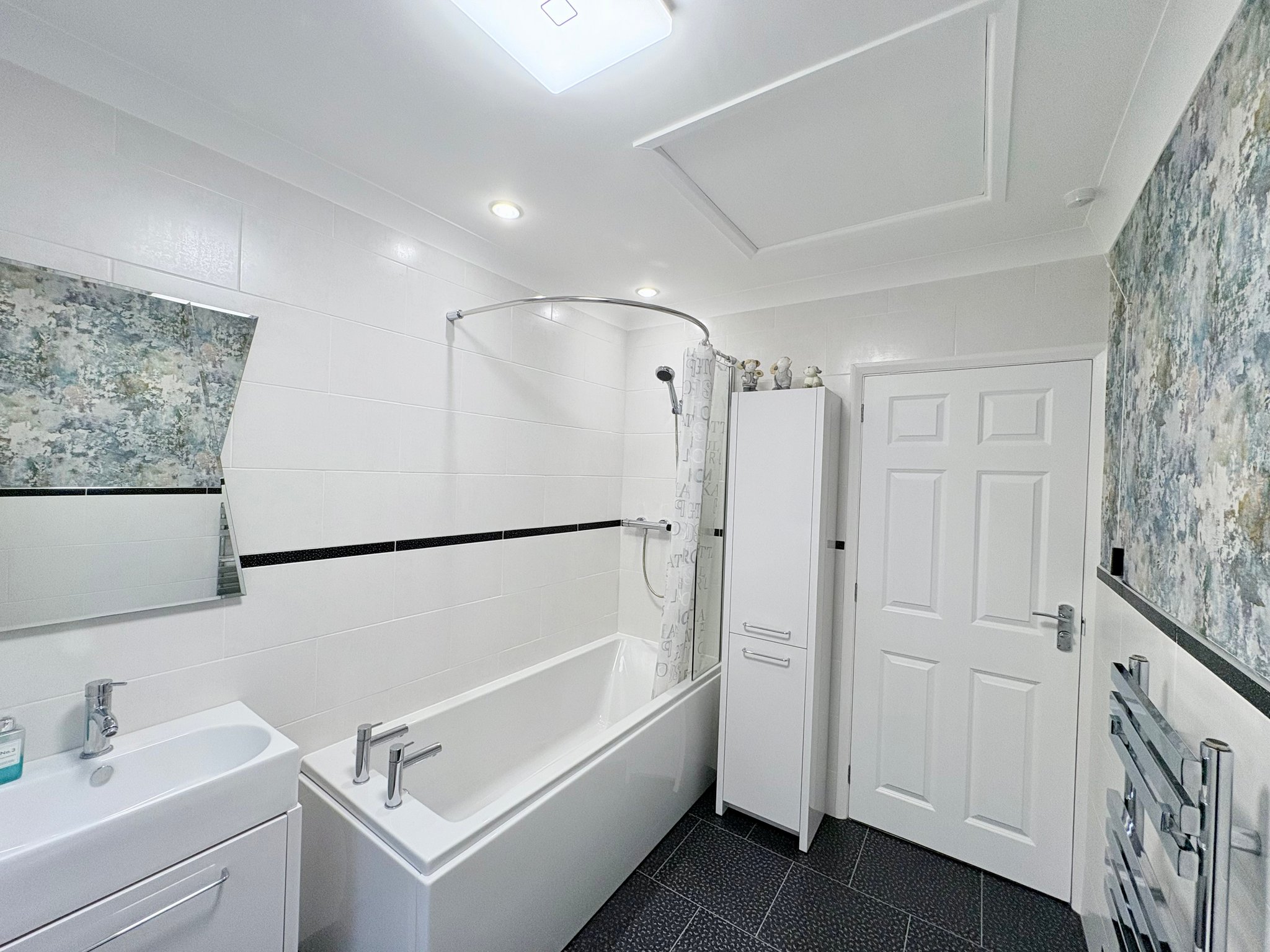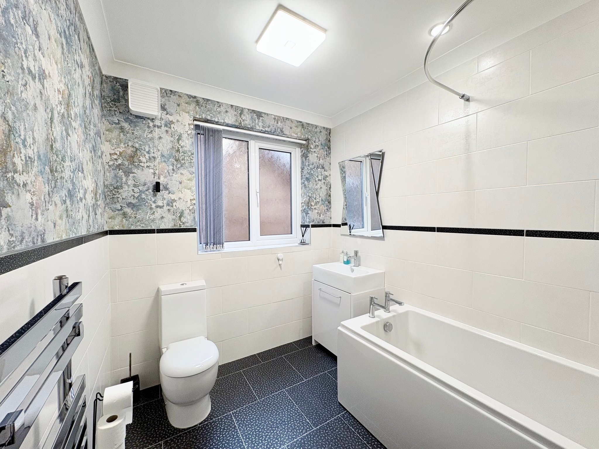 The family bathroom is finished to a high standard, comprising a white suite including bath with shower over, hand basin with vanity unit beneath and WC. The room benefits from tiled flooring, mainly tiled walls, heated towel rail, side aspect window and pendant lighting.