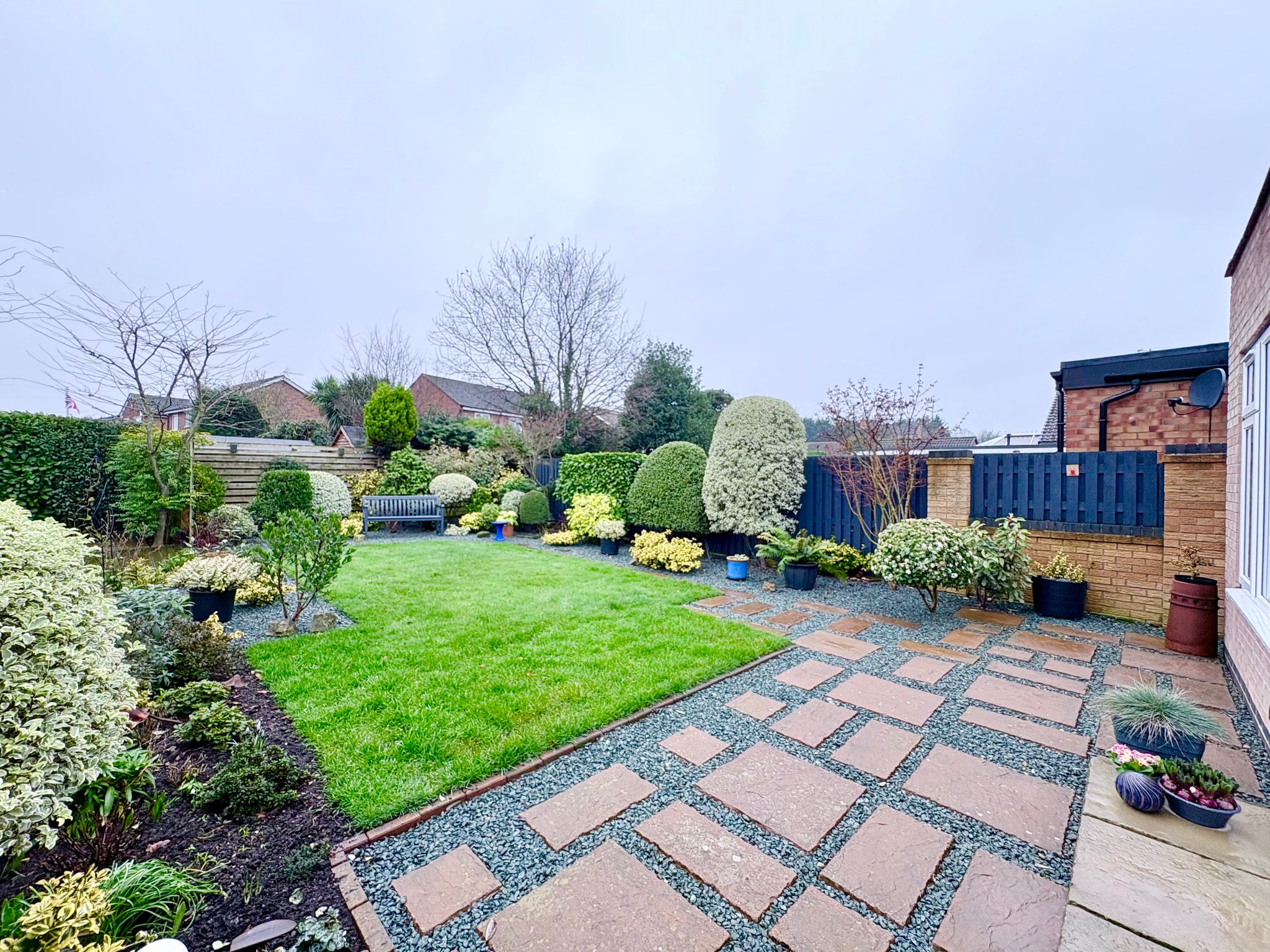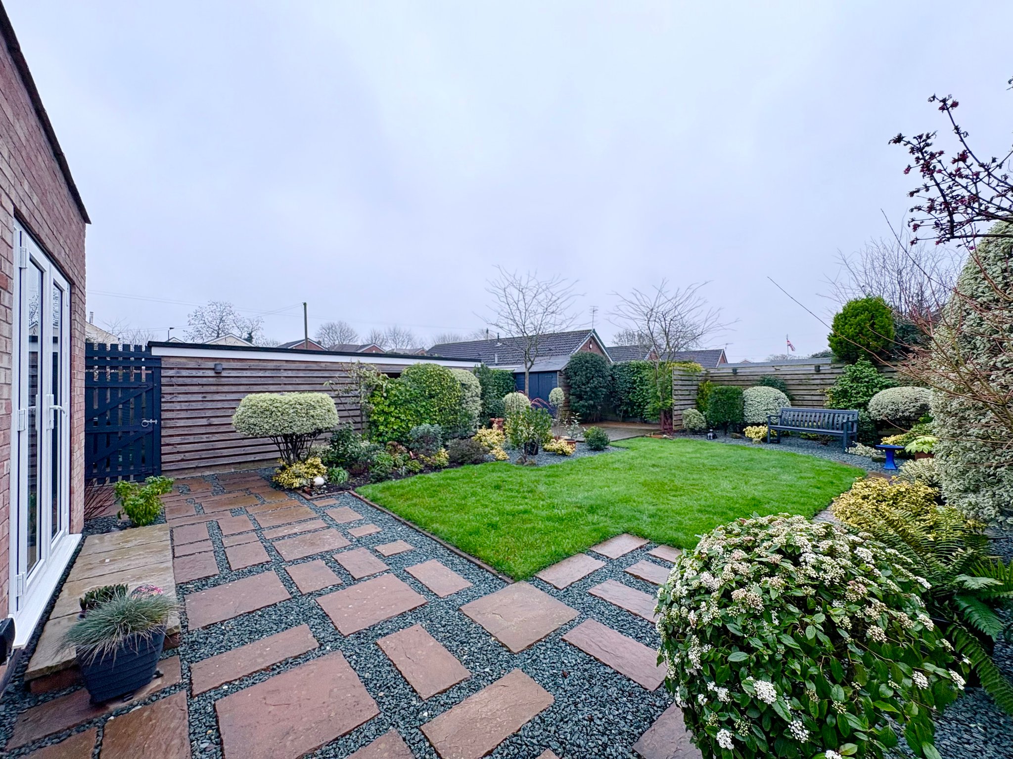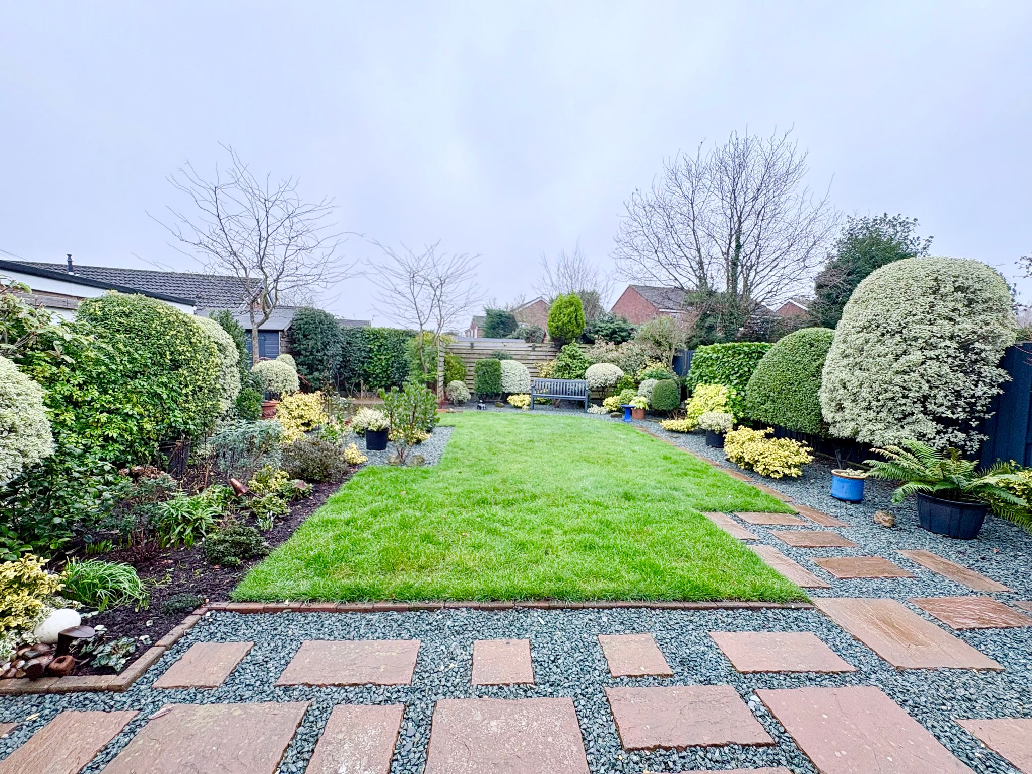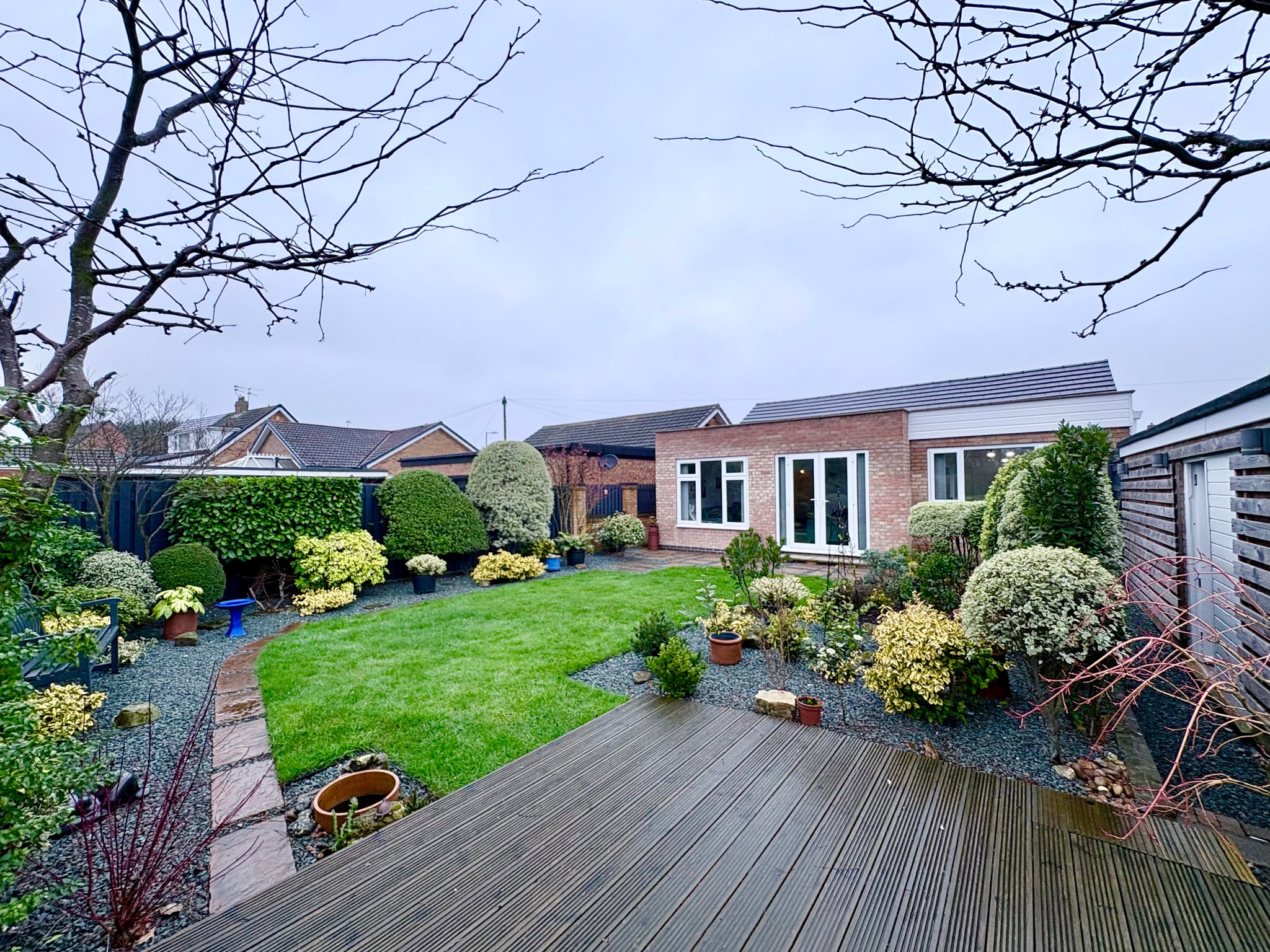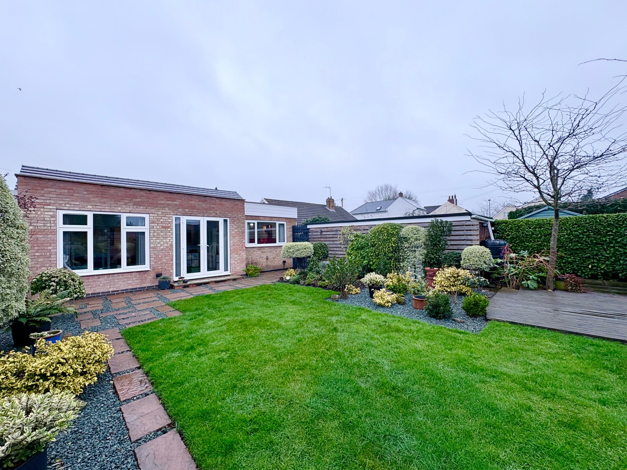 The property sits on a generous plot with a front garden and block-paved driveway providing off-road parking for up to three vehicles. To the rear lies a beautifully maintained south-facing garden, a true feature of this home. The garden enjoys a large lawned area bordered by mature planting, small trees and shrubs, creating a private and tranquil setting. There are two separate patio areas, ideal for outdoor dining and entertaining, along with a decked seating area perfectly positioned to enjoy the sun throughout the day. A useful garden shed provides additional storage.