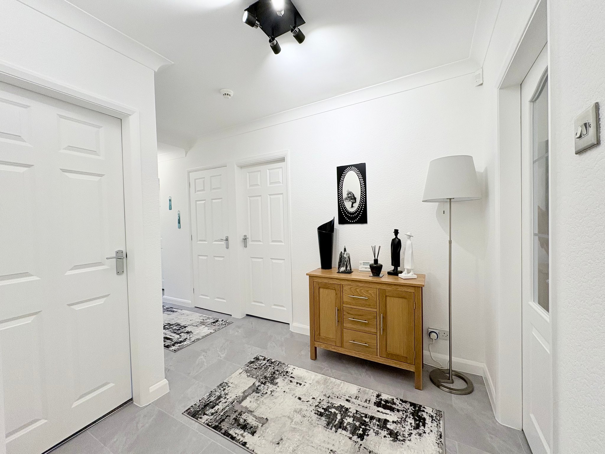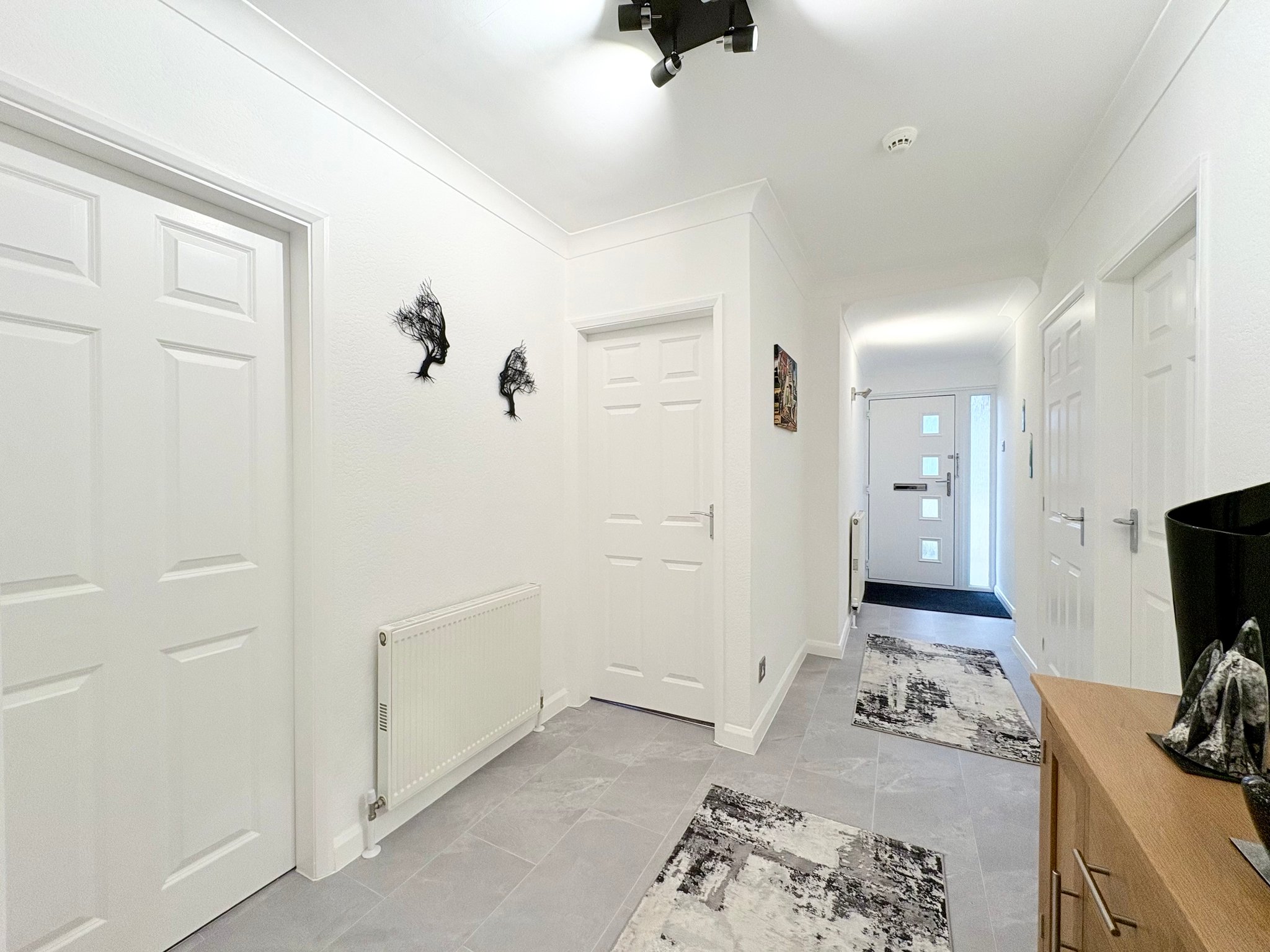 Entrance Hall - A welcoming and stylish entrance hall immediately sets the tone for the home. Finished with an attractive tiled floor that flows seamlessly through to the lounge, the space also features ceiling pendant lighting, wall lights, radiator and a large built-in storage cupboard ideal for coats and shoes. From here, access is provided to the principal reception space, all three bedrooms and the family bathroom.