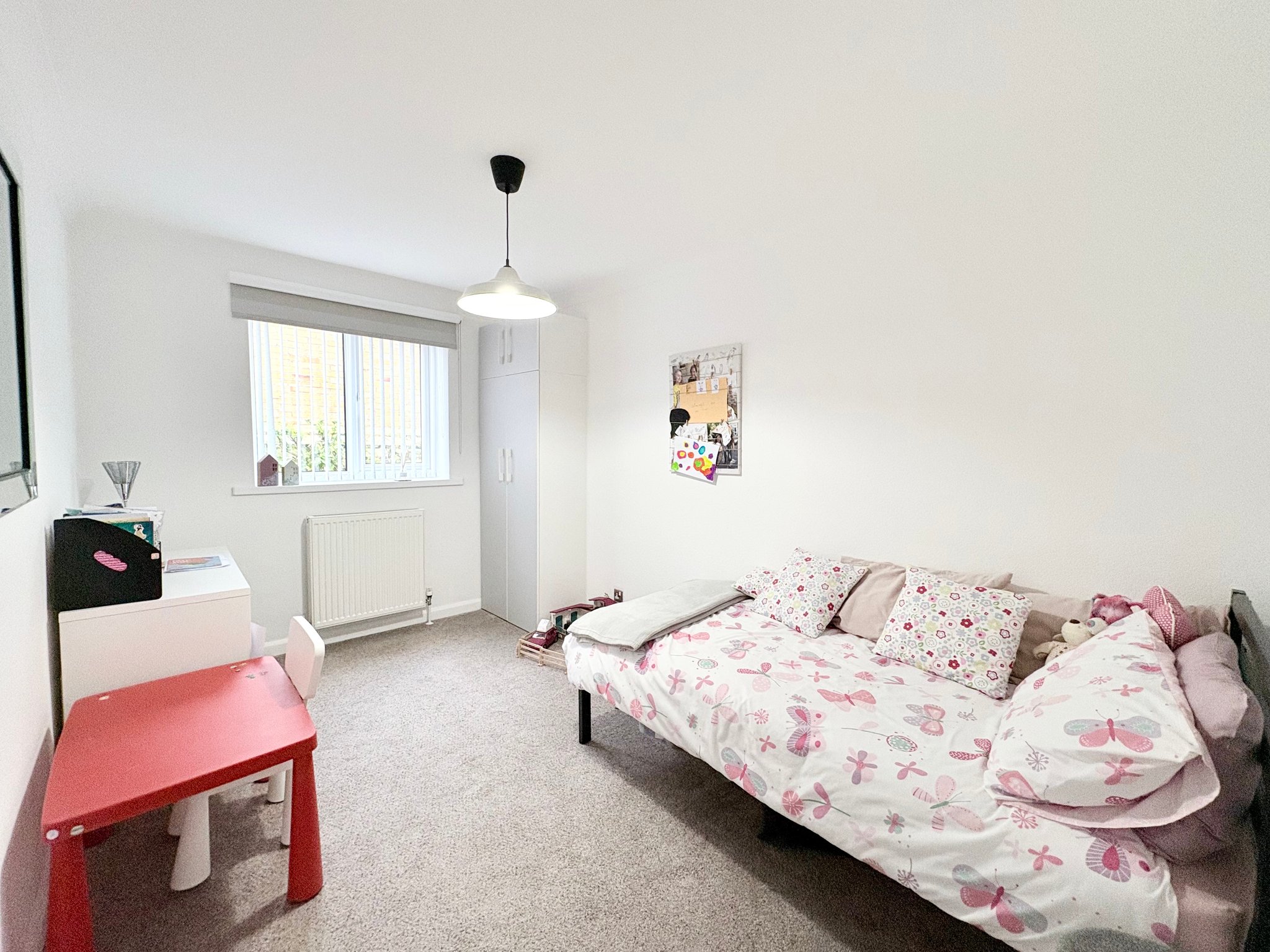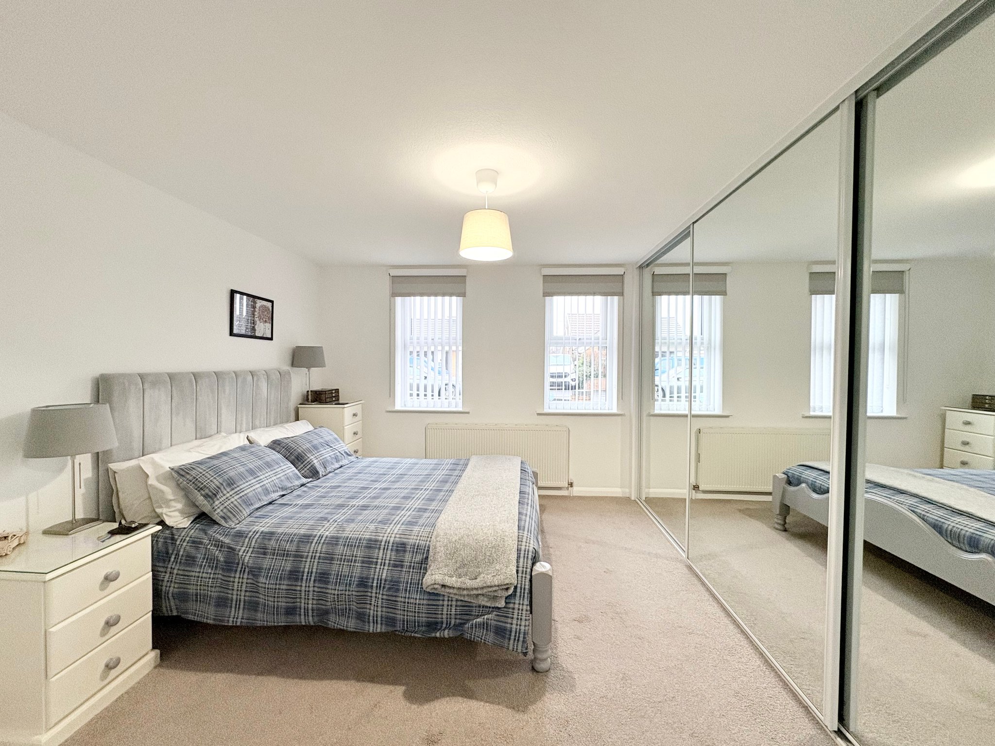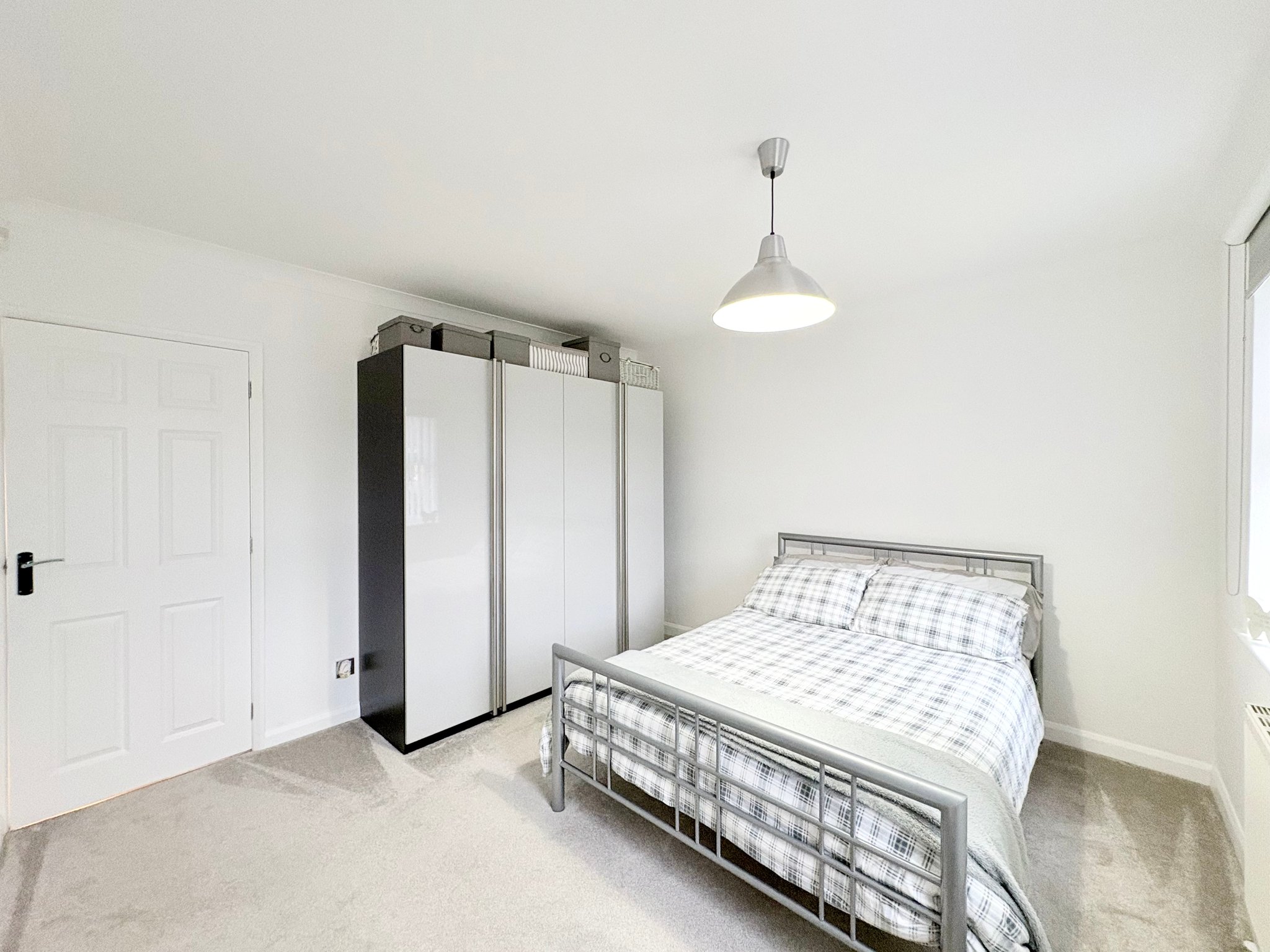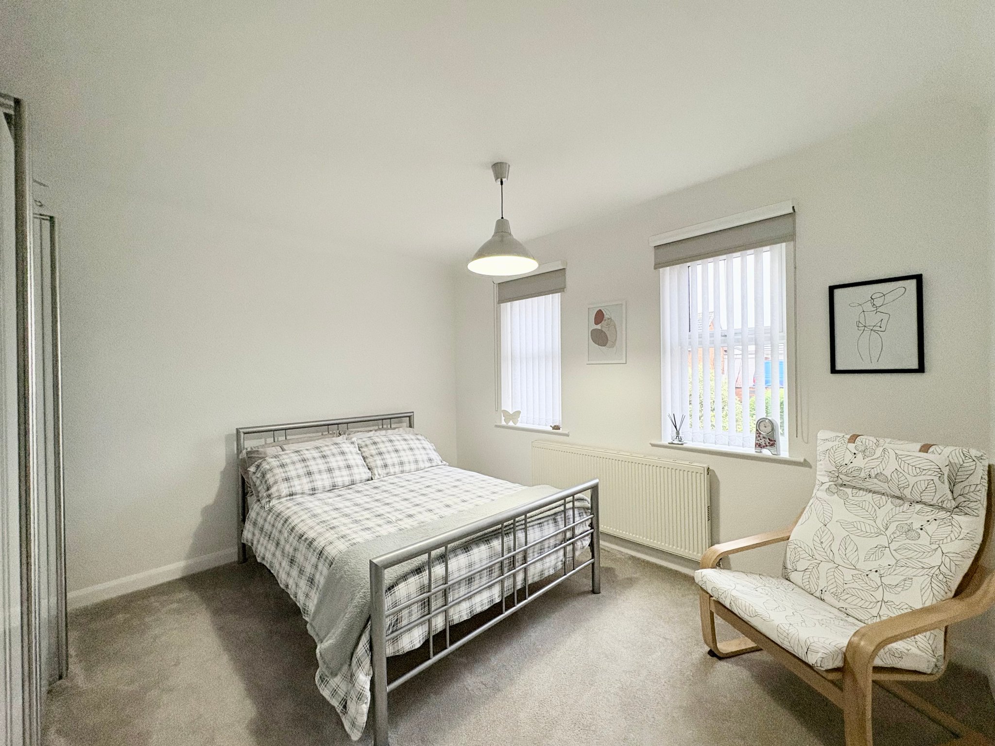 Bedroom Two is another spacious double room with front aspect window, carpeted flooring, radiator and pendant lighting.