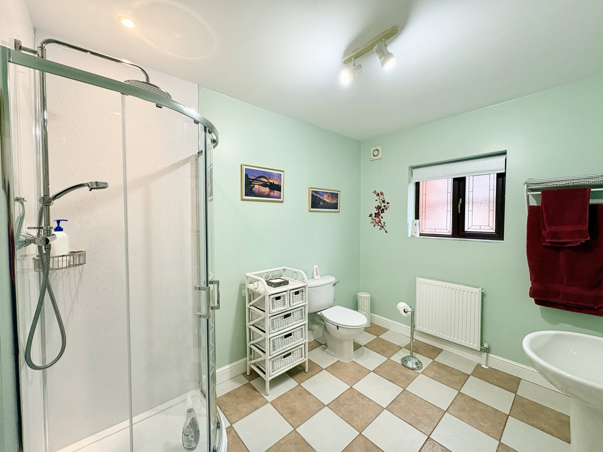 The spacious family bathroom is part tiled and fitted with a white suite comprising a bath, walk-in shower, hand basin and WC. Finished with tiled flooring, rear-aspect obscure window, heated towel rail and single pendant light fitting.