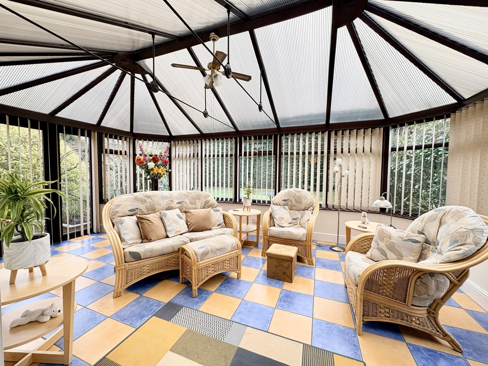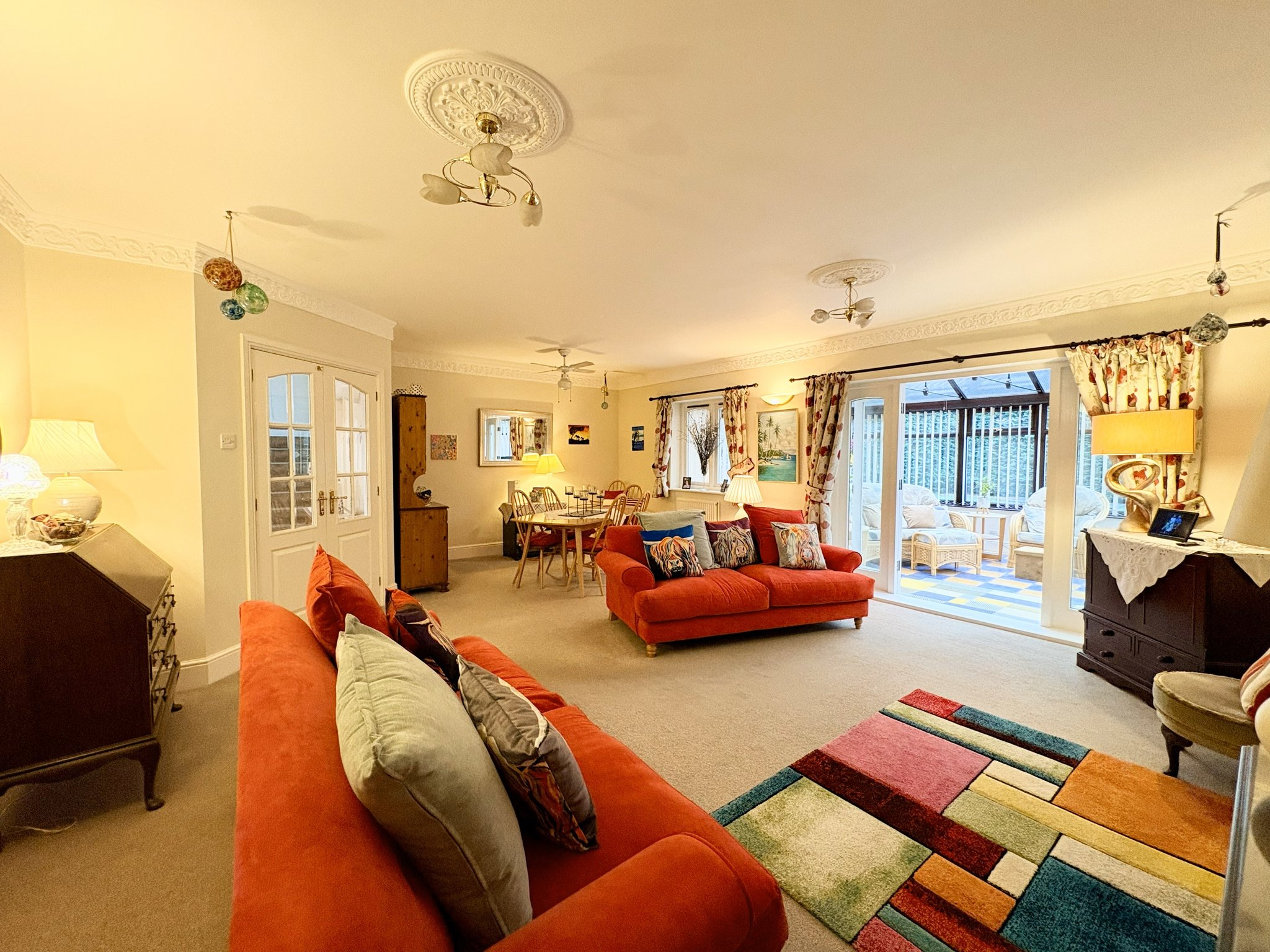 The large conservatory is well maintained and bright, offering a great place to enjoy the garden view, with tiled flooring, radiator, single pendant fan light fitting and French doors opening onto the garden.