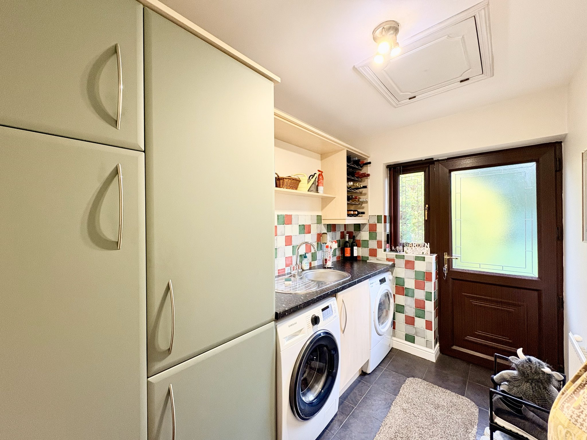 The utility room features tiled flooring, additional matching wall and base units, integrated fridge and freezer, single bowl sink with drainer, plumbing for a washing machine and dryer, radiator and door providing access to the garden.
