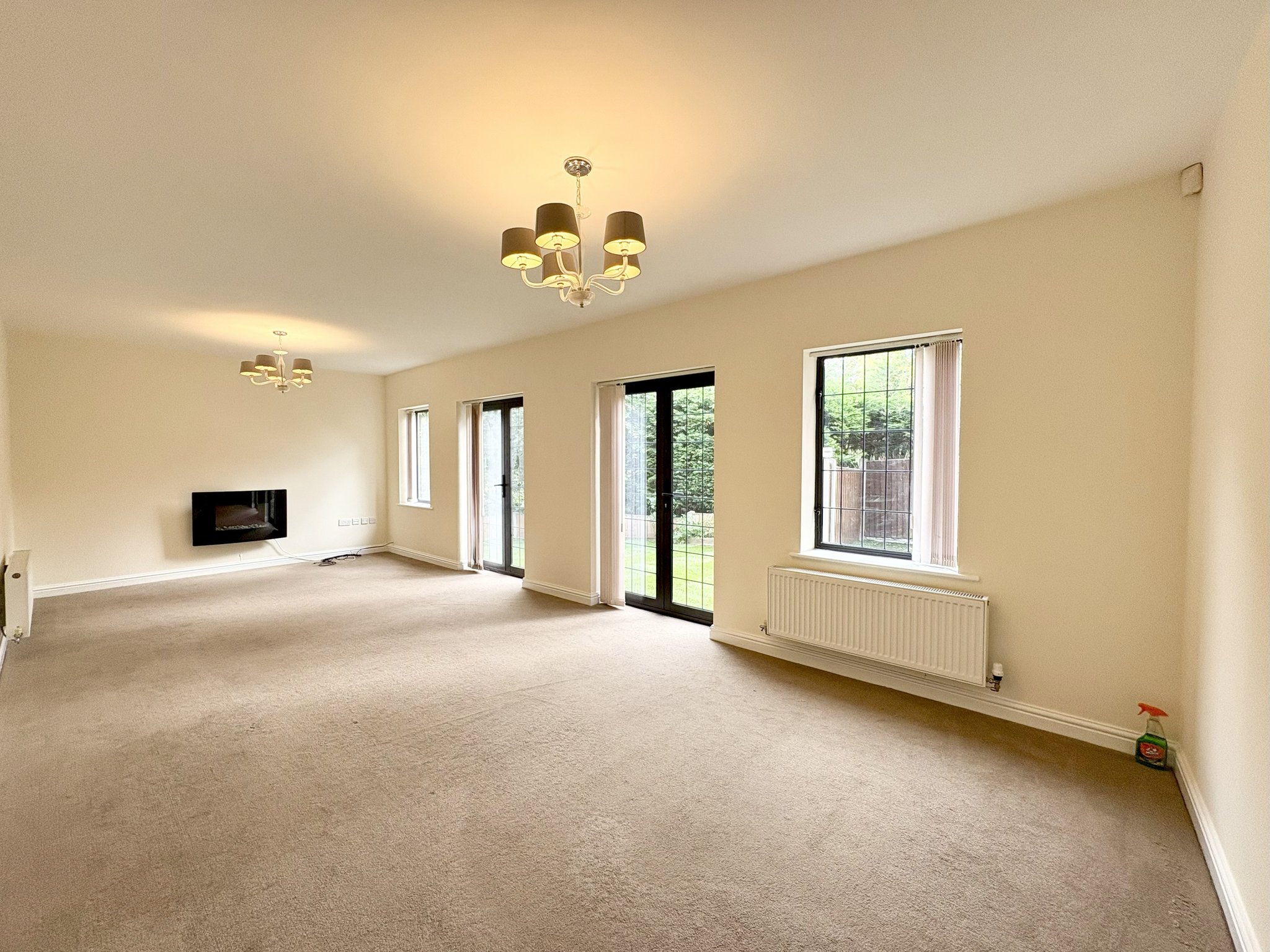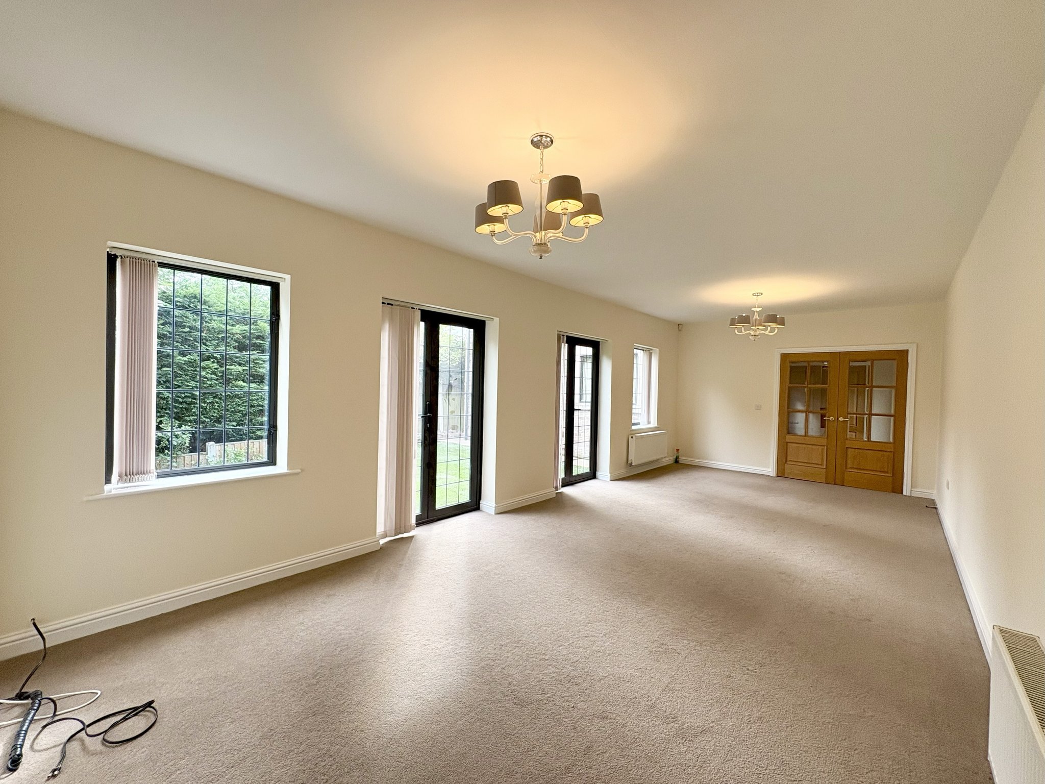 A spacious and bright rear lounge with side aspect window and French doors leading to rear garden, finished with fitted carpet to floor, 2 single pendant light fittings and 2 central heating radiators.