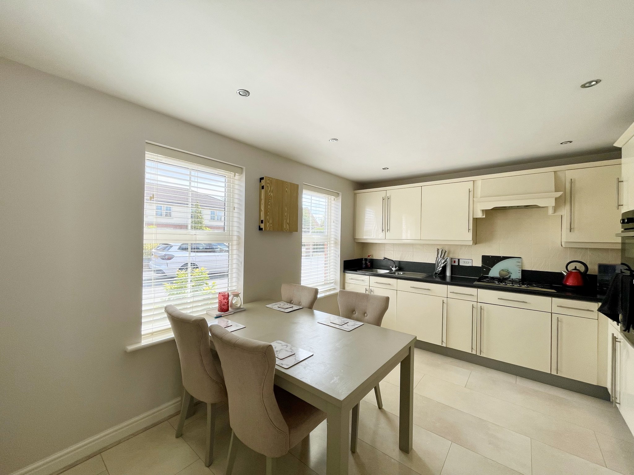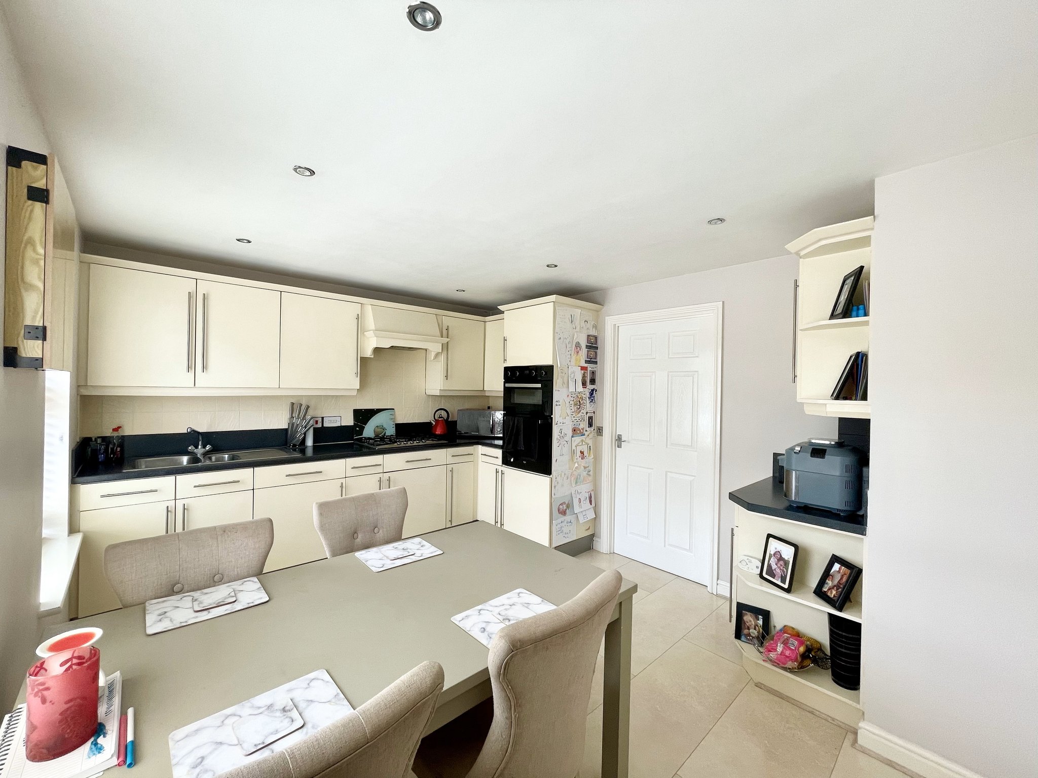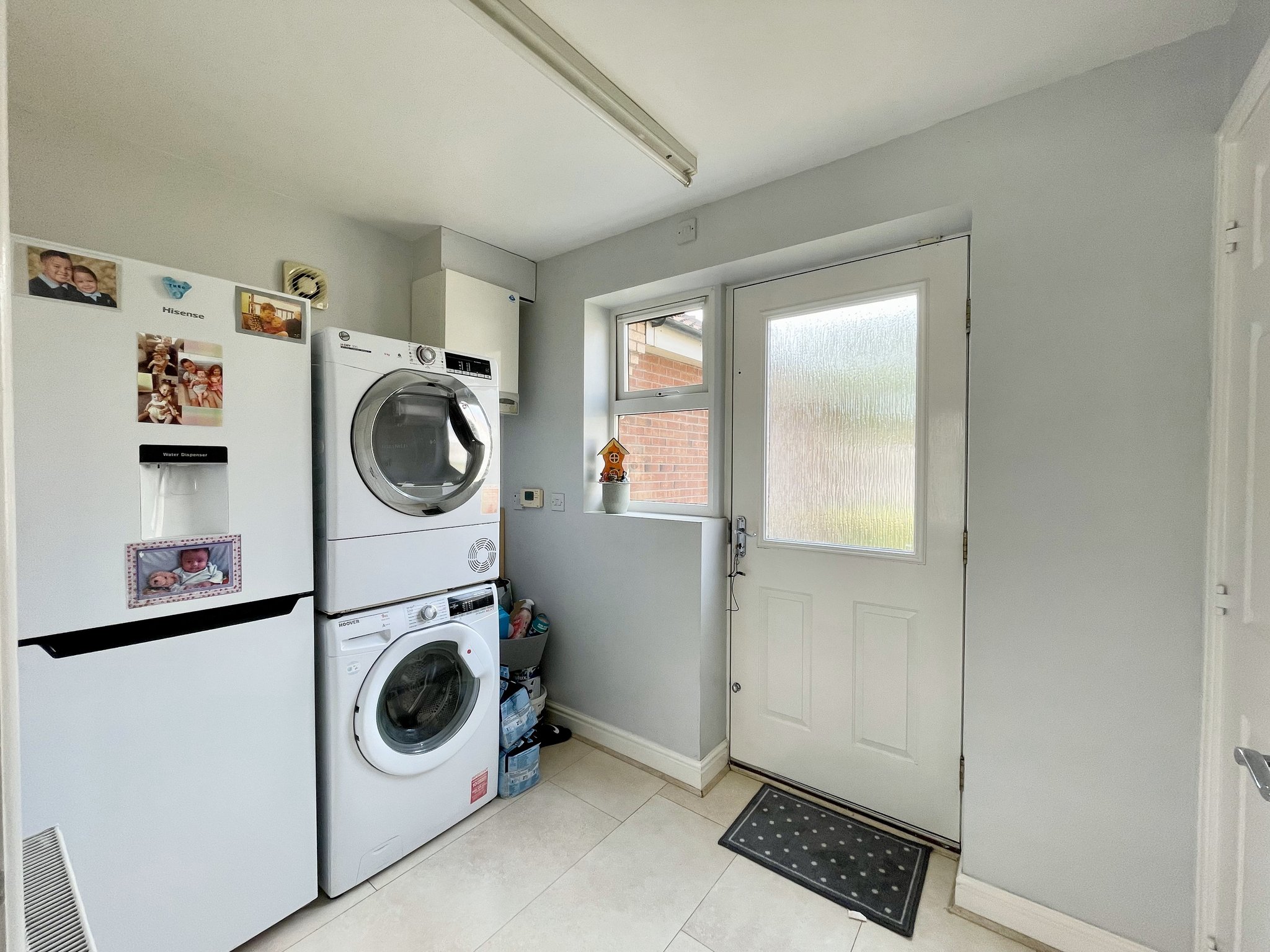A modern and well-equipped front aspect kitchen sits at the heart of the home, complete with integrated appliances including dishwasher, oven, hob and extractor, contemporary spotlighting, and access to a separate utility room for added convenience. The kitchen also connects directly to the garden, making it ideal for both family routines and entertaining. With laminate tiled flooring and radiator.
