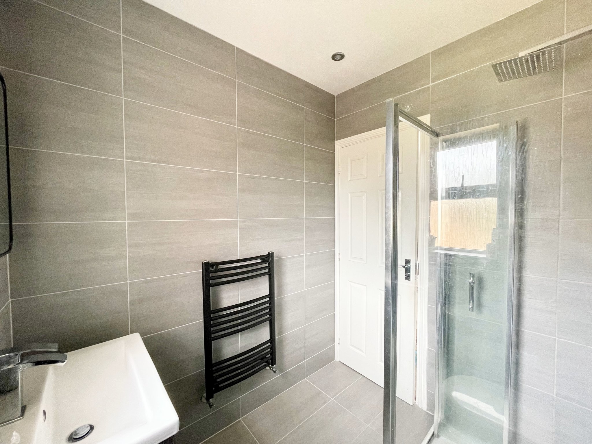 The ensuite is fully tiled with walk in shower, hand basin with drawers underneath and wc. Spot lighting and heated towel rail.