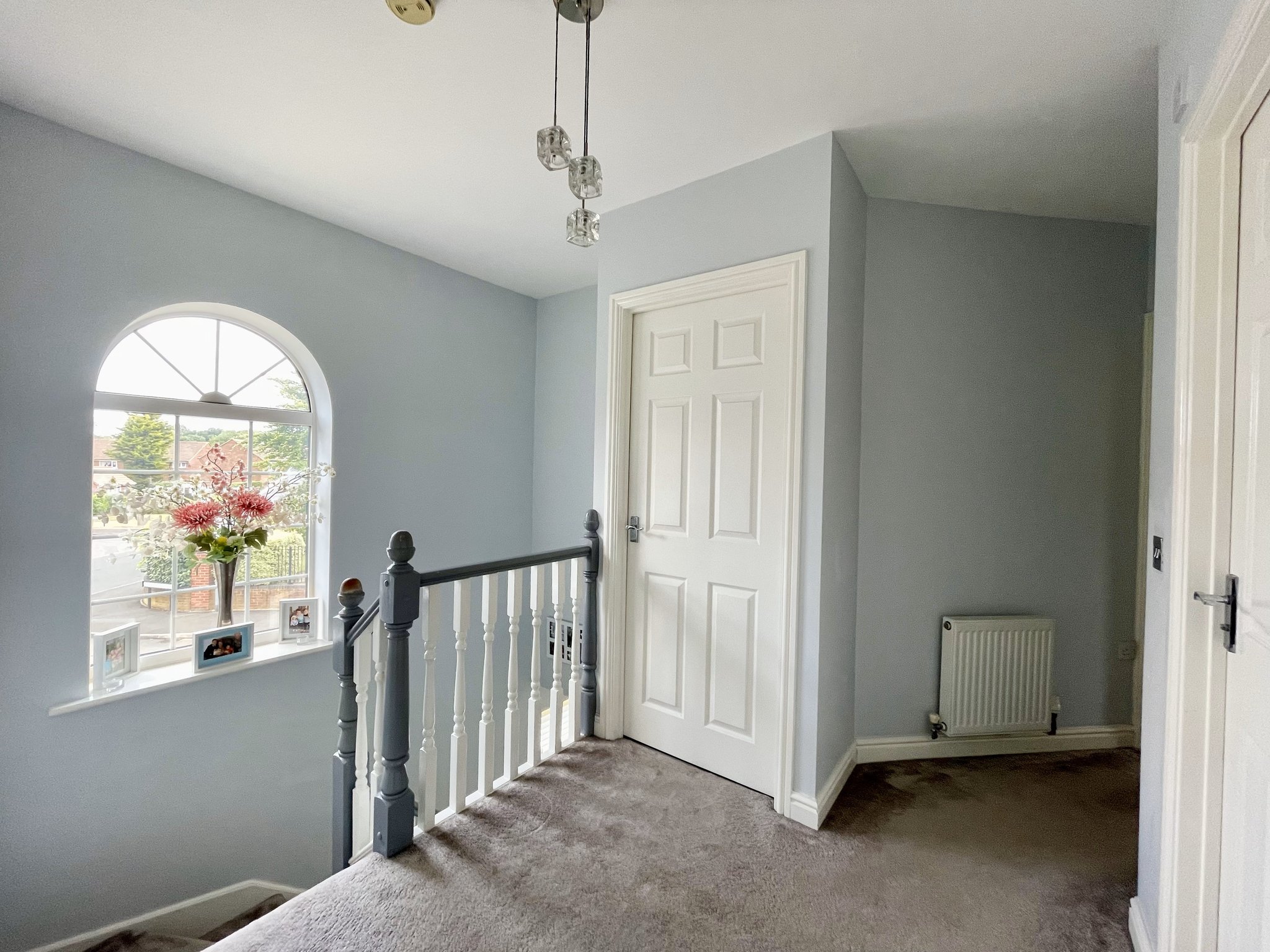 Stairs from the hallway lead up to a generous landing, where a front-facing window fills the space with natural light, enhancing the sense of openness and flow throughout the home. The landing is fitted with carpet, has a single pendant light fitting and benefits from a storage cupboard.